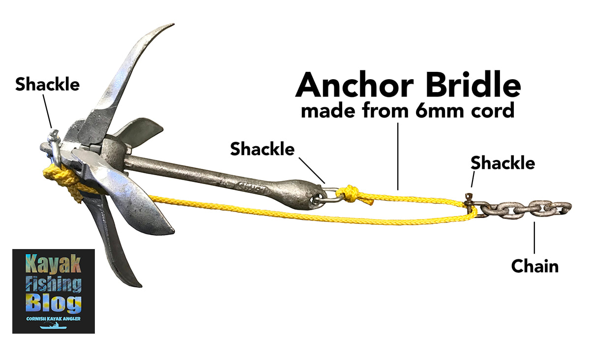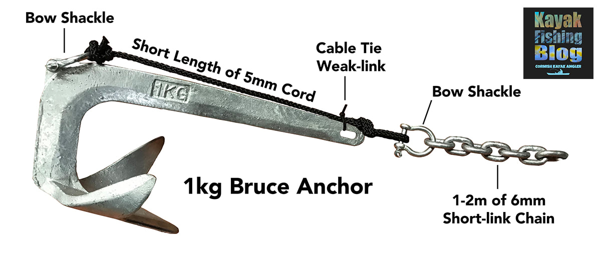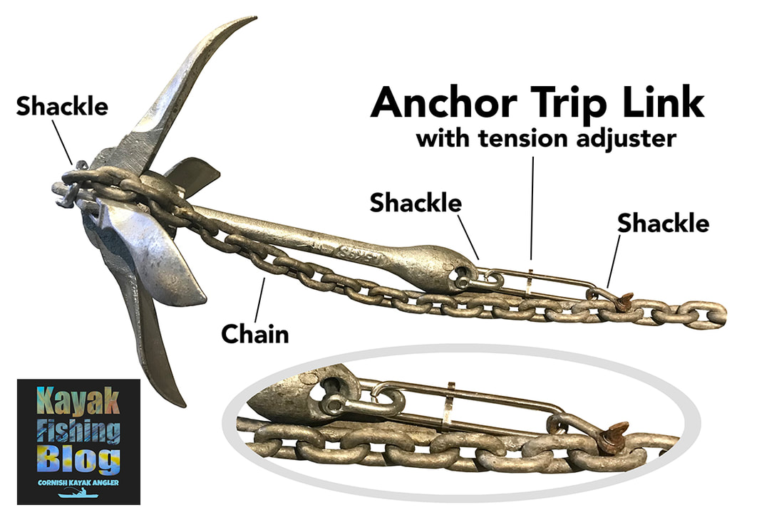 Mud Anchors Popular with still-water and freshwater anglers, these are essentially heavy weights that are heavy enough sink into soft mud often found on lake beds, ponds, canals and reservoirs. In calm conditions, their weight alone is enough to hold a kayak steady on harder ground. They can also be used in shallow saltwater in areas of low flow and are particularly useful over very rough ground as they don't often snag. You can buy mud anchors and popular types are Mushroom Anchors (3.6kg / 8lb weight works well for kayaks) and Pyramid Anchors. Many people make their own mud anchors. A small house brick with a hole drilled through the middle to attach a loop of cord works fine - onto this you can attach your anchor cord. You can also fill a small flowerpot with concrete, and allowing it to set with a metal ring or shackle poking out the top to attach your anchor line too. Stake-Out Poles On shallow flat-waters it is possible to use a stake-out pole to anchor a kayak. This is a long pole, made usually from fibreglass, that literally sticks into the bottom to hold the kayak still. This only works on calm waters with soft sediment bottoms that the pole can stick down into. Most stake-out poles are less than 12ft in length so you can only realistically use these in depths of up to 12ft. Stake-Out Poles are therefore useful for shallow lakes or lake margins, canals, back waters, skinny waters and other shallow areas. They are quick and easy to deploy - just push the pole down firmly into the bottom sediment and then tie off to the pole via your anchor trolley. You can also just stick the pole down through a scupper hole too. A popular Stake-Out Pole is the Yak Attack Park-N-Pole which is available in standard 6ft or 8ft options, or opt for the Park-N-Pole Link which allows you to add additional 4ft sections to extend the length of the pole. For those regularly fishing the shallows then the Power-Pole Micro Anchor offers the best anchoring option - this is a stake-out pole that features a motor to raise and lower the pole all at the push of a button! Anchor Chain For KayaksYou can greatly improve the holding power of your anchor by adding a length of chain above the anchor. The chain will not only add extra weight to the anchor to keep it pinned down to the bottom but it will also help buffer against the movement of the kayak against the anchor - this will reduce the chance of it slipping it's hold especially in choppy waters. Using chain is alsmot essential with folding grapnel anchors and bruce anchors, but are not needed with mud anchors for still-water fishing. Use 6mm short link galvanised chain for your anchor- this chain offers plenty of weight (around 0.7kg per meter) for it's length. How Much Anchor Chain Do I Need? Add around 1 meter of chain for general conditions, depths up to 100ft and moderate tidal flows / currents up to around 1.0 knot. Add around 2 meters of chain for more challenging conditions, deeper waters >100ft and tides over 1.0 knot. You can simply attach the chain to the top eye on the anchor using a shackle or karabiner, however you may want to consider an anti-snag set up... Anti-Snag Anchor Set UpsGetting your anchor snagged on a kayak is no fun at all and makes the chance of capsize much more realistic. Pulling your anchor warp under lots of tension against a snagged anchor can make you unstable on your kayak, especially if it is choppy. If you are unable to free the anchor the only option would be to cut the anchor warp. Losing your anchor and chain setup can be costly! Luckily there are several methods to 'un-snag' a snagged anchor and they all work on the principle of pulling the anchor out of the snag backwards in attempt to free it. Anchor Weak-Link Method This is where the chain is held to the top eye of the anchor using a weak-link such as a small 2mm cable tie. When at anchor the force runs parallel with the anchor/chain and puts very little, if any, stress on the cable tie. If snagged, the idea is to paddle or pedal up-tide / up-flow of the snagged anchor. This changes the angle of the chain against the anchor and any force applied will be against the cable tie. With a few sharp tugs the cable tie will hopefully snap and allow the anchor to be pulled backwards from the snag. Simple, easy, cheap and the most popular method of setting up an anti-snag anchor for kayak fishing. Cable-Tie Weak Link on a Folding Grapnel Anchor - attach the chain to the bottom eye on the anchor using a shackle. Run the chain up the anchor to the top eye and attach the closest link to the eye with a small cable tie. Cable-Tie Weak Link on a Bruce Anchor - I have found that the chain is best attached at the very top of the Bruce anchor, with a short length of cord used between the chain and the base of the anchor. I found the anchor to have a much better bite rate with bottom with the full weight of the chain above the anchor. A small cable tie can then be used between the cord and the top eye on the anchor. I have had a good success rate with the weak-link method and it works about 80-90% of the time. Some snags are just unforgiving and you have to suck up a loss... Poseidon’s Tax! Anchor Trip-Link Method Specialist anchor trip links can be brought (via eBay search ‘kayak anchor trip link’), with adjustable tension settings to make the anchor ‘trip’ when a given force is applied. This is set up between a shackle on the top of the anchor and a shackle on the chain. It has to be set up in such a way that the force of anchoring is applied to the trip link itself. The sliding tensioner then needs to be set so that it won't trip when at anchor but will when you pull hard against a snagged anchor. This can take some experimenting but works really well when set correctly. Anchor Bridle Method Another method sometimes used is to tie a short length of slack cord between the top and bottom eyelets of the anchor, a so-called anchor bridle. You then simply attach your anchor chain