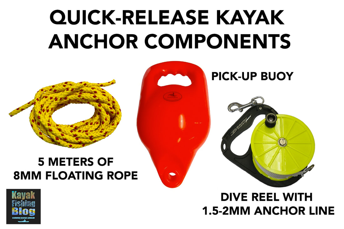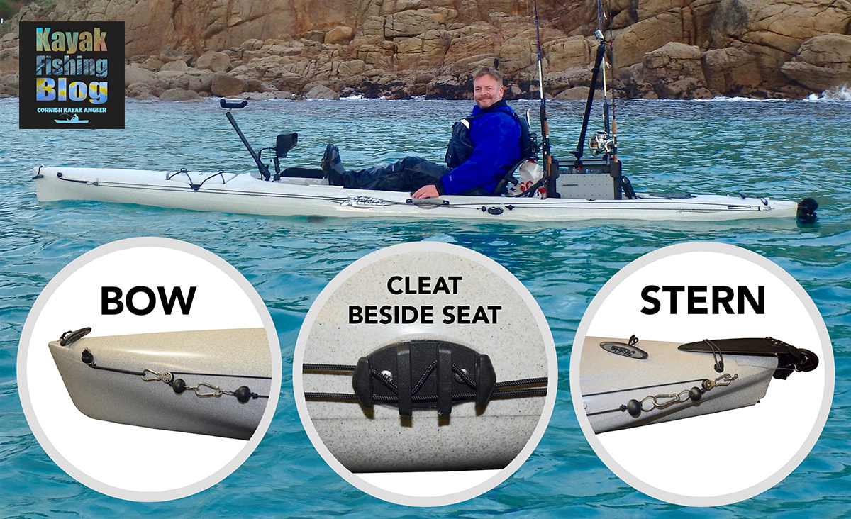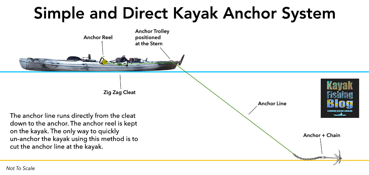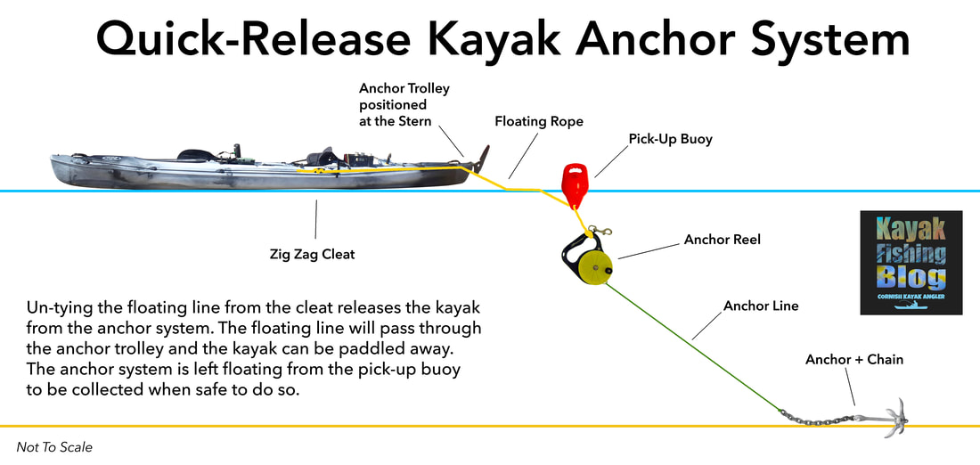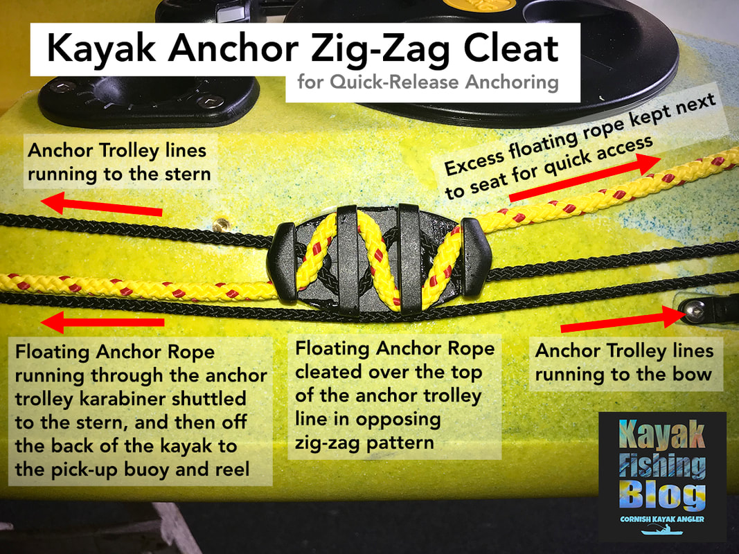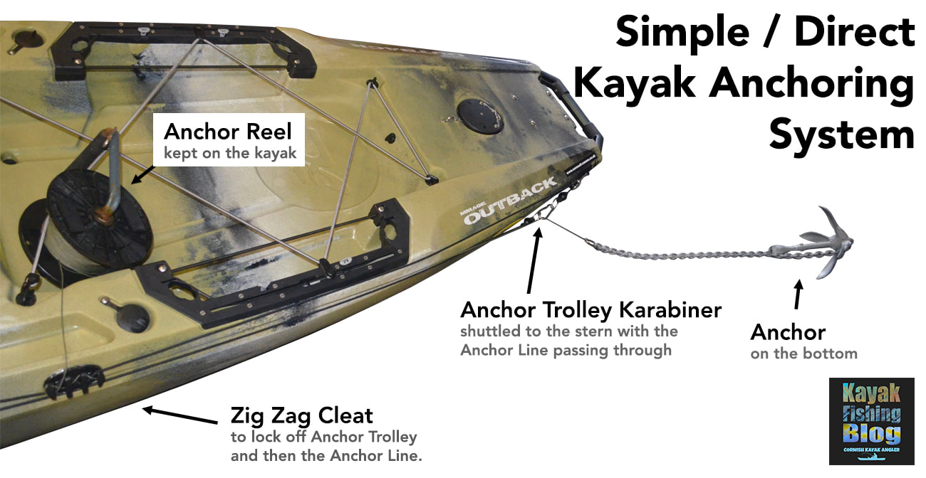 How to Anchor A Fishing KayakLet's jump straight to the point... anchoring a kayak is one of the most dangerous tasks to perform on a kayak. There is lots of potential for things to go wrong. Executed poorly and you could end up capsizing your kayak and this can lead to a whole other world of problems and possibly a rescue scenario, especially if you drift away from your anchored craft and cannot swim back to it. The risks involved when anchoring a kayak are very much related to the conditions at the time - anchoring in a big swell, or fast tide presents a higher risk than say dropping anchor on a flat calm lake. Nevertheless, the principles of safe kayak anchoring apply universally. Anchoring a kayak is not quite as simple as chucking an anchor down on a piece of rope and tying it off on your kayak. With a little thought and a few pieces of equipment you can greatly reduce the chance of a problem occurring and prevention is always better than cure! In many cases, the need to anchor arises from there being some form of current, tidal flow or wind (with associated choppy waves) that would otherwise cause you to drift. In order for a kayak to remain stable whilst at anchor, the hull will need to sit inline with the prevailing conditions. A kayak is by far more stable along its length rather than across it's beam - lean backwards and forwards violently on your kayak and you are unlikely to tip over... do the same side to side and you are much more likely to flip! With this in mind, you will need to cause your kayak to swing down-tide / down-wind / down-flow and this is best achieved by anchoring off the very bow, or more commonly, the very stern of your kayak.... easy! Well.... not quite. Tying off an anchor line to the bow or stern of your kayak is not an easy task when you are confined to the seat on your craft. Luckily there is a system that can be installed to your kayak to allow you to set your anchor line at the bow or stern of your kayak so that you can fish safely at anchor, all from the comfort of your seat - The Anchor Trolley. The Anchor Trolley SystemA Kayak Anchor Trolley, also known as a Running Rig, is pretty much essential for safe anchoring from a kayak. In basic terms, an anchor trolley is a loop of cord running between two pulleys situated at either end of the kayak. The loop is joined with a ring or karabiner through which you pass your anchor line. The trolley can then be shuttled from bow to stern easily from your seating position.
