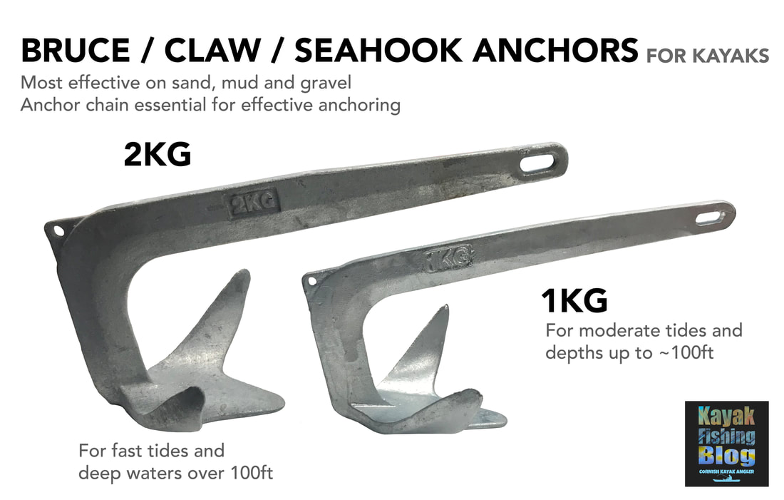 Bruce / Claw / Seahook Anchors These anchors are designed for use on soft sediments such as sand, mud and gravel. They have fixed shovel style flukes, usually 3, that dig into soft ground particularly well. You can get various weight bruce anchors and 2 weights will cover almost all kayak fishing scenarios: