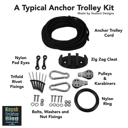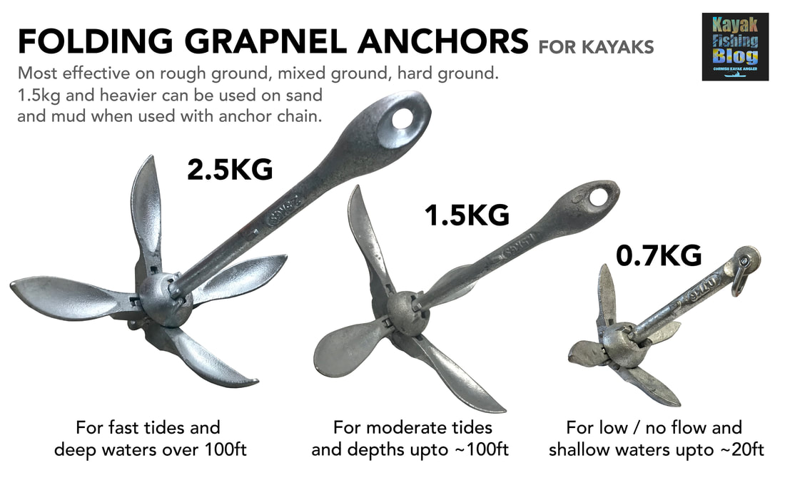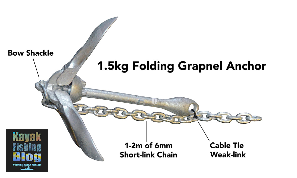 Anchor Trolley Components An anchor trolley kit will typically include: two pad eye fixtures to attach at either end of the kayak, two pulleys often with short lengths of bungee cord, or sometimes karabiners, to attach them to the pad eyes, a length of cord to run between the pulleys and a karabiner or ring to join the two ends of the cord. You then simply pass your anchoring line through the karabiner/ring at the seating position and shuttle it to the bow or stern between the pulleys. The bungee cord between the pad eyes and pulleys acts as a buffer against the kayak jolting the anchor line, and also helps keep the anchor trolley taut against the kayak. On my own anchor trolley I also use a couple of parrel buffer beads and have incorporated two stainless rings either side of the karabiner to allow me to break the trolley loop, forming a towing rope from the anchor trolley cord, adding versatility to the system. I clip the stern pulley directly to the pad eye using a karabiner to allow the point of anchoring to be as close to the back of the kayak as possible - this will help it sit better in a straight line in the tide. Click the following links to see full details of my anchor trolley on my Hobie Outback and Hobie Revolution 16. Anchor Trolley Cleat Some kits will also include a cleat to attach to the kayak near the seating position. This will allow you to ‘lock’ the anchor trolley cord into the desired position so that it doesn’t shift whilst at anchor. I recommend using a Sealect Zig-Zag cleat as the one cleat can be used to lock off both the anchor trolley and anchoring line. Fixings and Fixtures for Anchor Trolley Systems Ideally use marine-grade 316/A4 stainless steel bolts, washers and nyloc nuts for attaching anchor trolley fittings. If you cannot gain access to the back of the area where the fixing will be, use Trifold Pop Rivets which offer a strong alternative and are excellent for use on plastic or composite kayaks for fitting load-bearing accessories. Use a dab of sealant when installing fixtures to your kayak, for a good waterproof fit. Well Nut fittings can also be used if installed correctly, but are not as strong as bolts or rivets. Avoid self tapping screws on an anchor trolley system as they can be ripped from the hull if subject to high loads. Types of Anchors For KayaksThere are a vast range of anchors types available. Some are a specific shape to hold well on a particular type of ground, others are more general and do an ok job on all types of ground. There are two types of anchor that will cover just about all saltwater kayak fishing scenarios - the Folding Grapnel Anchor and the Bruce Anchor. For freshwater fishing, most shallow-water scenarios can be covered with either a Mud Anchor or a Stake-Out Pole. Folding Grapnel Anchors The most common style of anchor for kayak fishing. This is your typical shape anchor with four folding flukes and a sliding collar to lock them in position either opened or closed. This type of anchor is great for most grounds and will grab very well to rough and hard ground. It will also work ok on sand and mud if used with a length of chain (covered further down in this article). Folding grapnels are compact once folded and easy to store on a kayak. You can get various weight grapnel anchors and 3 weights will cover almost all kayak fishing scenarios: