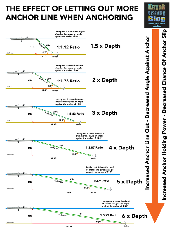 How much Anchor line should you let out?Grapnel and Bruce style anchors will bite into the bottom best when the anchor line is at a shallow angle to the bottom. By increasing the amount of anchor line let out, you decrease the angle between the anchor line and the anchor - this increases the holding power of the anchor and decreases the chance of anchor slip. The conditions will very much dictate how much anchor line you will need to let out. You will need to let out more anchor line the faster the tidal flow, the stronger the wind and the larger the swells. In shallow calm waters with little or no flow then you might get away with hardly any extra anchor line out as there will be little resistance against the anchor or mud weight. In calm-to-moderate tide/wind/swell conditions you should be able to get away with letting out somewhere between 1.5 to 4 times the depth of water. In faster tides, strong winds or large swell you may need to let out over 4 times the depth of water to achieve the shallow angle required for the anchor hold effectively. See the diagram below for how the amount of anchor line let out effects the angle between the anchor line and the anchor: Hauling a Kayak ANchorOnce you are done fishing at anchor it is time to haul the anchor in. There are two main ways people retrieve an anchor from the bottom back to the kayak: Hand Hauling This is where you pull in the anchor line by hand, passing the loose line back into the water as you haul to prevent tangles on the kayak. It is best to let the kayak drift down-wind / down-tide and let the loose anchor warp drift up-tide away from the kayak to prevent it tangling into a mess. Once the anchor has reached the kayak, the loose line can then be wound back onto the anchor reel, being careful to avoid tangles on the reel. This puts little or no strain on the reel when winding in. This method is best done by leaving the anchor trolley set at the bow or stern whilst hauling. This ensures the kayak stays sitting in-line with the conditions for the most stability whilst you haul the anchor. DO NOT haul an anchor with the anchor trolley at mid-ship - if the anchor is snagged and there is choppy waves or tide then you risk turning the kayak over as everything comes under strain. Once you are confident the anchor has released from the bottom and you are drifting then you can move the anchor trolley if you find it easier to haul the line beside the kayak. This method is the easiest way to haul an anchor on a kayak, especially with anchors over 1kg in weight. Reel Hauling This is where the anchor line is wound directly back onto the anchor reel. To do this, shuttle your anchor trolley to the bow of your kayak and then wind in as much slack anchor line as possible to position your kayak roughly over the anchor. Once your kayak is over the anchor, hopefully it won't be snagged and you can continue winding in the anchor and anchor line directly onto the reel and back to the kayak. This can put a lot of strain on the reel when winding in but in some conditions (such as fast tides) this can be easier, safer and sometimes quicker than dealing with the slack line used by the other method. As soon as the anchor reaches the kayak you would be in a position to paddle or pedal off quickly. Sometimes it is too difficult to wind straight onto the reel so a 'pump and wind' approach is needed whereby you pull the anchor reel towards you then quickly wind on a few turns of line as you lean forwards with the reel - similar to how you would play a fish to the kayak just without a rod! A note on hauling Quick-Release systems... A quick-release anchoring system takes a little more work to haul than a simple/direct anchoring system. This is because the reel is held in the water and the line running from the reel needs to be clipped into the anchor trolley karabiner before you can safely haul the anchor line from the bow or stern. This involves pulling the floating rope, buoy and anchor back to the kayak first, quickly moving the anchor trolley to mid-ship, then clipping the anchor line into the anchor trolley karabiner and then ensuring this shuttles to the bow or stern before you go pulling the anchor in. In challenging conditions this can be a little tricky but providing you are prepared and let out some anchor line as you have the anchor trolley at mid-ship (when you clip the anchor line into it), before shuttling it to the bow or stern then it is safe to do. Practice is required to become competent with this but is relatively easy once you have done it a few times. Safe Kayak Anchoring TipsAnchoring can be potentially dangerous on a kayak but with a good understanding of the theory and principle behind anchoring a kayak in combination with plenty of practice then you can almost eliminate any problems arising whilst you anchor your kayak. Here are a few pointers from my experience in anchoring a fishing kayak over the years...