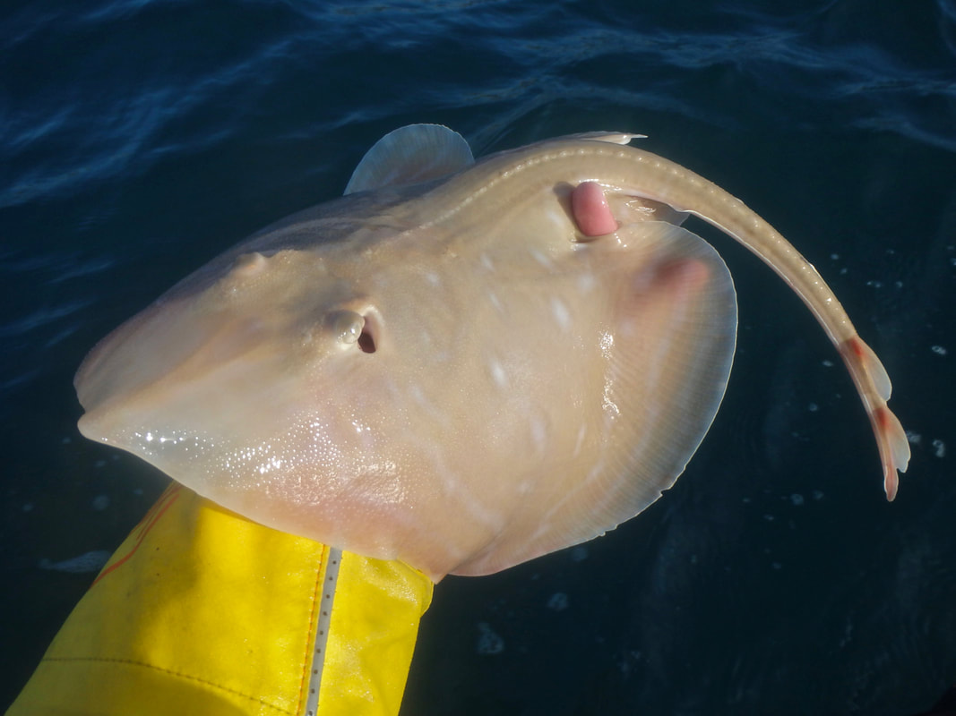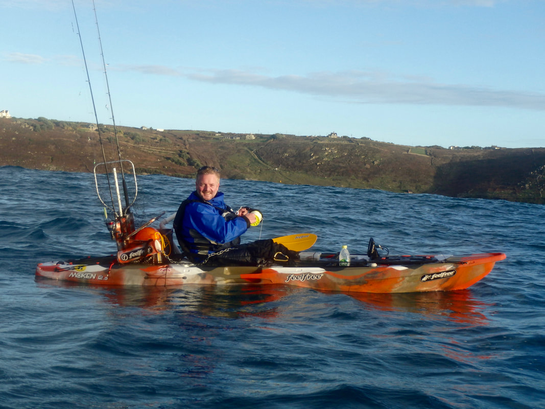 Matt would be joining me on the water and it would give him his first taste of open coast fishing in West Cornwall. We met mid morning and headed out on an incoming tide. The weather was good with light winds and sun. It was pretty cold though so it was on with the Palm Bora drysuit with several layers of thermals beneath! The water was lively. Strong winds in the previous days had put plenty of energy into the water and a good 4-6ft swell was rolling in off the Atlantic. I had one target.... a specimen Blonde or Small Eyed Ray. Specimen weights for these species in my club (Mounts Bay Angling Society) are 18lb for Blondes and 9lb for Small Eyeds. Either would do! The day started with some trolling for Bass. Two small Bass of around 2lb were tempted by the Duel Hardcore Minnow... Onto the Ray grounds and the fish finder lit up with fish. Sabikis down.... Mackerel! In fact there were so many Mackerel that we had to hunt for a clear patch to drop the anchors away from them! Well at least we had plenty of fresh bait and fresh bait is always best. Anchors down and plenty of warp let out to buffer against the swells. Strips of Mackerel were sent down on running ledgers to the sandy seabed below. It was around 30 minutes or so before the first bite came along. It was really having the bait but it wasn't a Ray..... it was a Turbot! These are always a welcome sight on the kayak. Only small but very pretty and released to see another day. That makes species number 41 off the kayak this year. The other rod was soon getting a bite too and this time it looked more like a Ray settling over the bait. Soon enough it was pulling hard at the bait and was hooked. The rod bent over and took the strain of a powerful fish trying to dig back into the bottom. I was using a Fladen Solid Carbon Maxximus 12-20lb rod, although the blank feels more like a 6lb class until you load pressure into the bottom 3rd of the blank. So these rods really bend well with a ray on the end! The rod was paired with a Fin-Nor Lethal 40 loaded with 29lb Daiwa J-Braid, which was now peeling nicely from the reel and the fish headed off along the bottom. You can't bully these fish too much as they will just snap you up. I soon had it in mid water where it gave a flurry of short runs back to the bottom. I could tell this was a better fish. Could it be over the magical 20lb mark? Braid turned to mono leader and soon a big ray shape appeared below the kayak. This was a good fish, and felt a right lump as i grabbed it and pulled onto my lap. Unhooked and a quick weigh with the scales..... 20lb 8oz!! Yes! That was me happy. First ray of the day too. The fish had a wingspan of 71cm, just over the 70cm IFCA fish measure! A few photos and it was back to the depths.... The next few hours saw steady action. In fact the next fish was another nice Blonde of around 15lb. I then had a mad 5 minutes which first saw this Blonde in the kayak.... And just as i let go of that fish to release it my other rod slammed over with another Ray. Another nice double figure Blonde! Despite Matt being only 100 yards away from me, the fish just weren't finding his baits. Same rigs, same baits but it was me getting all the bites. Every so often the vast shoals of Mackerel would swim beneath us smashing the baits and it was impossible to get through them. The ray rods came in and the sabikis went out. It didn't take long and i had filled the entire foot well of the Revo 16. Its not often i take so many but my freezer is empty and i need bait for the winter. The rays kept coming but this time it was Small Eyeds instead of Blondes. A particularly small Small Eyed also showed up. Matt had a bite and soon was hooked into a fish, but it wasn't a Ray. It was a Turbot and his first so that was great. And then it all switched off. One lonesome dogfish found a bait and that was that. An hour passed with little action and with the fading light we decided to make our way in. I stopped off and caught some more Mackerel and amongst them some Scad and Pilchards on the way back in. That made for a good number of species for the day! Just as we headed in we were treated to a spectacular sunset. That concluded a successful and enjoyable day on the water. Target achieved with a specimen Blonde Ray. Unlucky for Matt who couldn't tempt a Ray, there's always next time and i'll be looking forward to it.... i have a specimen Small Eyed to catch!