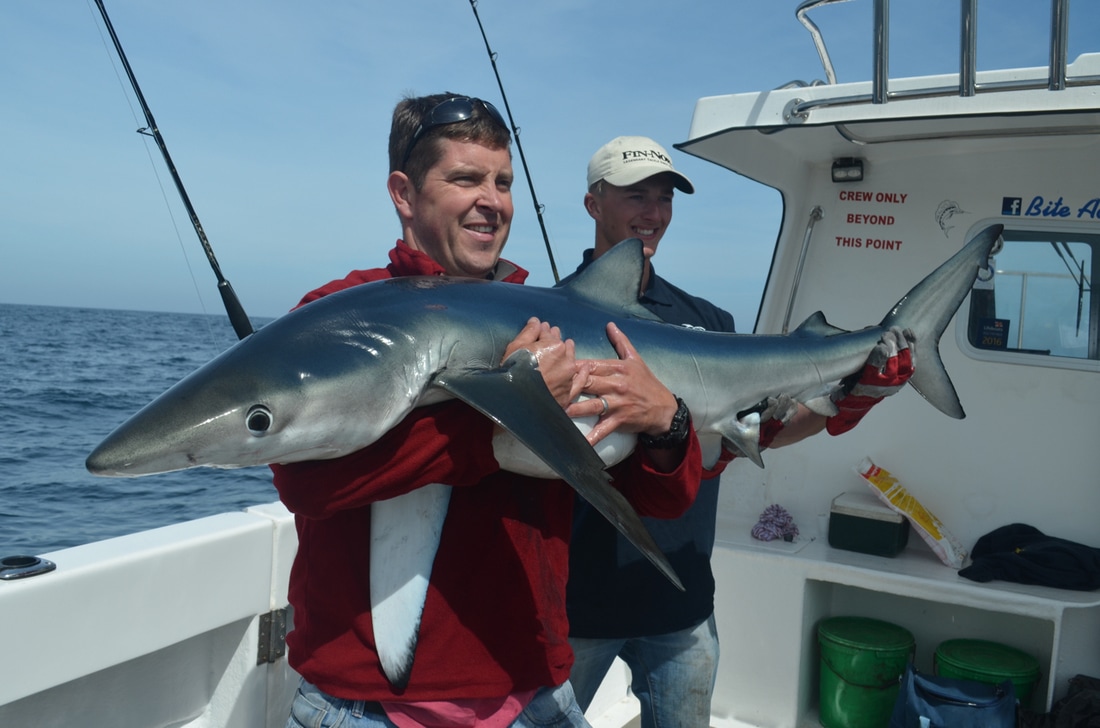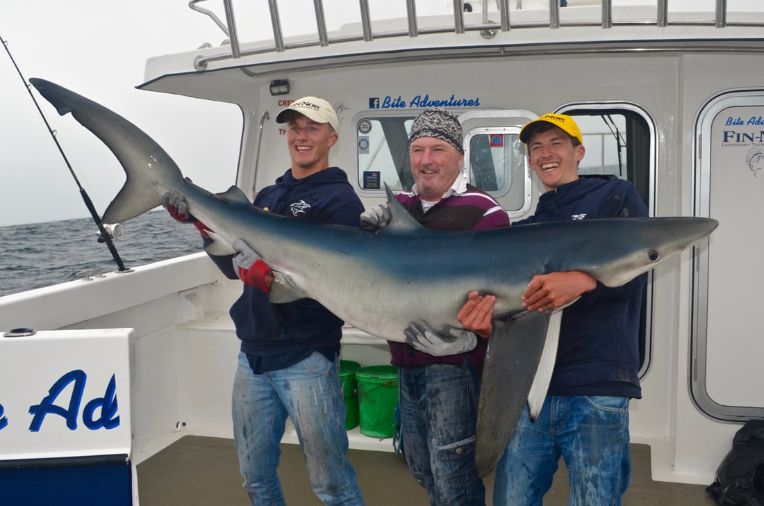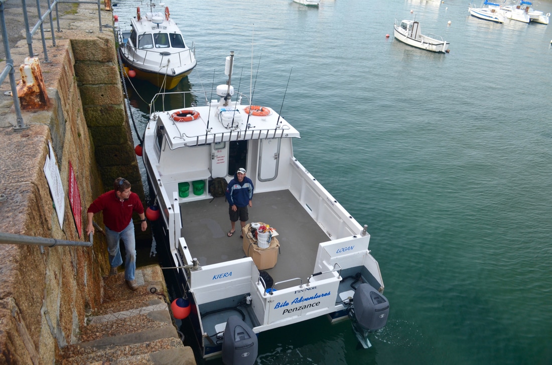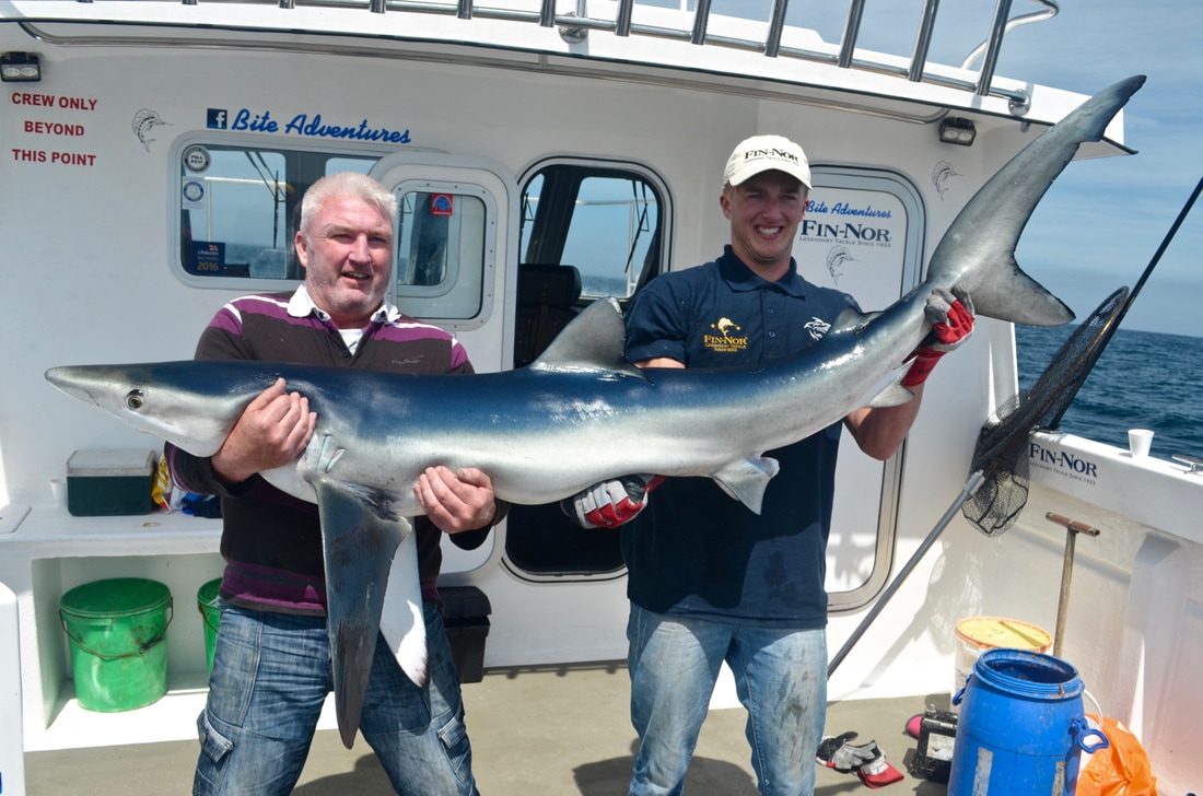 An Early StartWe would be leaving Penzance Harbour at 6:30am and it was due to be a long day on the water. We would be heading way offshore in search of the magnificent Blue Shark. This pelagic sharks live a nomadic life and travel huge distances across across the ocean in search of food, mainly baitfish such as Mackerel and Herring as well as Squid. The sea temperatures around Cornwall were just about warm enough for them to turn up here and Bite Adventures would be heading out to see if they had arrived. Bite Adventures is skipped by Robin 'Chippy' Chapman, one of the top skippers this country has to offer and certainly has an impressive catch record to boast. His boat Bite Adventures has seen some huge fish over the years and the waters of West Cornwall offers some of the finest fishing in the country, the type of fishing you will drool at! A top bloke too and what he doesn't know about fishing isn't really worth knowing. He was busy prepping the boat on arrival.... There would be a fine group of reprobates on the boat today, local angler Scott, one of Cornwall's top boat anglers Bob and the top Jam Master Kieren, also known as my brother. Ropes away and we headed off to find some fresh Mackerel for bait. Bite really shifts. She is a 9 metre North Sea Catamaran and is powered by twin 200hp four stroke Honda outboards. These really chuck out some power with an oblivion of white water off the stern. We were going places quick.... Less time travelling so more time for fishing! We soon stopped and tried for the mackerel which were proving scarce. We managed a handful in half an hour, just enough for bait. I found a Pollack too. Time to head out to the grounds! Plenty of banter later and we arrived. The Shark Fishing Grounds....Chum mashed up, rods set up, baits prepped to perfection and one by one 4 rods were set fishing at varying depths in the water column in the hope of finding a shark. It was a glorious day and everything felt just right.... The gear used on Bite is top quality stuff. The boat is sponsored by Fin-Nor - a world leader in big game fishing gear. We were using both Fin-Nor rods and reels and they are superb. Chippy hand makes his shark rigs with great attention to detail, perfected over many years of shark charter fishing. The shark fishing on Bite Adventures is strictly catch and release with every effort made to ensure the fish go back with minimal harm. The rig is terminated in a strong circle hook providing a clean jaw hook up - no deep hooking so less damage to the fish, and quicker unhooking too. Now we just needed fish! With 5 on the boat we had to fairly decide who would get first fish. Chippy put himself as 5th on the rods leaving 4 of us to pick out numbered sticks to decide which order we would get our go on the rods. Number 1 went to Scott, Number 2 went to Kieren, I picked out Number 4 leaving Bob with Number 3. I'd have to see 3 fish on board before i got a shot.... fingers crossed! The slick was forming nicely.... Whilst the shark rods were being set, Bob had snuck a bottom bait down and was soon into a fish. But not any old fish, oh no... he had only hooked a rare Cuckoo Ray! The stunning fish was soon on the deck. What a cracker and not often caught on rod and line. This was Bite Adventures though and this fish turned out to be the 3rd Cuckoo Ray caught that week! A super start. Chippy kept a watchful eye on the shark floats.... Click, Click, Click.....An hour passed before everyone's heads swung around to the sound of a clicking ratchet. That sound really gets the adrenaline pumping! A Shark had grabbed one of the baits and Scott leaped into action. That sound signalled the start of Bite Adventures 2017 Shark Fishing season. Chippy ensured the fish was hooked up and Scott was soon bent into a fish. The sharks were here! A good scrap and the fish arrived at the surface. The deck was prepped ready for its arrival. Fresh seawater wetted the deck with many buckets of water aside ready to keep the fish cool. The side door was opened and the fish brought to it. Chippy got a firm grip of its pectoral fin and brought the fish on board. The fish was held still and quickly unhooked. Cool sea water was poured over the fish whilst everyone prepped for a quick photo. Chippy gave Scott and Kieren the low down on how best to hold the fish keeping it well supported out of the water and it was time for the money shot.... One happy angler with a Blue of around 60lb! It was soon released back to the sea and dived back to the depths, excellent! The mood onboard was now very positive. This was the first Blue Shark to be caught in the UK for the 2017 season. The chum slick was tended too periodically to maintain a constant trail of scent in the water. Another hour passed by before another fish showed up. It was Kieren's turn. Hook set and off the fish ran.... A good fight. The was deck wetted and prepped and shark number 2 was soon being brought on board for unhooking, a quick photo and release. That was Kieren happy, a Blue Shark of around 50lb. Bobs BlueWith Kieren's fish released and the rods reset, it was Bob next on the rods. He is well known for being one to pull out some proper girt lickers - that's big fish for those not from round ere'. He has had some monsters over the years and he was sure to keep telling us that shark number 3 would be the big one. I kept telling him it would be number 4 but he wasn't having it. Almost exactly another hour later (did these sharks have a timetable!?!) i spotted one of the rod tips lurching over. "Shark!!!!" and with that everyone leapt into action. All rods were wound in as before, Bob took hold of the rod and he was soon bent into a lumpy fish.... maybe he was right!! This fish was clearly bigger than the previous two. It gave a great account for itself and required plenty of stick to get it to the boat. We peered over the gunwales and watched the fish appear from the depths. It was certainly the biggest one so far today. A great 