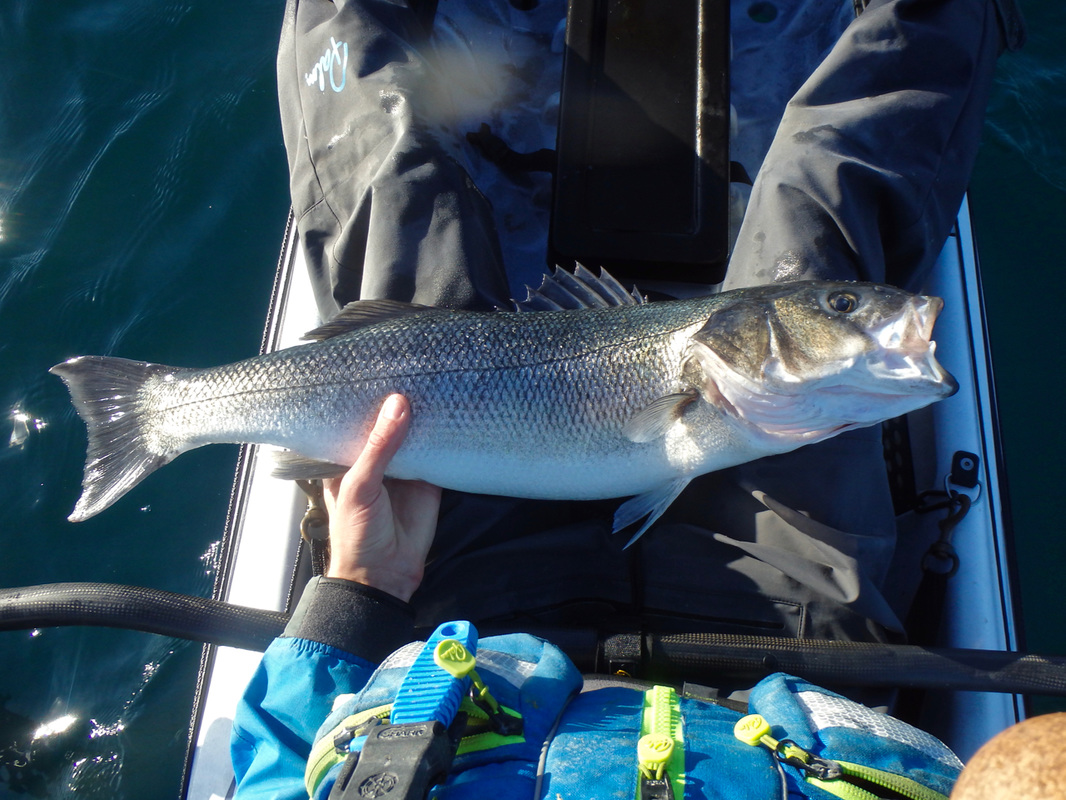 The sun was out, the wind was zero but there was a decent swell rolling in. The plan was to head offshore to fish some deep water reefs but with the swell pumping in the shallow reefs close to shore were foaming! I suggested to Andrew that we have a few casts in the lively white stuff in the hope of a Bass on the way out. This turned out to be an excellent plan because on the first cast something nailed the lure! The fish tore off and i initially thought a big Pollack had taken my Savage Gear sandeel. Once i turned the fish it soon become apparent it wasn't the usual crash diving Pollack. This fish was angry and hanging deep. My Ugly Stik Elite Spin 20-50gr was hooped over but i slowly teased the fish towards the surface. I peered down into the crystal clear water to see a decent Bass thrashing around!!! Soon enough i has a stunning Bass of 7lb 13oz and 70cm in length on my lap!! This is my biggest Bass to date. I very rarely specifically target Bass and when one comes along its a bonus when fishing for other species. I was over the moon to catch this fish! I doubt i will beat it for a while. The fish was kept for the table and the fillets have made 6 meals. This is only the second Bass i have retained since starting fishing and it certainly did not go to waste. Andrew filmed most of the fight on his iPhone whist circling me in his Hobie Revo 13. Once Andrew looked up from his phone he instantly felt really sea sick. The swell had taken its toll. That was that, because sea sickness is a feeling you can't shift having suffered from it several times before. He hung on for an hour before we had to call it a day. Not to worry as I was more than content with the stunning bar of silver that graced my kayak. We landed, then chilled out with coffee and cake in a cafe whilst watching the surfers on the beach . We should have taken the surf yaks but there's is always next time for that. I got home and spent the afternoon making weights so a productive day all around.