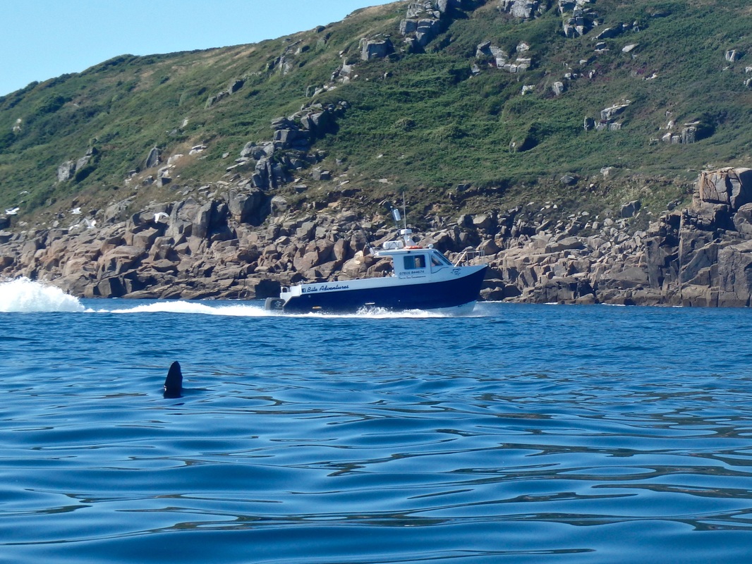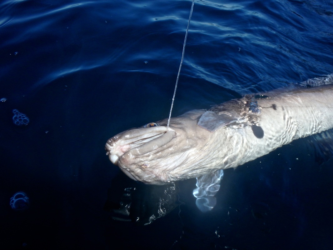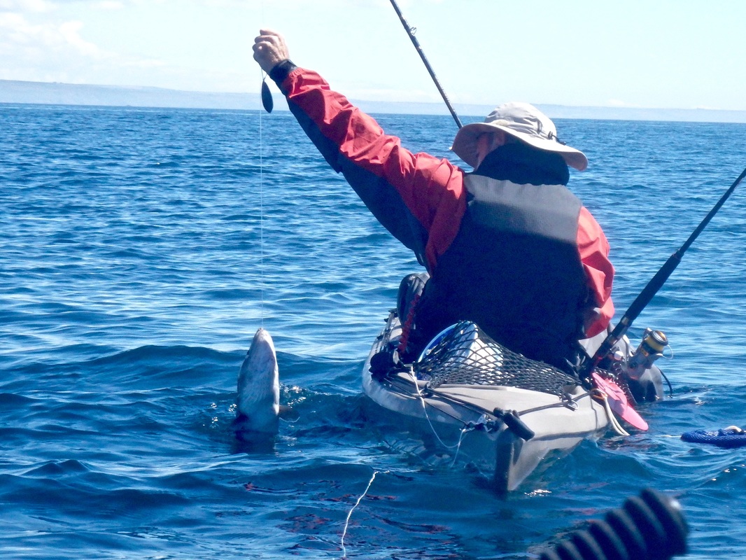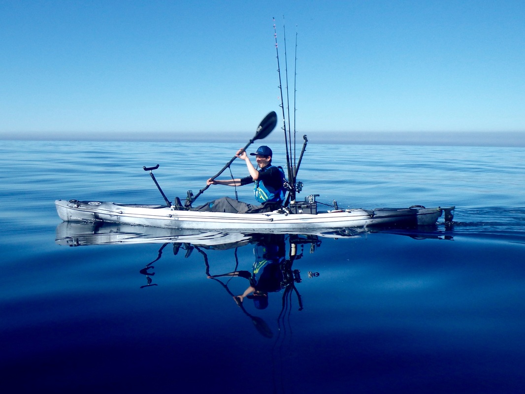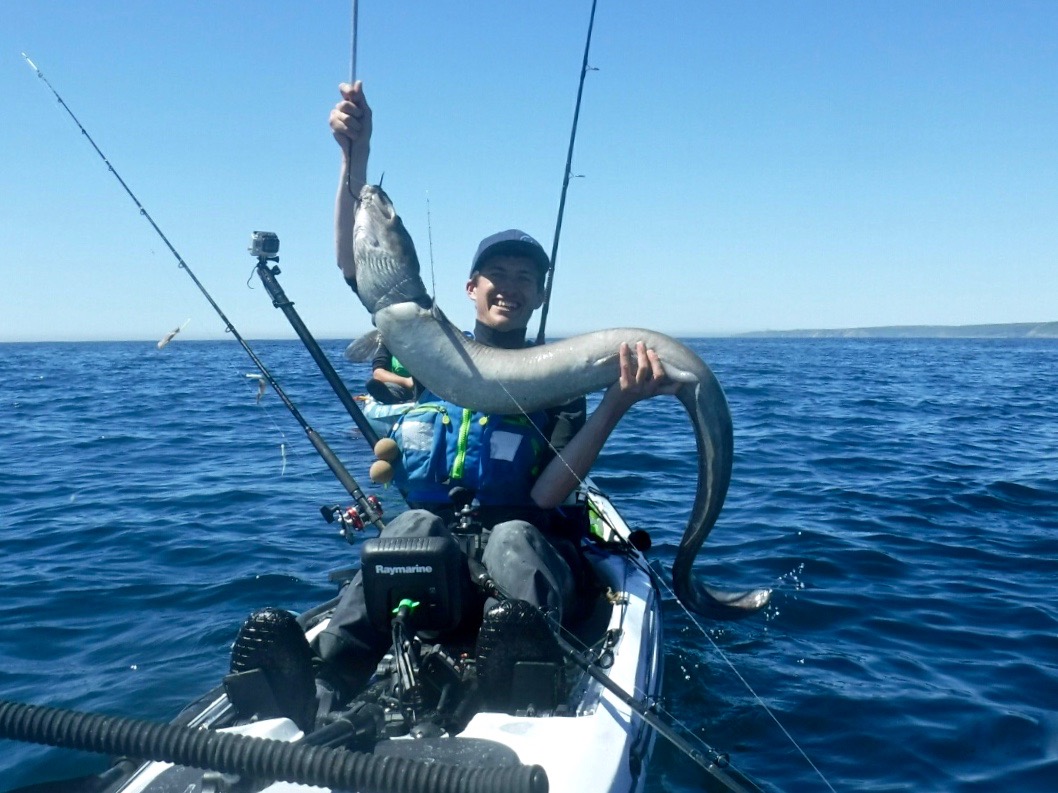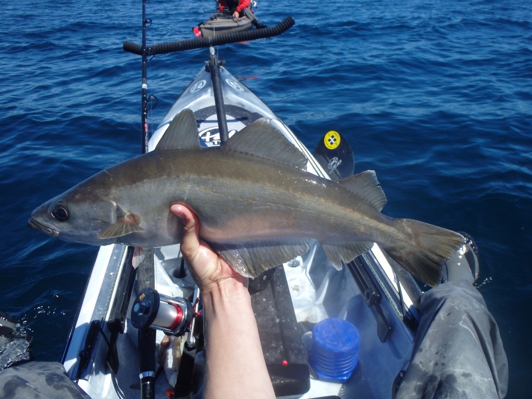 Gary and Andrew would also be coming along so on a sunny morning we met at the launch mark in Mounts Bay. The sun was shining and there was not a breath of wind, proper summer weather! It would be a fair paddle out with the mark located approx. 3 miles offshore. It would be a great chance to get accustomed with the Rytmo so i was looking forward to it. The sea met the sand without a ripple. I slid the hull onto the water, jumped on and put in my first paddle strokes in on the new kayak. Initially it felt new, and then became very familiar. I can only really compare it with the Tempo, given its similar hull design. The seating position is higher and it feels it, not in a negative way but it just feels different to the Tempo. Other than that it paddles very similarly to the Tempo on calm water. It was paddling really well! Gary was on his Tempo and the Rytmo kept up with it without a problem. It was a joy to paddle! I soon had the rudder down and was snaking all over the place to test it responsiveness - all good! On the flat water the Rytmo comfortably cruised at 4 knots without breaking a sweat. Push it hard and it was moving at over 5 knots. The glide on this kayak is incredible too! The water really was calm. Not a ripple broke the glassy surface. It was reflection perfection.... These really are the perfect conditions for venturing offshore. We all had entered the GPS co-ordinates onto our chart plotters so it was a case of paddling straight to the mark. Less than an hour later of paddling through jellyfish soup (there were thousands!) and we were nearing the mark and looked eagerly at the fish finders to locate the wreck. Flat bottom, flat bottom, flat bottom, Wooooaaaaahhhh! The wreck rose high above the sea bed 180ft below and showed really well on the Dragonflys down vision. Excellent, we had found it. Gary and Andrew were soon seeing the feature on their fish finders too. We worked out which way we were drifting and set up anchor so that we would sit over the top of it. Andrew put the anchor down on the Moken 12.5. Gary and myself tethered off his bow. This would allow us to be close to each other over the mark and, should help be needed with a fish, moving to one another would be easy. Mackerel would be the special of the day and soon we were all sending flappers down to the wreck. I was using an Ugly Stik Classic 30lb rod, with an Abu 7000 loaded with 30lb mono. The rig was simple and involved a running ledger, with an 8oz weight on a 15lb weak link and a 3ft 150lb mono trace terminating in an 8/0 Mustard O'Shaughnessy hook. All was quiet for a while until Andrew went to check his bait. "I think I'm snagged".... i turned around to see a Fladen Maxximus Solid Carbon bent in half, but the tip was nodding. "its a fish! Give it some to get it away from he wreck!". All sorts of noises and explicits flew through the air as Andrew did battle with his first Eel. I don't think he expected them to be so powerful.... The fish took line several times and gave Andrew a right old pasting! A Conger 15-20lb was soon thrashing around at the surface. A quick photo and the fish was unhooked and powering off back to the bottom. A promising start. Andrew played the whole "i'm going to check my bait again" trick a short while later and hooked into his second eel of the day, a smaller fish of around 10lb. Gary was next to get his rod bent. A good old tussle ensued as Gary got to grips with his first Conger. It's a good workout bringing them up through nearly 200ft of water! Eventually he brought his fish to the kayak, estimated around the 15lb or so mark. A quick unhook and it was off to the bottom again. All went quiet for a while again. Smaller fish kept us occupied and we caught Pollack, Pouting, Poor Cod and Haddock on small baits. I was beginning to wonder if i would even get a bite. It had been a good while since Garys Eel but finally i had a solid bite from the depths below. The fish was slowly moving off with the bait so i gave it some time before i set the hook...... All hell broke loose! The 30lb class Ugly Stik Classic hooped over as i put pressure on the fish to steer it clear of the wreck. Pump and wind, pump and wind.... this fish felt decent. Violent head shaking and hard lunges jerked the rod tip down as the fish tried to retreat back to the wreckage. A minute or so later and the fish was in the relative safety of mid water. It was slow progress as i didn't want to rush the fish but after 5 minutes it was nearing the surface....and then it changed its mind and went on a long powerful run back towards the bottom! The rod tip was in the water and line pulled from the reel. These really are powerful fish. A few minutes later it was back beneath the kayak and a long grey shape emerged from the blue depths. "That looks bigger!". Once on the surface the thrashing and death rolling began. i grabbed the trace and brought the eel alongside the kayak. It was certainly looking to be a PB! I grabbed my short-handled gaff and waited until i could slip it under its chin. I find it safer for both you and the fish to unhook/photo/sort out a conger when chin gaffed. Otherwise it just death rolls, slimes everywhere, bites anything and everything near its mouth and thrashes uncontrollably. That can become very dangerous on a kayak. A chin gaff through the bottom of the mouth does no more damage than the hook in its mouth and soon heals up. Gaffing in the guts or side of the head will not bode well for the fish and is to be avoided. If it's lip hooked then it's easy to release beside the kayak. This fish had taken the hook down so it was a gaff job, and then out with the T-bar disgorger. I pulled the fish onto the kayak for a few quick photos before release. I had no way of weighing or measuring the fish accurately but it was somewhere between 30 and 40lb. Several people have said around 35lb so i'm happy to take that. A new PB for me! After all that excitement things went quiet. A few small bits and bob
