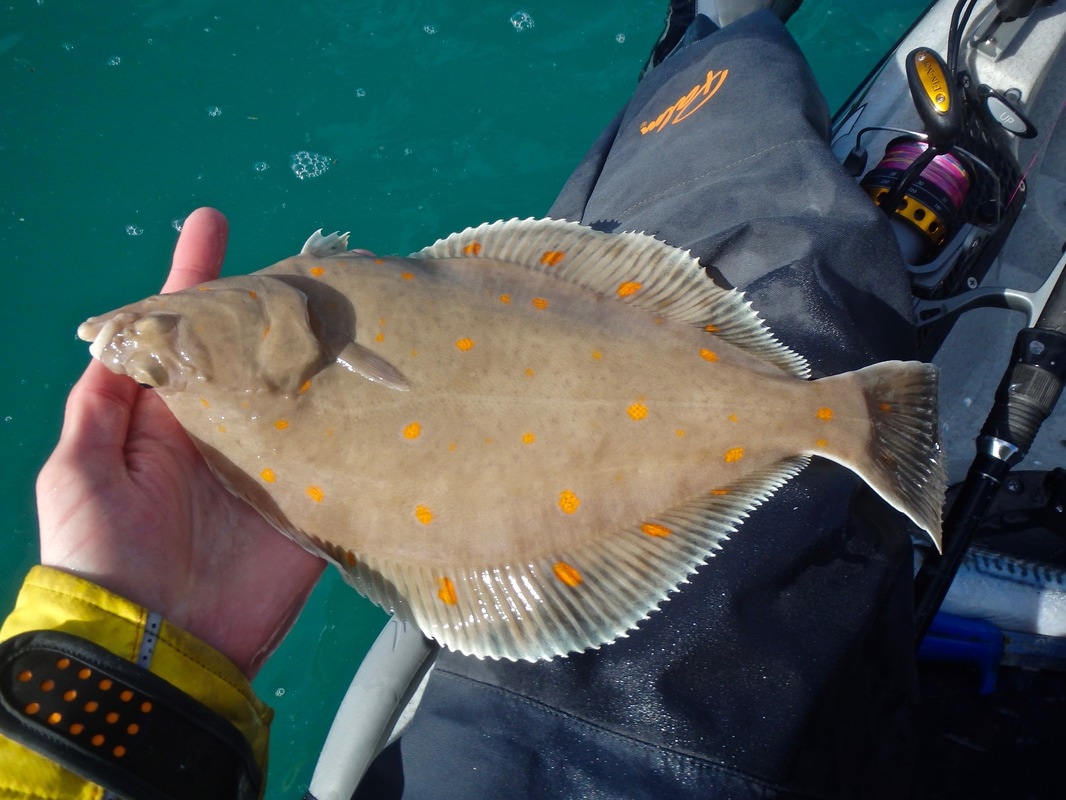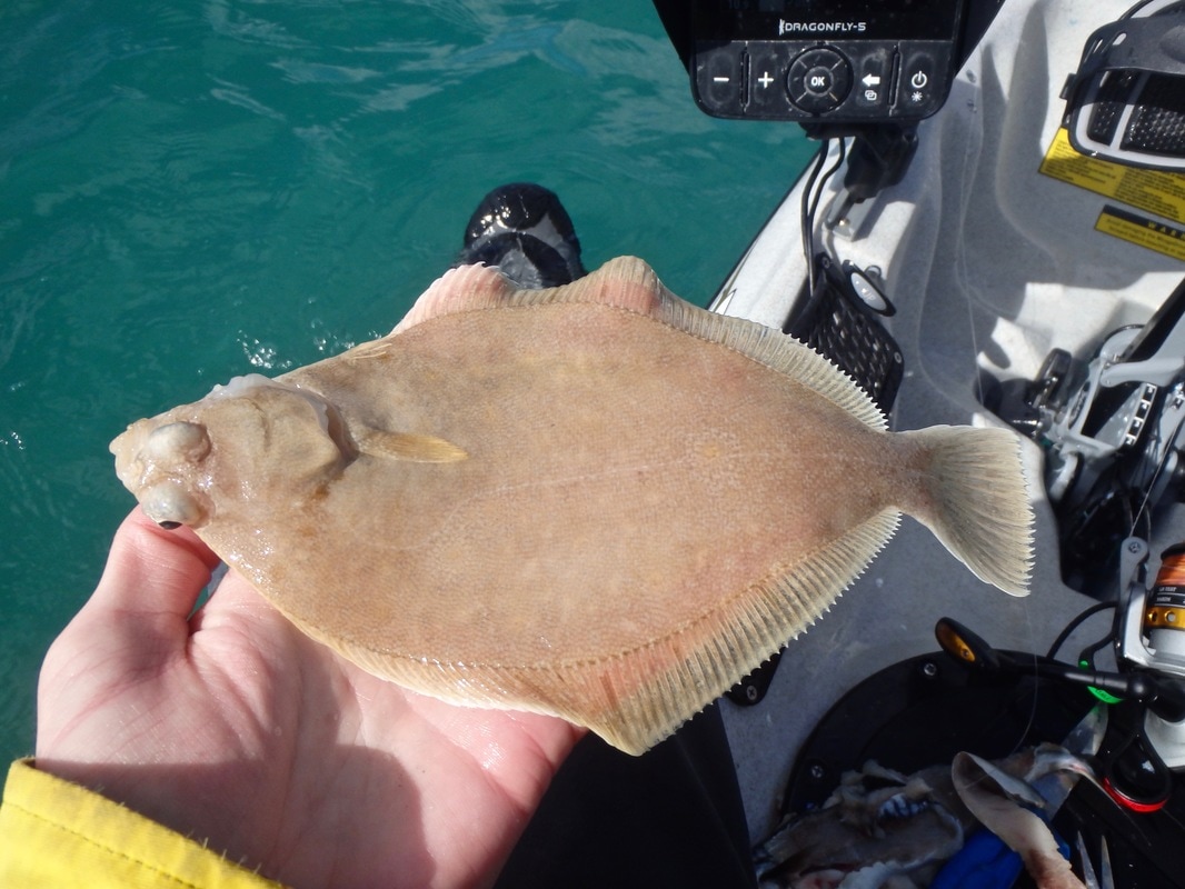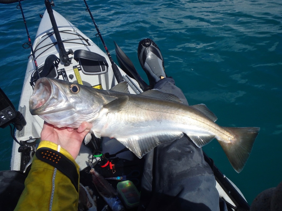 Apart from a drop of swell the forecast showed sun and little wind so we could choose pretty much any launch venue we wanted. Seeing as it was the Revo's maiden voyage i thought i'd treat it to the stunning waters of West Cornwall. Adam was driving down from Southampton to give his Revo 16 it's first trip out, and early on Sunday morning we met in a small cove and began setting up for a day on the water. The plan was to find some clean ground and drift baits across the bottom with the tide in the hope of finding some flatfish and perhaps finding some shoals of Mackerel. We were soon rigged up and launching. The water wasn't quite a calm as the forecast would have you believe. There was a fair bit of chop and swell.... a good test for the new kayaks! Paddling off the beach to deeper water, the Mirage Drive 180 was slotted into the drive well and i took my first pedal in the Revo 16.... It is a completely different experience to paddling a kayak. It took a little while to get used to the lack of being able to brace with the paddle in the choppier water but after about 10 minutes i had got used to it and was away! I changed the pedal adjustment a couple of times to find the most comfortable distance between the seat and the pedals for efficient pedalling, the number 5 setting seemed best. The seat felt superb too, proper comfortable - i found i needed to angle it quite far back to get into the most comfortable position for pedalling, but once i found the right spot the whole pedalling experience was great!! And the scenery was just fantastic too.... Adam seemed to be getting on well too with his new craft... We pedalled along the coast to our chosen fishing spot. The fish finder was working spot on through the BerleyPro 'Raymarine-Ready' transducer mount and was occasionally showing shoals of fish beneath the kayak. Eventually i found out what they were.... Herring After a few they seemed to disappear. We drifted around in the hope of finding some Mackerel but they seemed absent. Time to drift on some clean ground. I dropped two baits down to the bottom on running ledger rigs and set the rods down on the rod rest. Despite it being a fair sized tide there didn't seemed to be much tidal flow. This didn't help with the bottom fishing as we weren't really covering much ground to find the fish. Time to try the reverse mode on the Mirage Drive. Luckily i was able to set the two rods just far enough apart to work the drive in-between them. I pulled the reverse toggle and gently pedalled the kayak in reverse to force drift the baits and cover more ground....being able to do this was quite incredible! It actually worked really welll, and i could operate the rudder to snake my way across the ground. I could also use the GPS speed on the Dragonfly to move the baits at the pace i wanted. One thing i did notice though is that you have to have a firm grip of the rudder handle when reversing. It's fine at slow speeds, but pick up the pace and the rudder blade wants to jump to one side. Keep and firm hold on the handle and its fine though. There didn't seem to be too many fish about but eventually i managed to tempt a bite. it felt like a flatfish and i wasn't wrong. I soon had a Plaice on the kayak, not a big one but the orange spots were absolutely stunning! It was soon released to the depths for another day. Bites were very hard to come by and it took a few more drifts before another bite came along. Another flatfish, this time a small Dab.... I think we all had a Dogfish or two but after an hour or so of struggling for bites we were getting bored. The weather was stunning though! Time to try some different ground. We headed further up the coast to find some deeper water over mixed ground in the hope of finding some fish. Andrew managed to find some Cuckoo Wrasse but still bites were hard to come by. I dropped down a set of baited sabikis to see if anything smaller would be tempted. A few nibbles and then something hit the rig so hard it snapped a hook off....bugger! A quick re-bait and straight back down... again something smashed the bait but this time i was ready and played it lightly to prevent breaking the 8lb mono rig body or bending out the size 8 hooks. The fish had the rod bent right over and was diving all over the place. After coaxing it up about 100ft it arrived at the surface.... it was a Pollack! Only around 3 or 4lbs but what a fight on light gear! It was soon powering off back to the bottom. We covered some more ground without much more luck, then had a pedal along the coastline to pass the time. I had a play around with the fin tensioning on the drive and found a sweet spot for me between a stiff fin action and more fluid fin action. The fishing was slow and it wasn't long before we decided to head back for the launch. Quite a breeze had picked up which wasn't forecast. All of a sudden one of the Revo 16's advantages became apparent.... they pedal really well against a head wind. We all agreed that if we had been paddling against the wind we would have been having to work hard, yet the Revo's cut straight through the wind without exerting too much effort. They have been named 'Wind-Cheaters' by those who have them and i can see why! We were soon back at the cove and ready to land. A few small waves were rolling in so we hoped for no disasters. Careful timing and we were all back ashore without catching a wave! We had covered a far distance, probably around 8 miles or so and my legs were feeling it. I had been using muscles that are not often exercised! I'm sure they will soon be toned up after a few more sessions! We hauled the kayaks back to the car park and finished the day off with an ice cream. The fishing was poor but the weather and company made up for it. Overall it was a great day to test out the Revo for the first time in typical Cornish coastal conditions. For the first session with it i'm very happy and i'm really looking forward to see what this kayak can do and where it can
