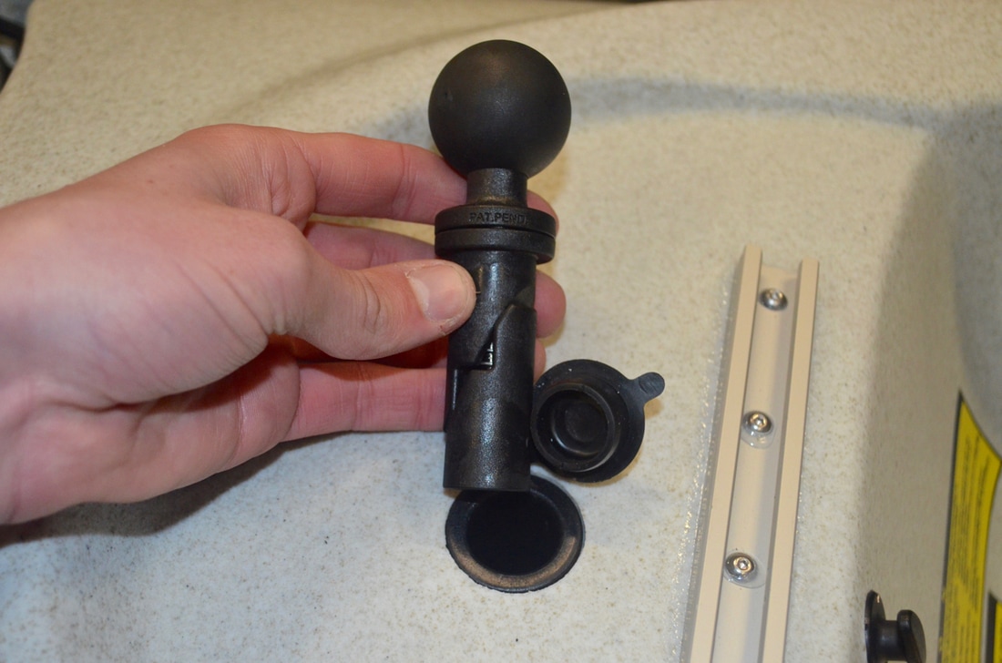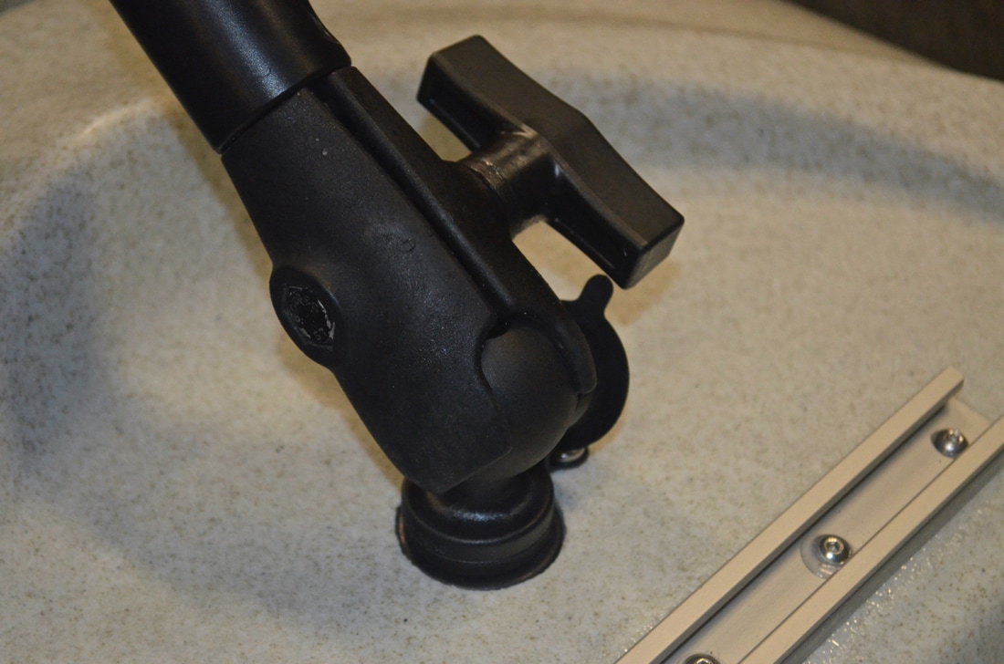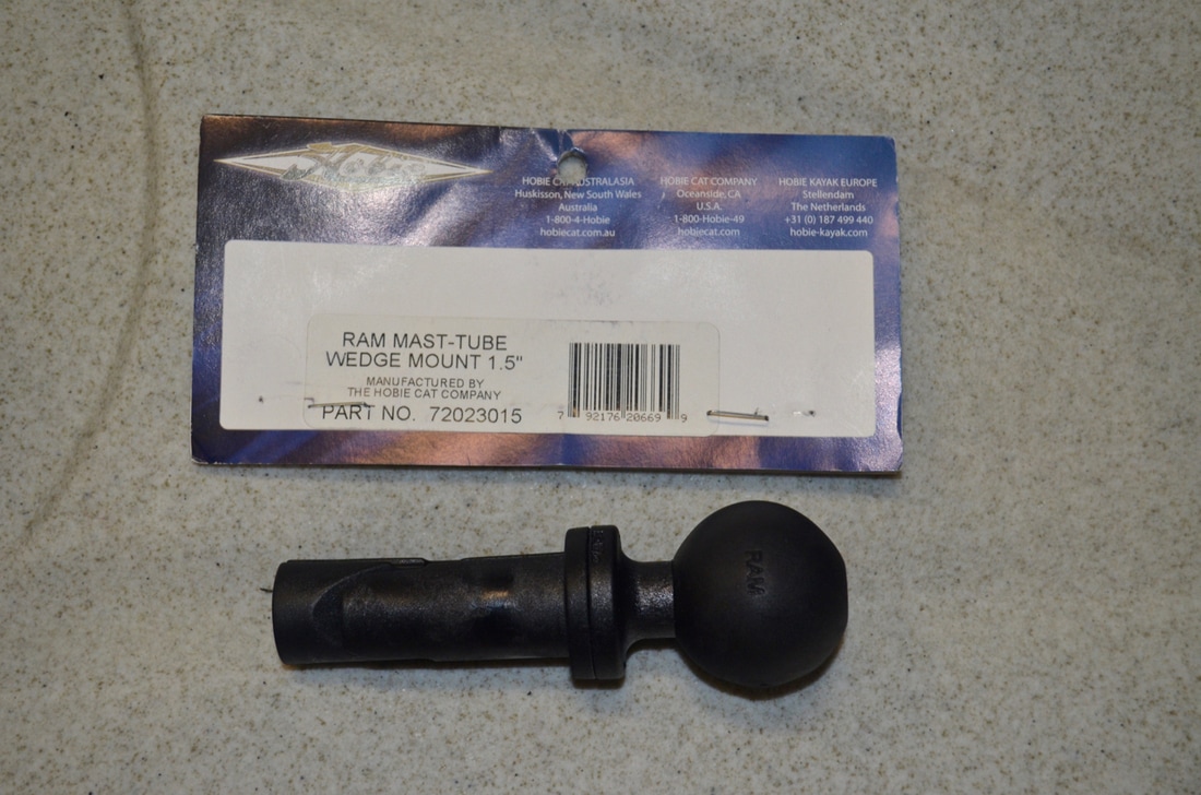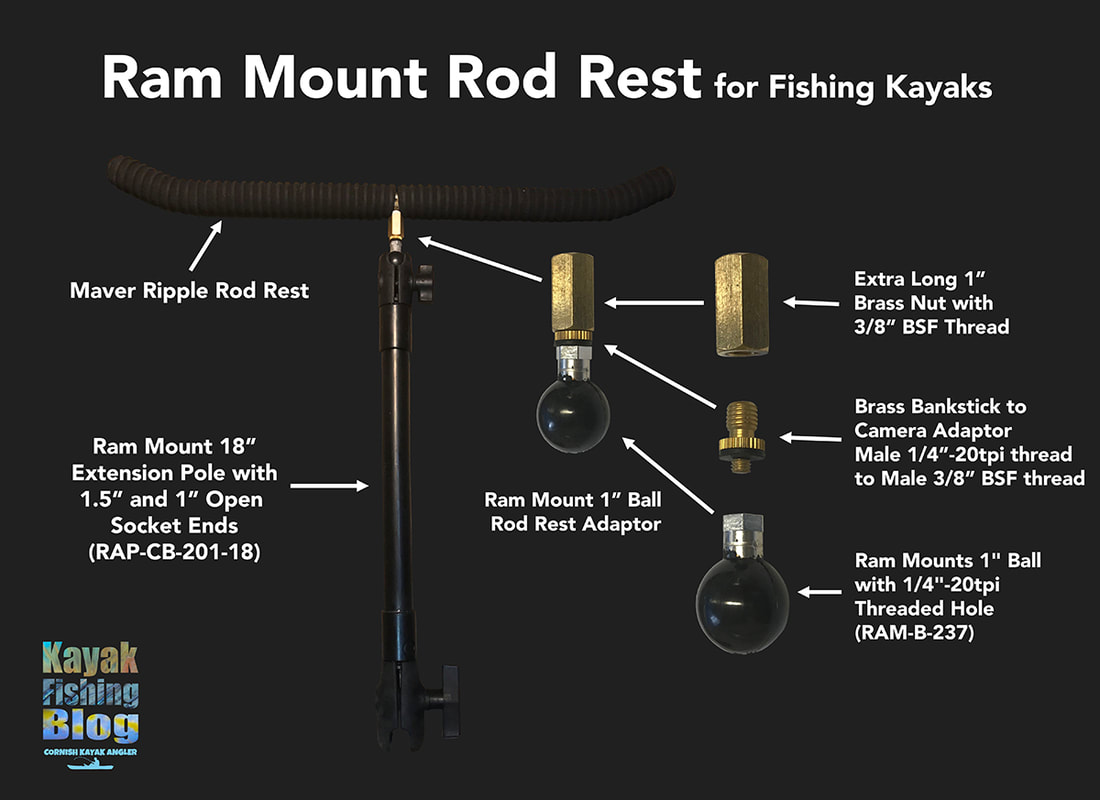 Fitting a Rod Rest to the Revo 16As previously said, all i needed in order to mount my rod rest to the kayak was a 1.5" Ram Ball mounted on the kayak. I had the perfect solution which didn't require any holes to be drilled into the hull. RAM Mounts produce a wedge mount which is designed to fit the sail mount found on Hobie Kayaks! They make this in a 1" and 1.5" version - the 1.5" being the one i needed. Hobie do sell this mount themselves (under the part number 72023015) but it can also be purchased direct from RAM Mount under the part number RAP-354. It consists of a 1.5" rubberised composite ball on top of a split shaft wedge mount, which fits into the Hobie Sail Mount at the front of the footwell. There is a bolt holding the mount together, with the head accessed from the top of the ball. Simply put the mount into the sail mount and screw down the bolt until a solid wedge fit is achieved! The 1.5" Open Socket on the RAM 18" Extension Arm can then be clamped onto this tightly at the desired angle. The Maver Ripple Rod Rest features a standard bank stick thread which is 3/8" BSF (British Standard Fine) thread. This screws into the extra long brass nut with 3/8" BSF thread. To the other side of this the Brass Bank Stick Camera Adaptor screws in - one side has a male 3/8" BSF thread, the other side has a male 1/4"-20tpi thread (standard camera mount thread). This can then be screwed into a Ram Mount 1" ball mount with 1/4"-20tpi threaded hole. Use a small amount of Loctite Thread Locker or Superglue on these threaded joins to stop them from spinning during use. This rod rest assembly then attaches to the 1" open socket end of the Ram Mounts 18" extension pole. The other end of the pole has a 1.5" open end socket which can be fitted to any 1.5" Ram Ball Mount, such as the 1.5" mast tube wedge mount now fitted to the Revo 16. .The rod rest is complete! I can now position my bait rods at a nice low angle for drift fishing and fishing at anchor. When on the rest, the rod butts can be wedged under the Vantage Seat too, as a form of security incase of a hard or fast bite where you may not be paying attention! The rods can be positioned just wide enough apart to work the Mirage Drive too - this is perfect for pedalling in reverse and force drifting baits across the bottom to cover more ground, especially when there is a lack of tide or wind to assist you. The rod rest can be adjusted to alter its height and therefore angle at which the rods sit. Simple, easy and effective.... Job done!