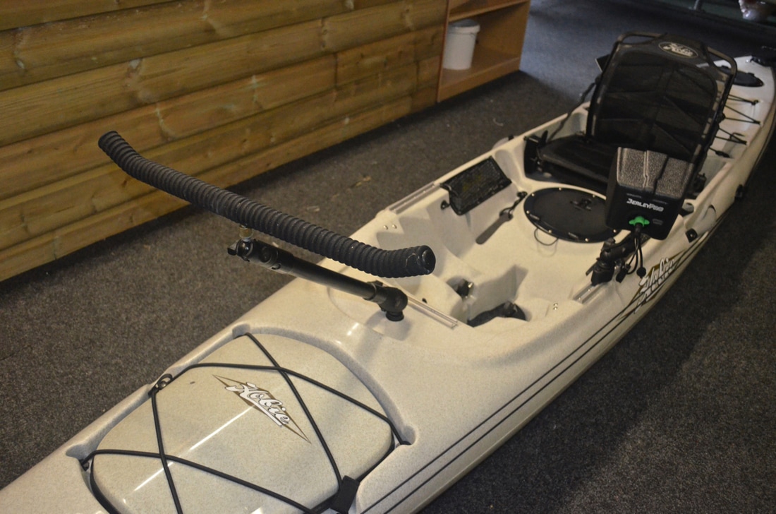 Rod Storage on the Revolution 16The Revolution 16 comes with 2 rear facing flush mount rod holders in the tank well as standard, which are fine for rod storage whilst pedalling, but there are no rod holders at the front of the kayak for when its time to fish. I have installed YakAttack GearTrac either side of the footwell so i can easily attach adjustable rod holders to these if i want to troll rods at right angles to the kayak, however i don't like these style of rod holders for bait fishing. I find them a nuisance to get the rods into and out of quickly when needed. Over the past few years i have been using a DIY Ram Pole Rod Rest on my fishing kayaks and this suits my needs perfectly! It allows for the rods to quickly and easily be put into position and picked up again when needed. It also makes a great place to rest your rods when tackling up, baiting up or unhooking fish. The DIY rod rest is made using Ram Mount components (more detail further in this post). This allows for almost infinite adjustability in the positioning of the rod rest. The rod rest is best mounted somewhere just past the footwell on the bow where it can be positioned at a lower angle. I find that this is perfect for drifting bottom baits and for bottom fishing at anchor, especially in choppy conditions where a more angled rod holder would cause the bait to be bounced more on and off the bottom. The rod holder is constructed in such a way that it can be fitted to any kayak providing there is a 1.5" RAM Ball on the kayak for it too attach too. This made fitting it to the Hobie Revolution 16 very easy. Here is how i done it.... Fishing Kayak Rod Rest Components