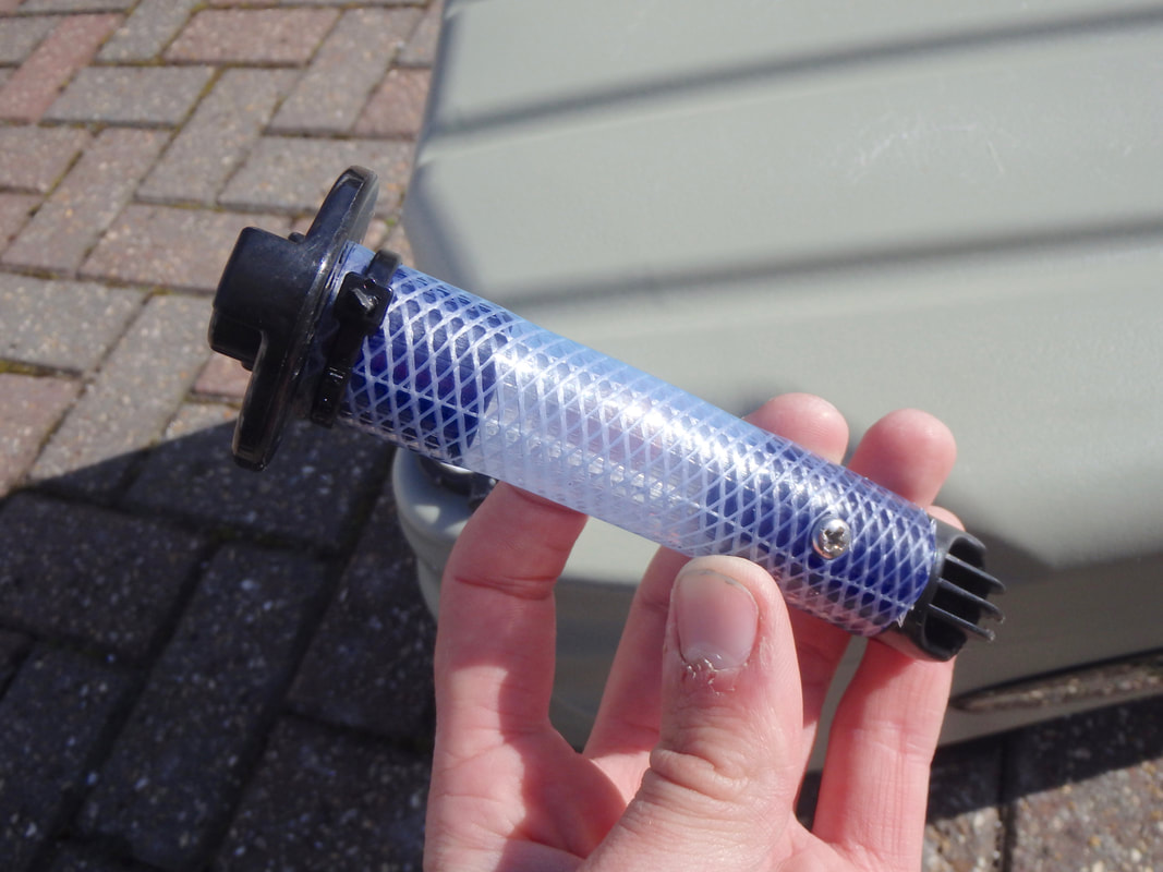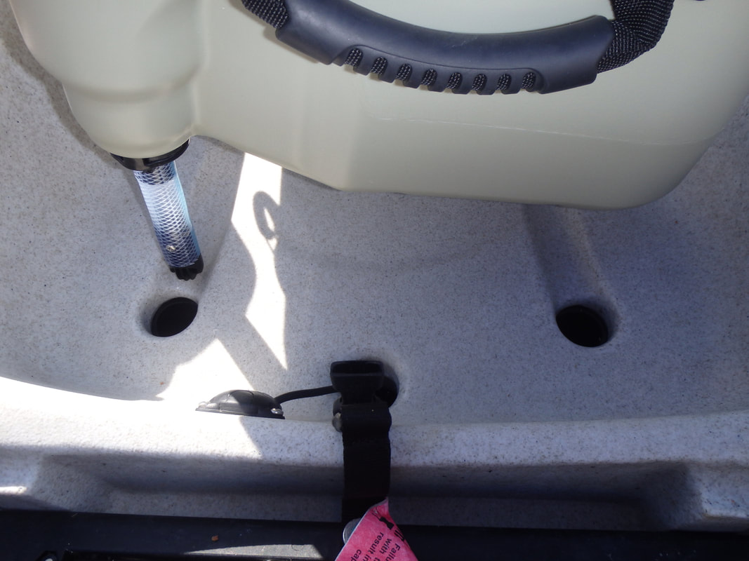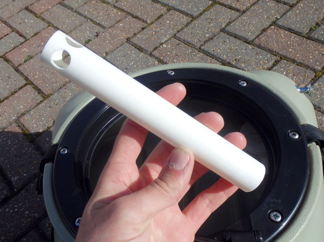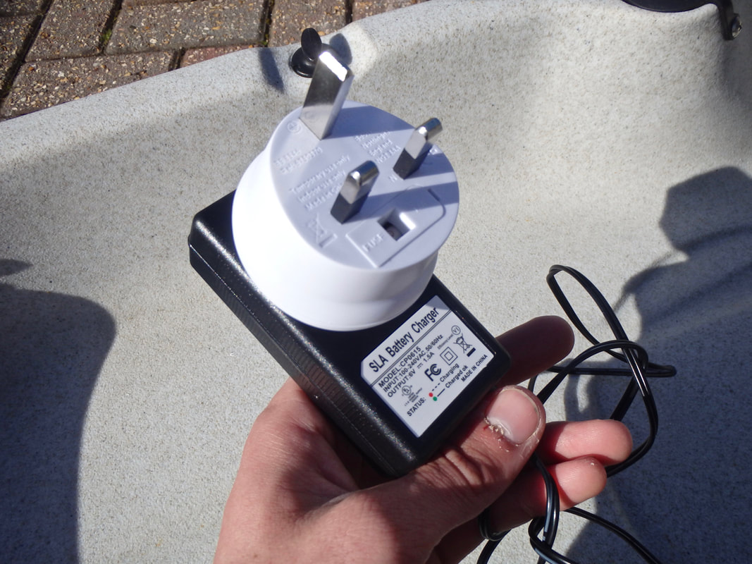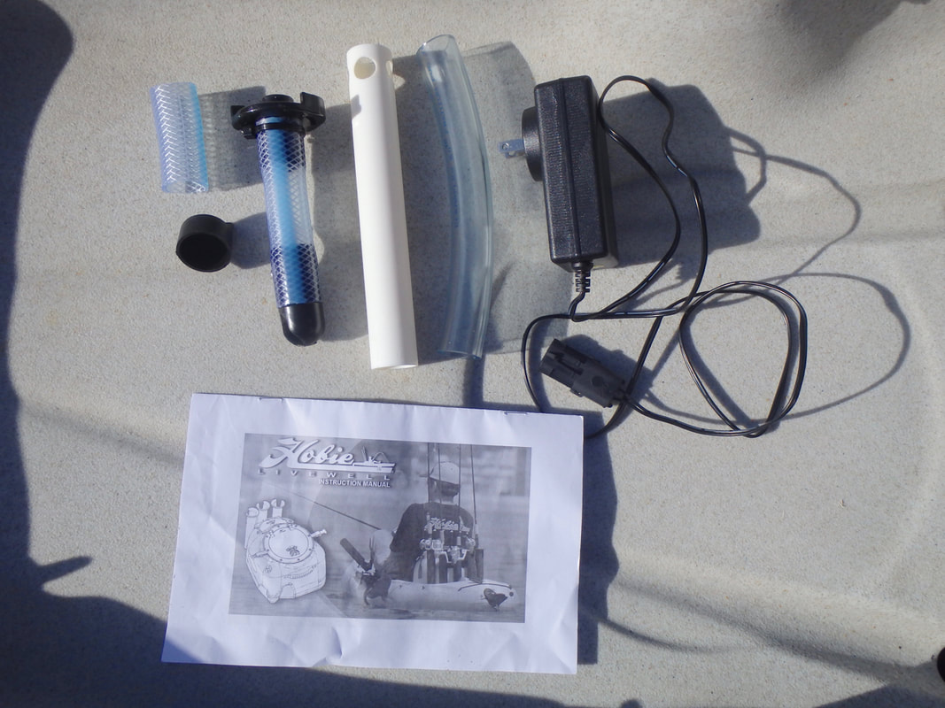 The battery is stored beneath a black splash cover at the back of the livewell. The cover is held on with some bungee. The battery sits within a recess and connects to the wiring circuit via a high quality two-way waterproof connector. An On-Off switch on the side of the live well turns the pump on and off. Pull the switch out to turn the pump on, and push the switch in to turn the pump off. The Livewell also has a drain plug for easy emptying of the last few drops of water that don't find their way out through the pump or outlet hole. Setting up the Hobie LivewellThe livewell and components fresh from the box.... The Livewell is very easy to set up. The only part that needs to be altered for installation on your kayak is the length of the pump intake tube. You are supplied with a length of intake tube that you can cut to size for a custom fit to your model of Hobie. My Revolution 16 has a fairly shallow hull so i needed to cut the tube down. The tube is a push fit over the livewell intake adapter and a cable tie is supplied to lock the tubing in place. NOTE: make sure you orientate the intake filter so that it is pointing forwards to the bow (against the direction of travel) when the intake tube is attached to the livewell. You need to cut the tube so that the black intake end filter just protrudes from the scupper hole for clear unrestricted water flow to the intake. The livewell is now set up and can be attached to the kayak! First attach the intake tube by twisting it into place... Then line up and insert the intake tube into the scupper hole. The livewell can then be secured in position using the attached straps. The straps simply clip to the front pad eyes on the cargo area and tighten down using the integrated strap buckles. The livewell is now installed and ready to use! The whole unit (empty) including the battery weighs in at 12.7lb / 5.76kg, and with the potential to hold up to 8 gallons / 36 litres of water (approx. 37kg of seawater) you can easily add 40+kg to your kayak when the livewell is in use. Be sure to take this into account if you are loading your kayak near it's upper capacity limits. Hobie Livewell in UseI have used the Hobie Livewell on my Revolution 16 a few times now and it really is a great piece of kit. Operation is easy, simply turn the pump on and pedal forwards - this primes the pump and begins filling the livewell with water. I managed to keep 10 average sized (8-12oz) Mackerel alive comfortably for 8 hour sessions. I had the livewell filled around 1/2 to 2/3 full with water. I can see this working great for Sandeels and even Prawns and Crabs too. Having top quality fresh live baits really does help when targeting some species so I can see some very exciting sessions coming this year with the Livewell on the back of the Revo 16! A note for users outside of the USA....The Hobie Livewell battery charger is supplied with a 2 pin USA power plug. If you live outside of the USA then you will require the relevant adapter plug to be able to use the charger in your country. In my case i had to buy the USA to UK plug adapter, which was fairly inexpensive from a local pharmacy. Where to Buy?Cornwall Canoes are an authorised Hobie retailer and stock a wide range of Hobie Kayaks and Accessories. The Hobie Livewell can be purchased on there website - see the following link: Hobie Livewell.
