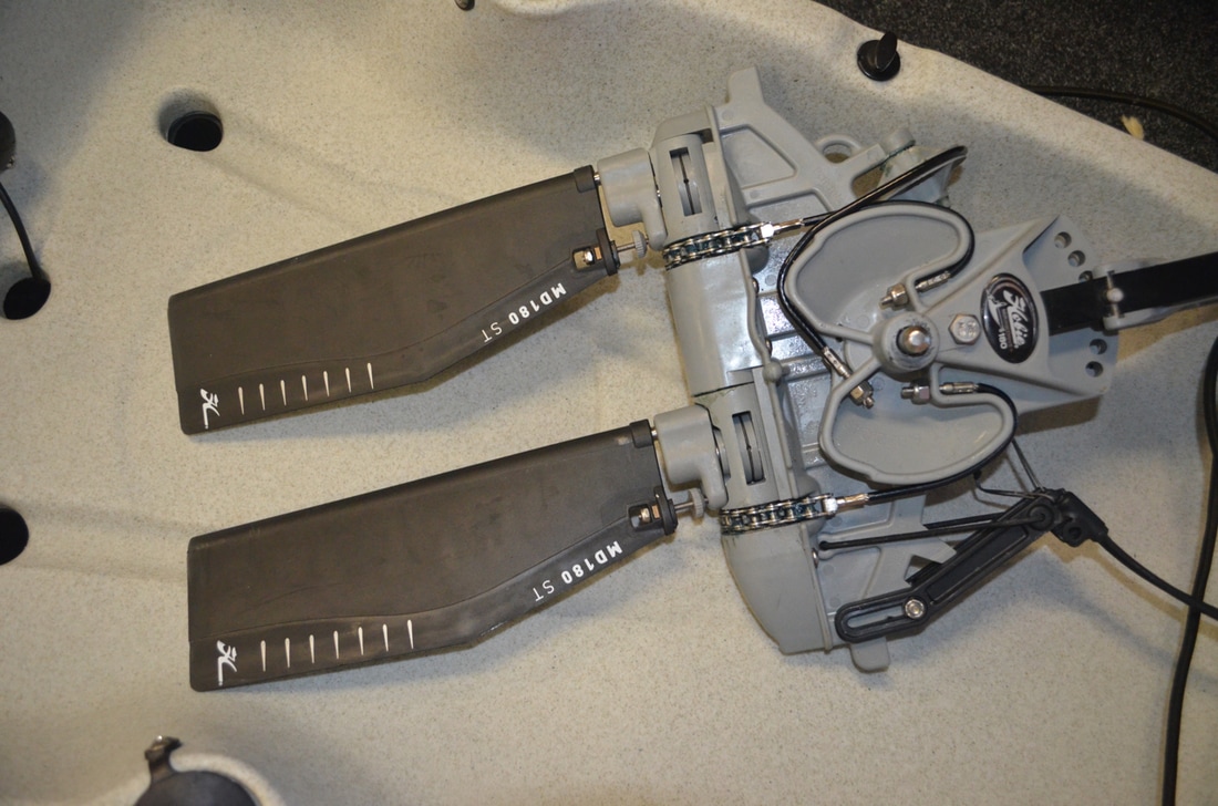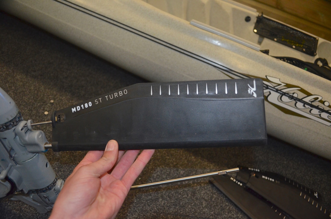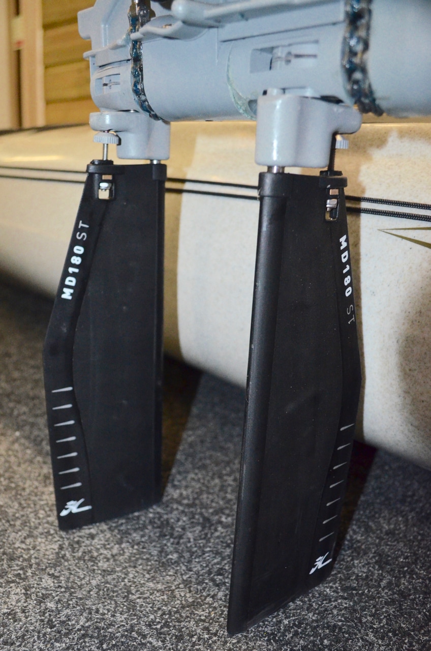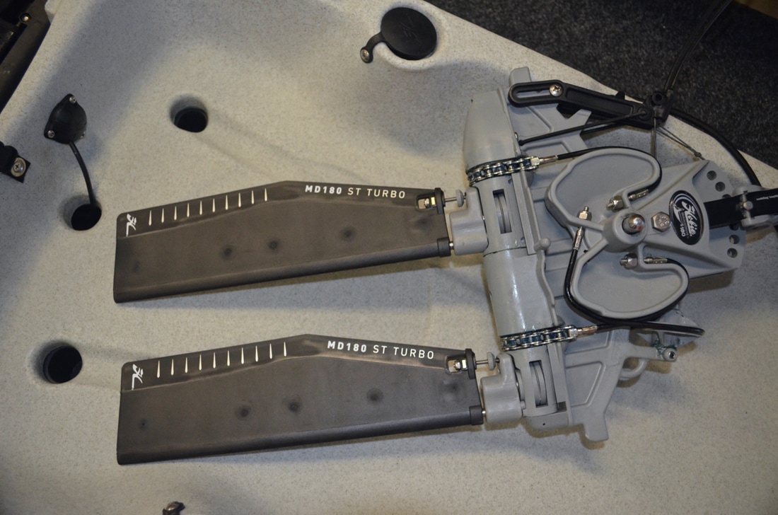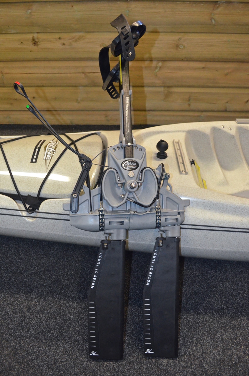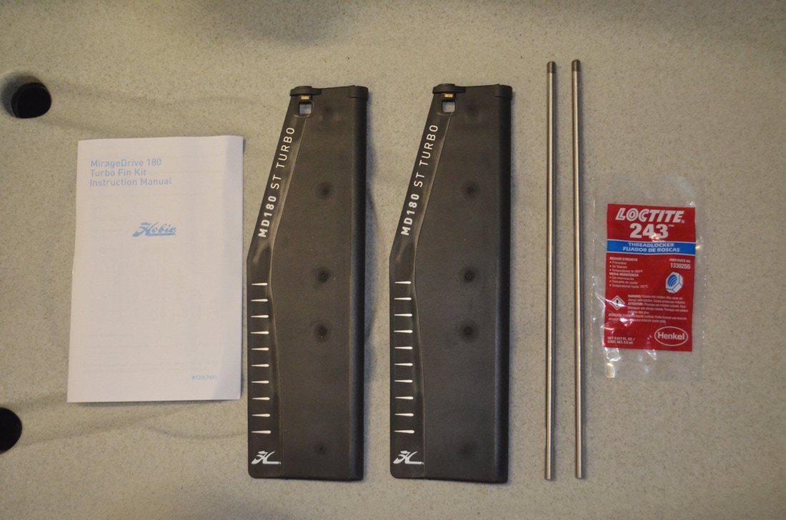 MD180 ST Fin vs MD180 ST Turbo FinNew from Hobie for 2017 is the Mirage Drive 180 - a pedal drive system that has reverse! This comes supplied as standard in their 2017 Mirage Kayak range, Pro Angler range and Mirage Island range. The Mirage Drive 180 that comes with the Mirage Kayak range - including the Outback, Revo 11, Revo 13, Revo 16 and more - comes equipped with MD180 ST (Square Tip) fins as standard. These fins are perfectly adequate to propel the Hobie Mirage Kayak range through the water.... however Hobie do produce a longer, more powerful fin - the ST Turbo Fin! The ST Turbo fin is longer than the standard ST fin. This provides more surface area, and therefore more resistance against the water whilst pedalling, resulting in more thrust! Its not all about going fast though... you can get a greater top end speed and a slower cadence (less pedals for a given distance) for cruising. The ST fins are approximately 260mm long and 90mm wide at the tip, whereas the ST Turbo fins are 50mm longer at approximately 310mm long and 90mm wide at the tip. The ST Turbo Fin is therefore around 4500mm²²² squared (45cm squared) greater in surface area than the ST fin. Over the two fins thats 9000mm squared (90cm squared) more fin pushing against the water, providing more propulsion and power! The is a small disadvantage though - the ST Turbo Fins are a little harder to pedal - but in return provide increased performance. This is one of the most popular upgrades Hobie users carry out to their Mirage Drive kayaks, so it was inevitable that as i could get my hands on a set of the MD180 ST Turbo Fin kits i would be upgrading! Hobie MD180 ST Turbo Fin KitsThe kit come supplied with: