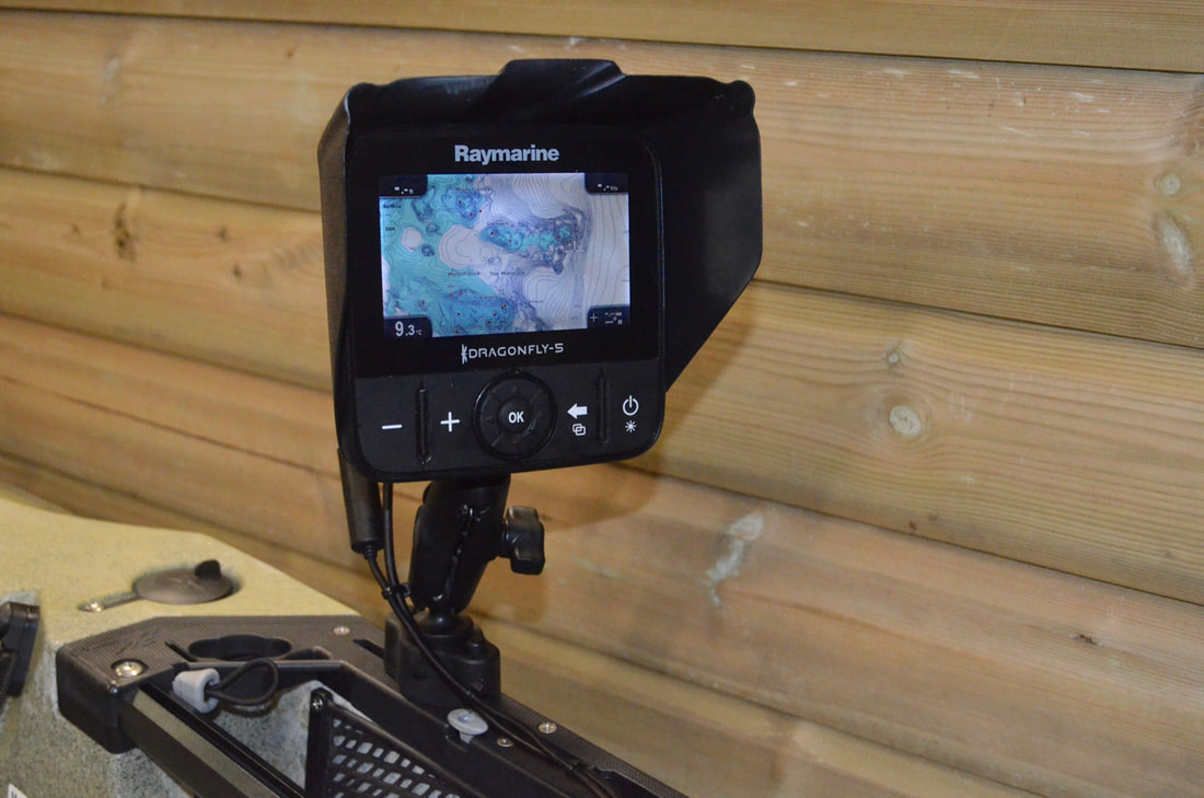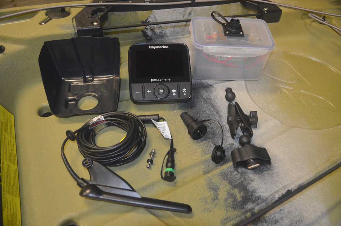 The Raymarine Dragonfly 5 ProThe Raymarine Dragonfly 5 Pro is a fish finder and GPS chart plotter combo unit. The display is bright and clear, and the unit offers both CHIRP (Compressed High-Intensity Radiated Pulse) Sonar and DownVision Imaging. CHIRP sonar uses a pulse of sonar at a range of frequencies to provide greater resolution of objects and the seabed beneath the kayak. It provides greater target separation meaning that it is easier to distinguish between individual fish, between large fish and baitfish and between fish and the seabed. DownVision Imaging uses higher frequencies to provide greater resolution of the seabed structure. When used in combination, and viewed side-by-side on the screen you can get a very good idea of what is going on beneath the kayak. The Dragonfly 5 Pro offers full GPS Chart Plotter functionality allowing you to plot productive marks and drifts, or mark fishy-looking features so that you can return time and time again. GPS provides your vessel speed, vessel heading and allows you to set routes to and from waypoints for easy navigation. As standard you get a very simple land and sea base map, however the unit has a MicroSD card slot to allow you to upgrade the base maps to high detail seabed bathymetry maps. I use Navionics+ charts which offers seabed 'Sonar Charts' at 0.5m contour intervals for incredible detail of the ground beneath the surface. This makes navigation to reefs, drop-offs, sandbanks, holes and other underwater features very easy! The Dragonfly 5 Pro has proved to be an invaluable asset on my fishing kayaks providing me with detailed info on the world beneath my kayak. One Fish Finder, Two KayaksI have been using a Raymarine 5-Pro for several years now on my Hobie Revolution 16 and other kayaks. I now have the new Hobie Mirage Outback 2019 and it was time to install the Dragonfly to my new kayak. I would still be using the Revolution 16 so needed to be able to use the unit on both kayaks. The main head unit can be easily transferred between kayaks, however the transducer and power cable are fitted to my Revolution 16 using the Lowrance-Ready system - details of which are outlined in a previous blog post. In order to use my Dragonfly on the Outback i had to purchase a separate transducer with power cable. Components for Installation