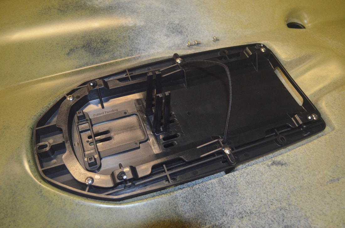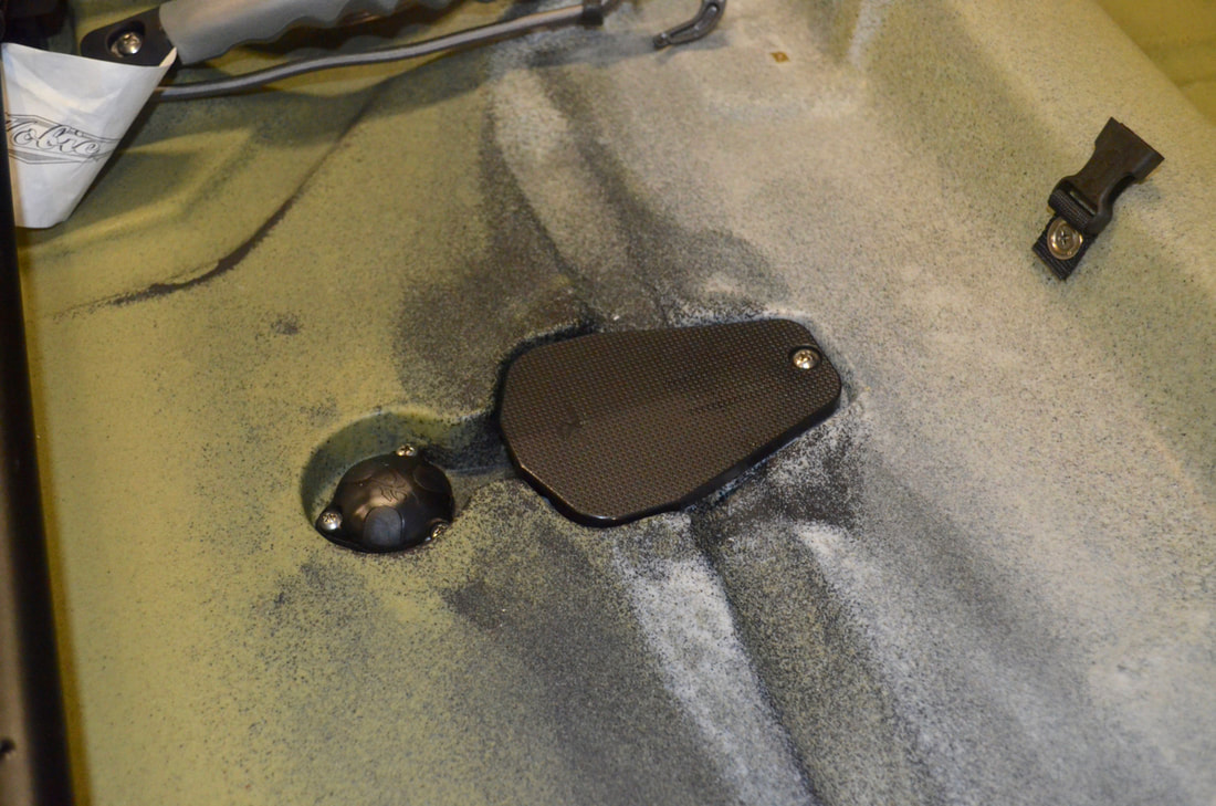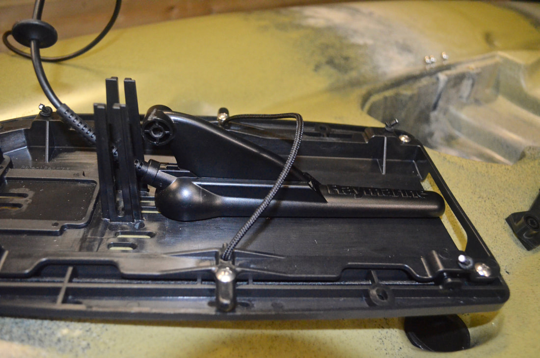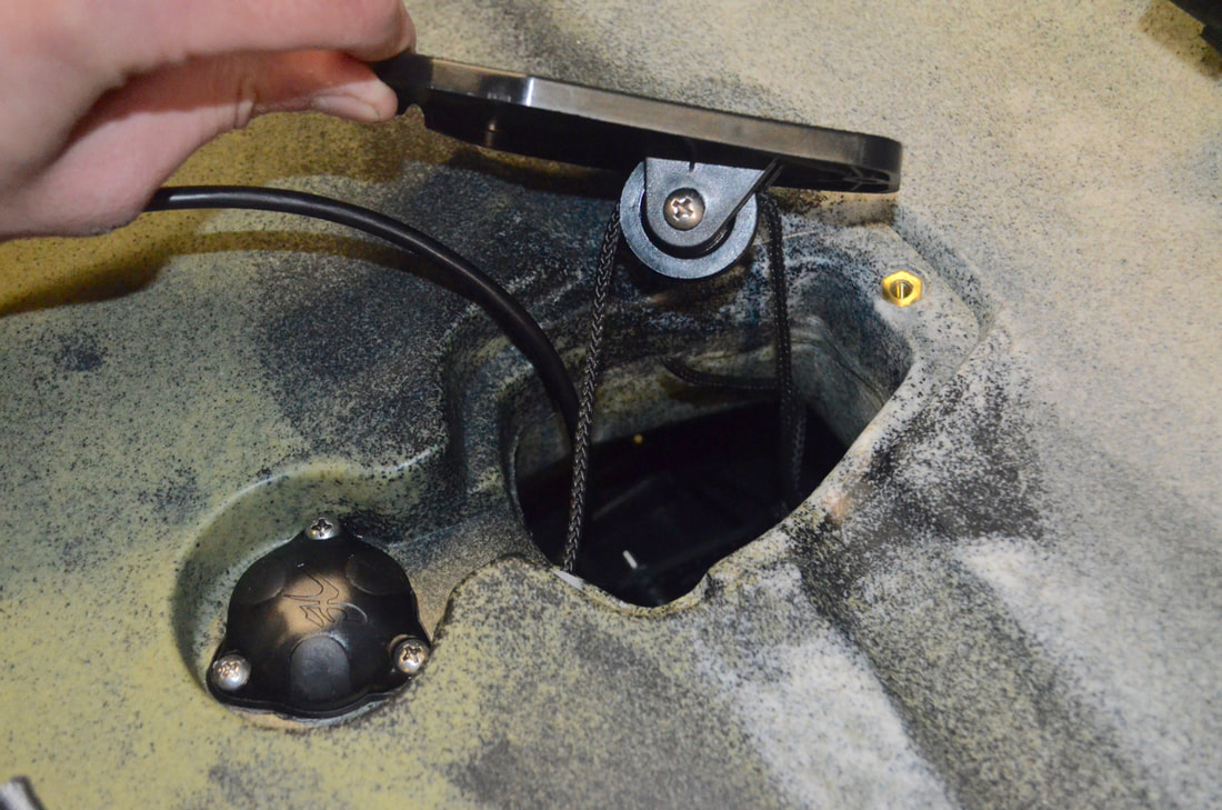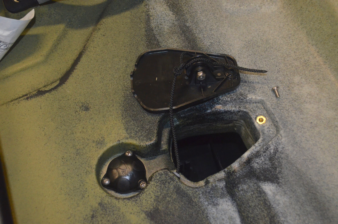 There are 3 main parts to this installation: mounting the main head unit, installing the transducer and wiring in the power supply. I'll start with the transducer... Installing the Raymarine Dragonfly Transducer to the Hobie Guardian Transducer ShieldThe new Hobie Outback comes fitted with the Hobie Guardian Retractable Transducer Shield. This is the latest development in the kayak fish finder installation world, making it super easy to install a wide-range of fish finders to the kayak including side-scan units with large transducers that must sit proud of the hull. These large transducers can be bolted to the bottom of the shield, which sits on a bungee cradle. The shield can be fully retracted within the hull by simply pulling a toggle and cord in the footwell. This raises the shield within the confines of the kayak protecting the otherwise exposed transducer from any damage when launching, landing, transporting and storing the kayak. Standard Dual-Beam, CHIRP and DownScan transducers can be installed on the topside of the shield, completely protecting them from any potential damage. To access the topside of the shield it is a case of unscrewing 3 bolts holding the shield frame to the hull. The recess beneath the shield is pretty big, measuring approx. 35cm x 15cm. The top side of the shield features two upright plastic mounts for transducer attachment. The Dragonfly transducer is fairly long and if placed on the shield the transom mount does not line up with the transducer mountings. Hobie provide a 'universal' transducer adaptor and transducer fittings with the Outback to allow you extend the attachment point forwards or backwards of the mount to suit your transducer. Using these mounts and the supplied bolt, nyloc nut and rubber friction washers it was fairly easy to fit the transducer. The friction washers must be used either side of the transducer mount eyelet so that fine adjustments can be made to its position and when tightened down it will hold firmly in place. The transducer must be raised a few millimeters to allow for water flow between the transducer and the shield. The sonar will shoot through the thin plastic shield with very little loss of resolution. One Dragonfly transducer fitted! It is now just a case of passing the transducer cable to the deck side of the kayak through the transducer scupper hole. To access this, a black cover plate must be removed beneath the seat. The cover is held on with a single screw and removing the plate reveals a pulley and cord. This is the cord which operates the retractable aspect of the Guardian Shield. As standard this is not connected to the shield and just tied to the pulley. To activate the retractable sheild you have to remove 6 screws from the top side of the shield, holding the central plate to the frame. Once undone the plate will retract on a bungee system. The cord from the pulley can be tied to the bridle on the plate to complete the system. When the transducer toggle is pulled in the foot well the shield will raise up into the hull. I do not require the retractable option so have left the 6 screws in-situ. Simply pass the transducer and power cable up through this scupper hole onto the deck and then screw the Guardian Shield back onto the hull. The transducer and power cable must then be passed back into the hull through the 3-Way Thru Hull fitting located just forwards of the cover plate. Simply unscrew the 3 small self-tapping screws holding this to the kayak. The thru-hull fitting features a rubber gasket and a design where three rubber plugs can be removed and replaced with cable seal plugs. The Outback is supplied with numerous plugs with various diameter holes to work with various power/transducer cables. It is just a case of finding the correct one for your cable and placing this around the cable and slotting it into the thru-hull fitting. Screw the fitting back onto the hull and the transducer is now fitted to the kayak. Super easy! Wiring in the Fish Finder Power SupplyPrior to connecting up the power source i needed to decide which side to mount the fish finder, as i would have to pass the connector and cabling out through a thru-hull fitting on the chosen side. I opted to fit the unit on my right hand side. The first step was to remove the 3-Way Thru-Hull fitting fitted in the side storage area of the cockpit beside the hookless pocket. The connector that plugs into the back of the unit can then be pushed through the hole beneath the fitting, from the inside of the kayak out onto the deck. You can gain easy access to do this through the centre hatch. It is then just a case of selecting the right size rubber seal to fit around the transducer and power cable and fitting the thru-hull plug back to the kayak. Easy! Just remember to pull enough cabling through to allow for the connector to reach the unit wherever you wish to mount it. I left enough spare so that the fish finder could be mounted at the furthest point on the outside H-Track if needed. As usual there is loads of excess transducer cable now in the hull. I tidied this up using a couple of cable ties and attached it to the scupper hole to keep it out of the way. Time to attach the power source. The Dragonfly runs off a standard 12V power supply, and most people opt for a rechargeable sealed lead acid battery. I have recently moved over to using a Lithium-Ion battery, which are much lighter than the lead acid batteries, thus saving important weight on the kayak. I have put together a complete guide on how i built a waterproof lithium battery box which can be viewed by clicking here. This battery box uses a Index Marine Bulgin 2-Pin Waterproof Socket as a connection point. I would need to fit a Bulgin 2-Pin Waterproof Plug to my fish finder power lead to allow me to connect to the battery box. Take note of the grey wire - this is a drain wire and is not required for installation on a kayak, i trimmed this back to the outer wire coating. These plugs offer a wa