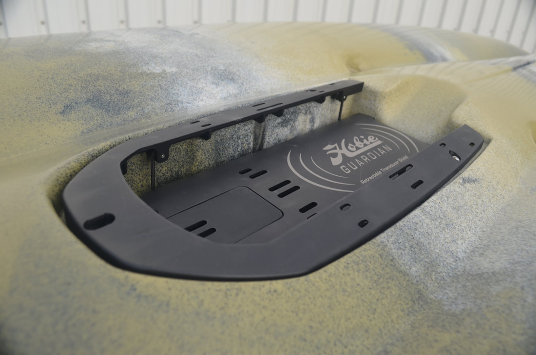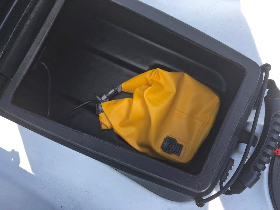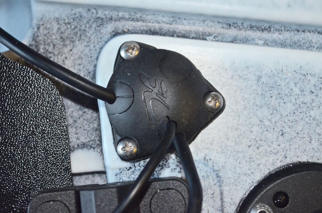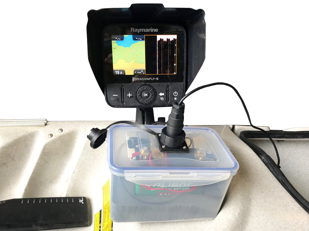 In-Hull TransducersIt is possible to bond many transducers against the inside hull on a kayak. The transducer will shoot sonar through plastic and composite kayaks with minimal loss of reading clarity. This will not work with more complicated side-scan transducers, but for standard sonar / downscan transducers, this method works fine. To bond a transducer to a kayak, you will need to encase the transducer in a suitable adhesive which will give a strong hold to the plastic or composite surface. Flexible adhesives are preferable as they are less likely to 'pop off' the surface if the plastic flexs. I recommend Sikaflex EBT+ Clear, but others use adhesives such as CT1 or if you can get hold of it, E6000 or Marine Goop. You will need to make a ‘transducer well’ from a piece of high-density foam – a gardeners kneeling pad works well. Cut out a rectangle of foam that is approx. 60-80mm longer and wider than your transducer. Draw around your transducer allowing a 10mm gap around its outer edge. Cut out this shape from the foam. This will need to be glued against the inside of the hull, on a flattish area roughly on the centre line, and allowed to dry to form a sealed well. Inside the bow hatch usually offers enough space and easy access to do this. It usually pays to scratch up the area on the inside of the hull where you will stick this so that the glue has a rough surface to bond too. You can then fill the well approx. 2/3rd's full with your chosen adhesive. It is important to ensure there are no air bubbles trapped within the glue, as these will cause sonar reflectance. If bubbles are present, use a thin sharp instrument to scrape these to one side or out of the glue. Once clear, the transducer can be firmly pushed down into the glue and against the hull of the kayak. Leave the kayak and transducer level and allow the adhesive to cure, which usually takes 24-48 hours. Once cured the sonar will be able to shoot through the solid glue and kayak hull without issue. If air bubbles have found their way beneath the transducer these will usually show as vertical white lines of interference on the display when on the water. If this is the case, the transducer will need to be removed, glue peeled off and the process started again. With the transducer installed inside the kayak, you will need to run the cable up to the main unit on the deck through a waterproof cable gland. Scanstrut and Hobie offer various size cable seals that are perfect for the job. Powering a Fish FinderFish finders will run off a 12V power supply and the most practical power source on a kayak is a battery. Rechargeable Sealed Lead Acid (SLA) batteries are most popular, and are available in various sizes. A 12V 7Ah SLA will power most units for a couple of sessions before charging is required and these batteries can be brought for around £20. Some larger more demanding units will need a larger battery of 10Ah or more. Use a simple 12V trickle charger to recharge these batteries, which can be found for around £20. Store the battery inside a dry bag or waterproof box to keep your power source dry. Whilst a waterproof battery box requires a little DIY to put together (click here for a guide to make one), a simple 5L roll down dry bag is sufficient to keep a battery dry on-deck on in the hull of a kayak. Simply place the battery into the bag and position the power lead to one corner of the opening. Gently roll down the top of the bag several times to form an overlapping seal and clip the bag latches together to hold the seal in place. Most kayakers opt to store the power source on the inside of the kayak, running the power cable up to the main unit through a waterproof cable gland. If an in-hull transducer install has been used then both the transducer and power cable can be passed through a single cable gland such as a Scanstrut DS30-P Medium Seal. You could also store the battery box or bag on the deck - if you choose this option then ensure that the box or bag is secured well to the kayak incase of capsize! Fish Finder VisorsYou can improve your fish finder set up by adding a visor. There are a number of advantages to using a visor including: