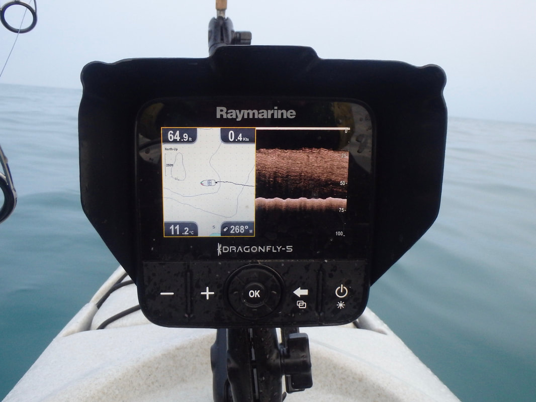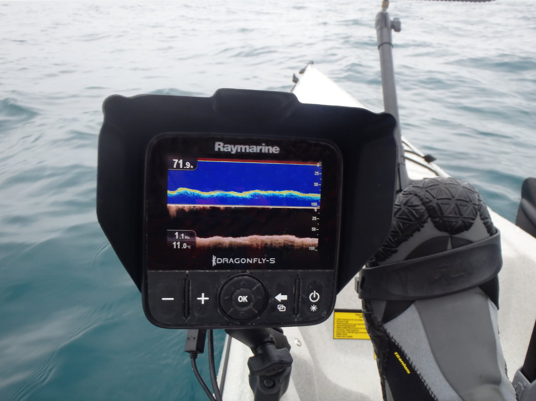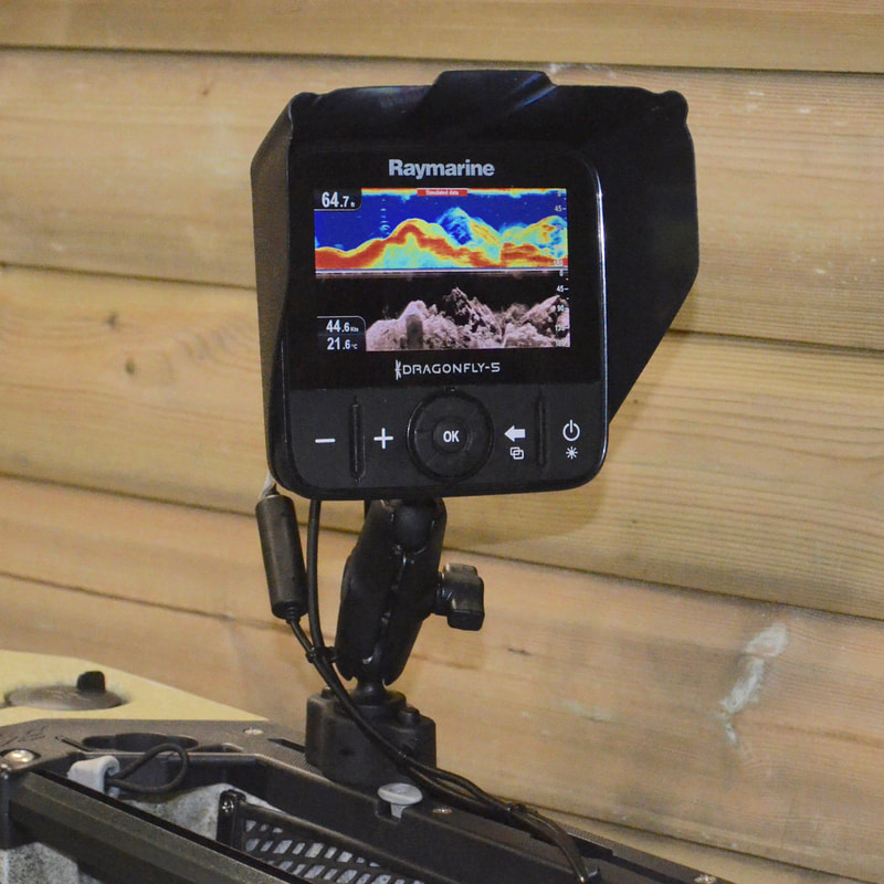 There is no doubt about it, having a fish finder on a fishing kayak is a game changer. It gives you an insight to the world beneath your kayak, which would otherwise be largely unknown. Find reefs, drop-offs, gullies, plateaus, sand-banks and other fish holding features. Tell the difference between soft ground and hard ground. Know the depth you are fishing in, the water temperature and if there are any fish showing within the water column beneath the kayak. The information provided by a fish finder will ultimately allow you to fish more effectively and result in more fish to the kayak! Some may say it's cheating but most of us are in the kayak fishing game to catch fish and if there is a device that will put you onto more fish then it's a worthwhile investment! Fish finders as standard are designed for use on boats and a little head scratching is often needed to fit one to a kayak. Luckily there are several ways to go about it with off-the-shelf accessories to make fitting a fish finder to your kayak much easier. Which Fish Finder for your Fishing Kayak?Lowrance, Garmin, Raymarine and Humminbird all produce fish finders with models to suit the occasional user to the hard-core angler. A standard entry-level unit will have a 4-inch colour display and use broadband sonar to show the bottom structure and any objects within the water column. Some models also include basic GPS plotting functionality allowing you to add your favourite fishing spots and launch marks to a simple base-map. These units are what the majority of kayak anglers will opt for as a first fish finder and at the time of writing the Lowrance Hook2 4x GPS and Garmin Striker Plus 4 are popular choices. These units can be found in the £100-150 price range here in the UK. Fish finder prices increase as they become more feature-rich with larger displays, DownScan Imaging, CHIRP Sonar and GPS chart plotting functionality. Larger 5 and 7-inch screen sizes allow you to study the detail on screen more easily, and are useful if you are using a split-screen mode e.g. showing sonar readings beside a GPS chart. DownScan Imaging offers a higher resolution of the seabed structure than is possible with standard sonar and is great for locating fish-holding structures. CHIRP (Compressed High-Intensity Radiated Pulse) sonar uses a pulse of sonar at varying frequencies to provide a more detailed reading of the seabed and any fish within the water column. This provides a clearer image and better target separation making it easier to distinguish between individual fish, large fish and bait shoals. GPS chart plotting functionality allows the user to view their GPS position and this can be used to plot marks, tracks and routes onto a base-map. This has obvious benefits for marking features or productive fishing spots and drifts so that you can return to them. You can also see your speed over ground and bearing which is also useful for navigation. Base maps can be upgraded to highly detailed seabed charts, such as those from Navionics, providing the user with incredible detail of the ground in their vicinity. This makes navigating to marks that look productive very easy. GPS information is also plays a role in staying safe on the water - you can navigate yourself to the shore or your launch mark should you find yourself in fog, you can see that you are making ground against adverse conditions, know when you are drifting at a speed or direction that may cause trouble, and see your GPS position clearly incase you need to relay this in an emergency. Fish finder units with 5+inch displays, CHIRP Sonar, DownScan Imaging and GPS chart plotting with upgraded Navionics+ charts will set you back over £500, but you will have an incredible source of information at your disposable whilst fishing on your kayak! Popular units with such specification include the Lowrance Hook2 Combo models, Raymarine Dragonfly Pro series and the Garmin EchoMap series. Whichever fish finder you opt for, allow at least an extra £50 for accessories you will need to fit it to your kayak. Installing a Fish Finder to a KayakThere are three main parts to consider when installing a fish finder to a kayak: