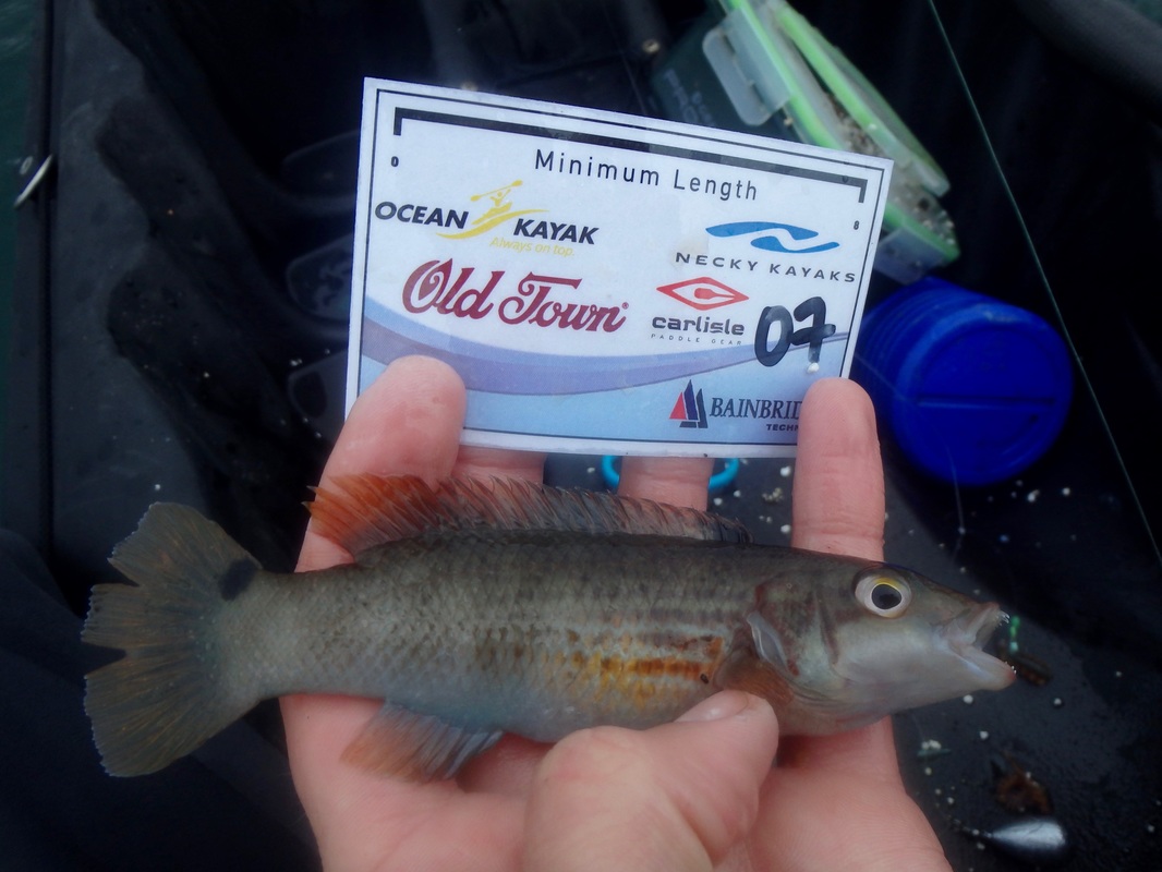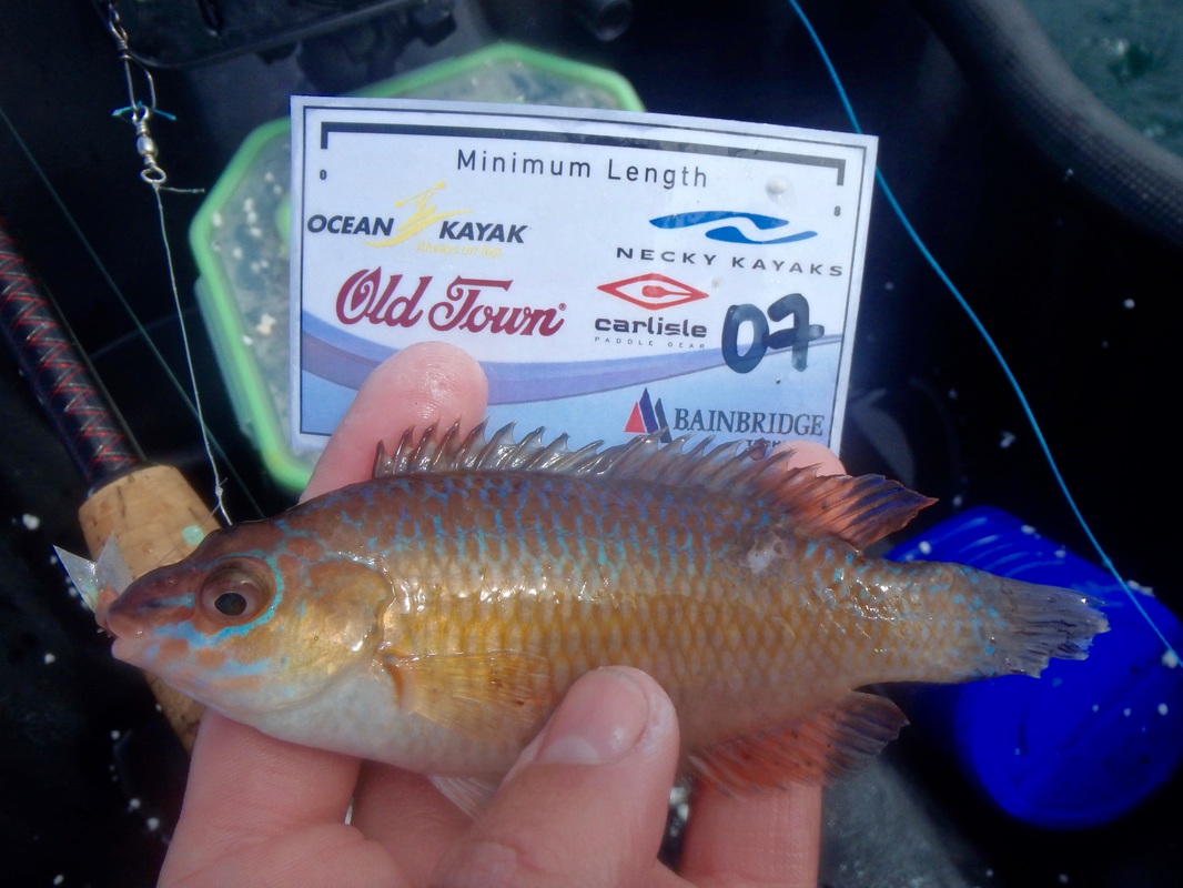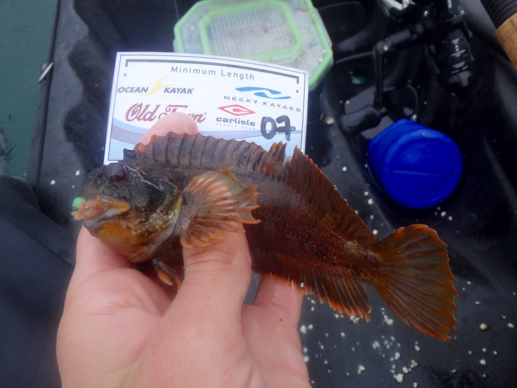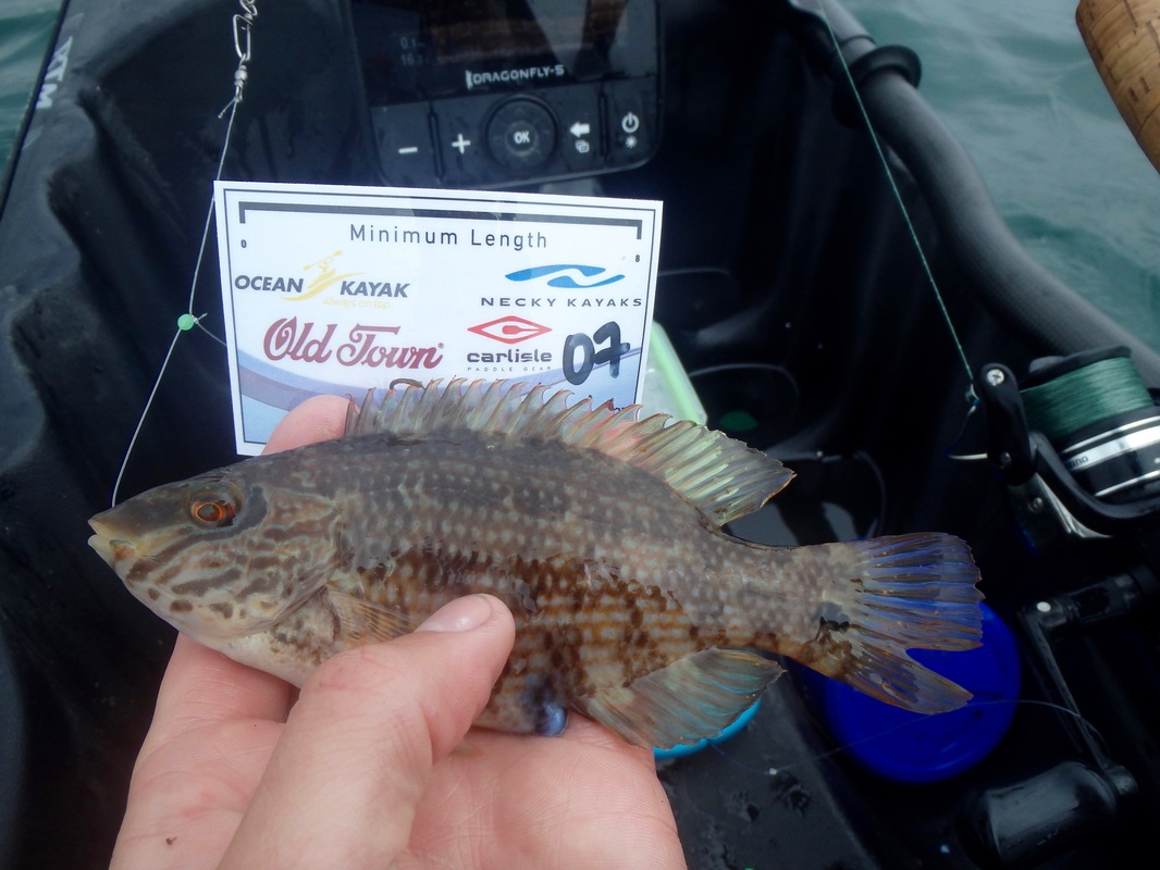 With Swanage only a few weeks ago, being busy at work and a few evenings spent on the water i found little time to prepare for this competition. I wasn't too worried as i had a good idea of where to fish. I brought a load of Sabikis to save me having to make any rigs too. Bait was ordered early in the week with Seaview Angling, which would be at the venue on the day, so that was me ready for the comp! An early start on Saturday saw me down at Mountbatten Centre prior to the registration to give me plenty of time to get ready and sort my gear out. A few others were also there and were keen for coffee so i headed off to the cafe at the centre with Ben, Mark, Martin, Steve and some others. Conditions were looking very very good, quite a difference to the strong winds of last years competition.... Caffeined up and ready to rock it was back to the car to sort the gear out and set the kayak up. It was really warm, overcast and muggy warm. Too warm for a cag so it was on with the Palm Atom Bib and Kaituna Neoflex top, my favourite combo to wear during warmer weather. Time soon passed and everyone was gathering on the slipway ready for the safety briefing. The competition is organised by the Ocean Kayak Fishing Team and soon enough Keith, Ian and Dane were giving the Safety briefing to the entrants. Safety boats would be on the water to assist anyone if needed. Safety talk over and it was time to get the kayaks in the water ready for the start. Everyone lined up in the designated area awaiting the starting bell. Snapper had his camera out.... I do enjoy the 'on-water' starts. The water erupts around you as everyone powers off. With everyone at close quarters it can become a bit cosy amongst the pack of flying paddle blades... a lump of Jackson shaped kayaks clashed together with a Viking shaped one and rather than get caught in them i held back and went around the outside allowing me to get slightly ahead by the time they had sorted out their love affair! 3 Tempo's led the way out to Mountbatten breakwater. I stopped right off the end of the pier and dropped anchor. That would do for me. A few more anchored around me and others carried on to Plymouth Breakwater approx. 1.5nmi further offshore. Species number 1 came to the kayak as the last of the bunch were still paddling past.... A Corkwing Wrasse. As with other species comps, the OK Classic works on a catch, photo and release basis with any species counting providing they are over 8cm long (with the exception of Mackerel and Sandeels). Each angler gets an entry card with scale on to include in each photo to prove that the fish was caught on the day of the comp and is over minimum length. Species number 2 soon followed... A Ballan Wrasse I was getting lots of bites which is always a good sign. Number 3 was soon on board... A Goldsinney Wrasse Well that was 3 easy species, i would need a few of the more uncommon species to stand a chance of placing. Plenty more wrasse were taking the baits and then species number 4..... a Poor Cod And then Number 5... A Pollack 45 minutes in and I have 5 species.... i was feeling positive, but then if i have caught 5 species then others wont be far behind if they are behind at all. Looking around i could see plenty of small wrasse being caught so others were obviously catching well too. Lets hold out here in the hope of some more species.... 5 minutes later a fat Tompot Blenny was on the bait, species number 6. Im starting to think that I'm running out of species over the mark I'm on when something different is fighting on the end of the line. A flash of silver near the surface and i have pulled it on the kayak quickly before it gets a chance to flick off. This one is a bit more uncommon... species number 7 - a Sand Smelt.... I now debated whether i was going to find any new species on this spot as nearly every fish now taking the bait was a Corkwing or Goldsinney Wrasse. There is another Wrasse species that can be caught in the area and thats the Rock Cook. A tiny wrasse that i can't seem to catch from the kayak despite others being able to catch them around me. After wading through more Corkwings a small fluttering fish was on the hook, as it neared the surface a flash of its golden body and blue tipped fins gave away its identity but before it reached the surface it had unhooked itself.....NOOOOO! That might have been my only chance of seeing a Rock Cook today. 10 minutes later and order had been restored in the Wrasse department as i brought my first kayak caught Rock Cook Wrasse and species number 8 onto the kayak! They really are a stunning little Wrasse, the photograph doesn't really do it justice. Awesome! Now i need to move but where too. There are Red Band Fish out near the breakwater and they were easy to catch last year. Its a long paddle but i needed a few more species to stand a chance at getting amongst the top placings. Up with the anchor which was thankfully not snagged despite the bottom being as really rough and snaggy. Time to paddle! Half way out to the breakwater and I'm praying i get a few more species out here because its a further paddle than i remember from last year! Eyes on the fish finder looking for shoals of fish....nothing. Paddle around some more near the breakwater.... nothing. Sabikis down anyway.... nothing. Choice words were said and after about 45 minutes of fishing out by the breakwater without a bite i raged back to Mountbatten pier furious at wasting an hour and half. I paddled full pelt all the way back without missing a stroke. The sun was out and the cold water was looking very inviting! I anchored back near the pier and bites came straight away as before. More of the same though so it wasn't long before i moved to try the other side of the pier. A good move as i found species number 9... a Black Goby - another first from the kayak. Then it went quiet. Nothing more than a couple of Corkwings showed themselves in the next half hour. Time to head in. Surprisingly i was 2
