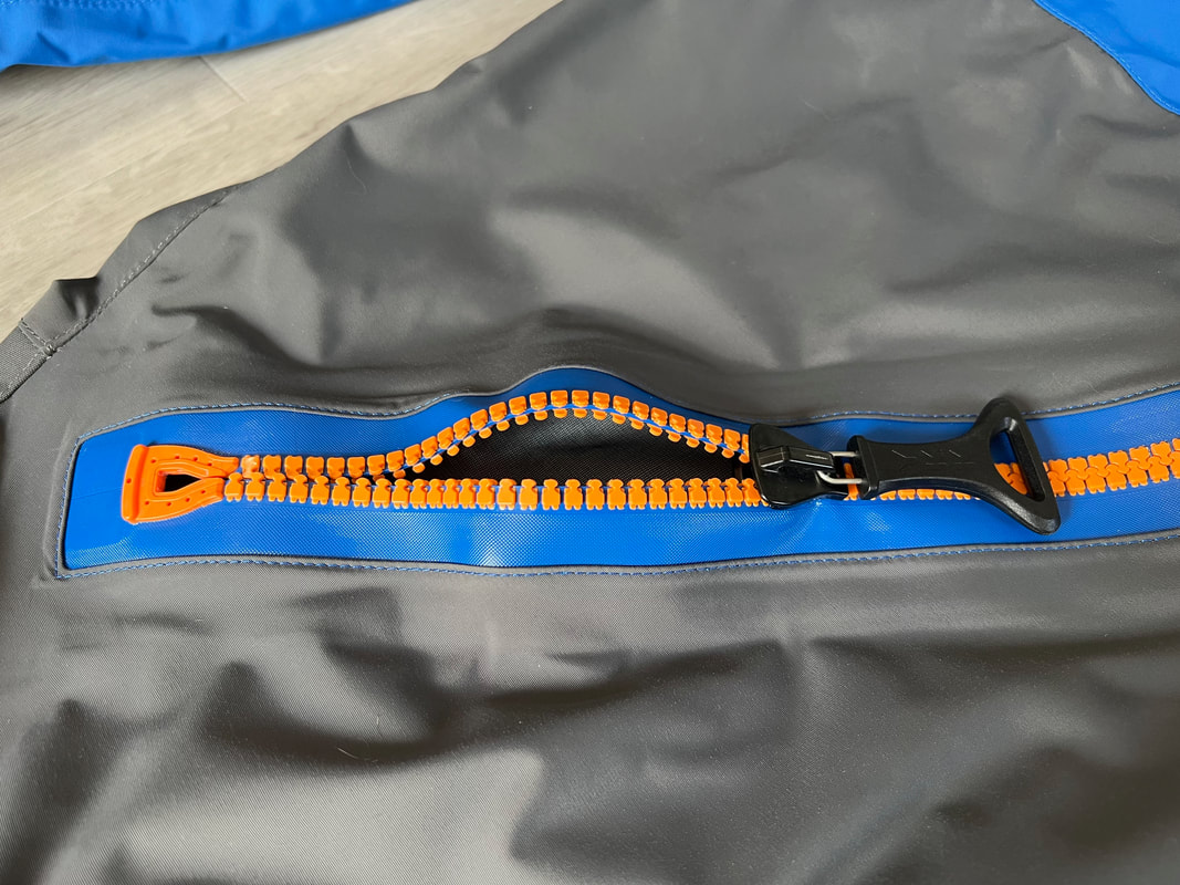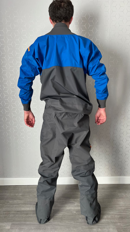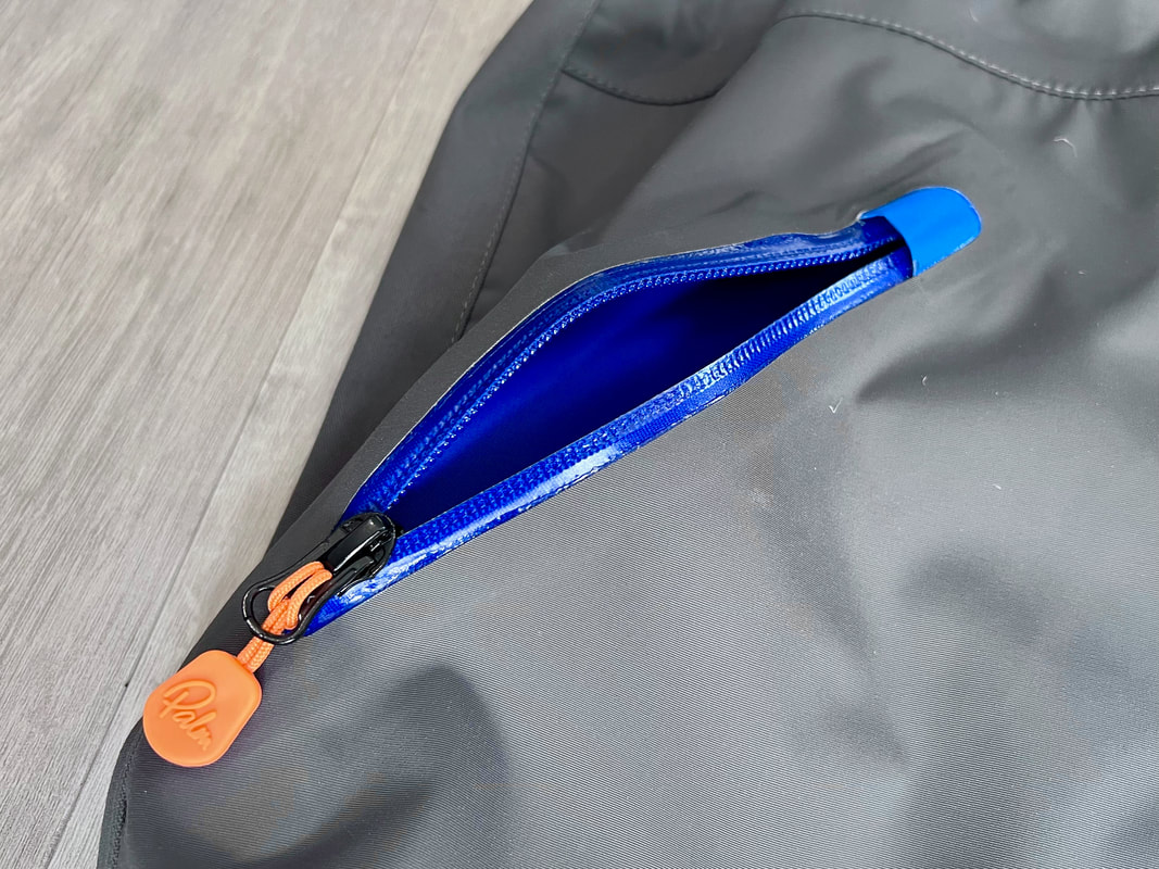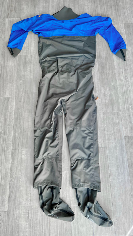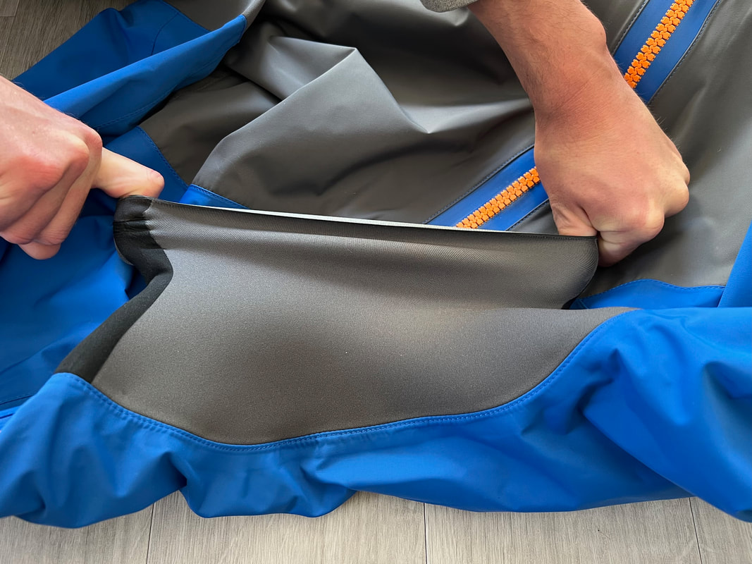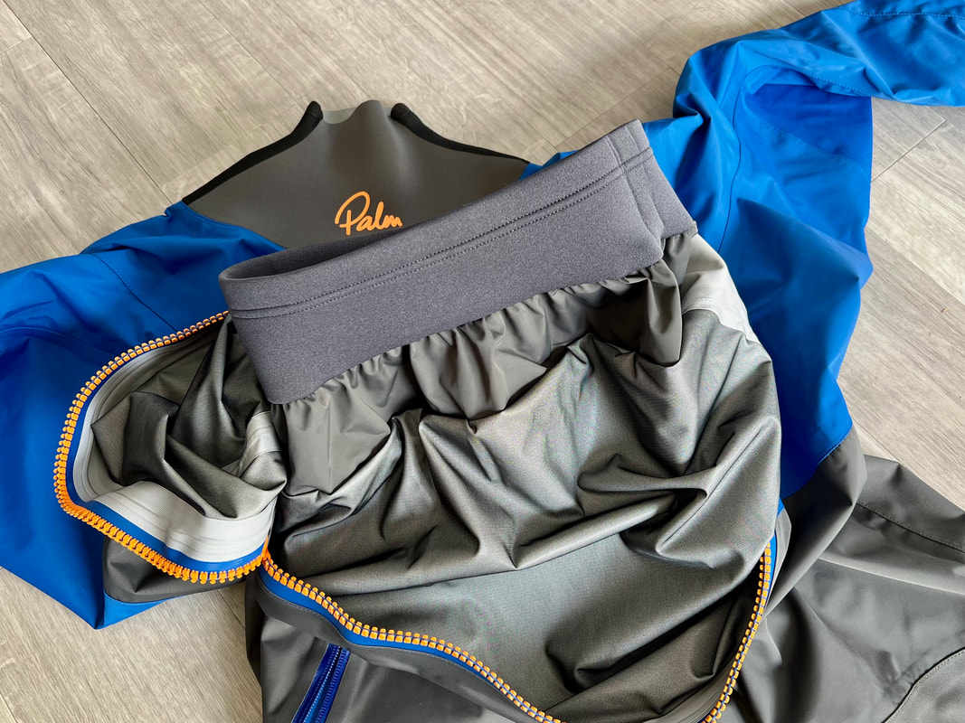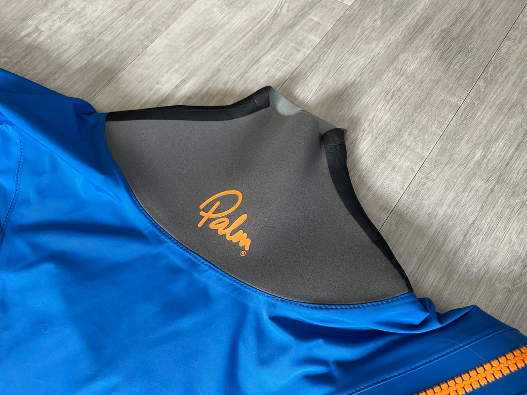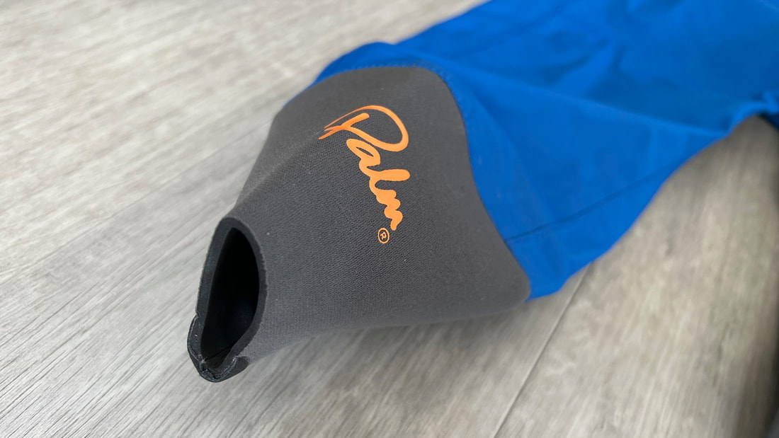 A close look at the Palm Rogen SuitWell, it's not yellow! Yellow fabric stains easily. Blue shows up stains less. Grey even less again. Blue and grey are good for kayak fishing. My red Bora Jacket doesn't get too bad either. There is a caveat here though. Blue and grey are not the most visible of colours so for the safety conscious out there, you may be thinking that the Rogen is not the most vibrant. Wearing a bright coloured buoyancy aid (PFD) would work well to enhance your visual visibility on the water. I'm happy with the colour though. The blue colour being across the top of the torso is well planned - this is the part of the suit that is most visible when you are wearing a PFD. Whilst the Rogen is stripped back to the essential features, you still get quality materials and construction. The suit is made from a 4-layer recycled material that is both waterproof and breathable. Breathable drysuits are good. It can get quite humid in a drysuit when you are hard at work paddling. Breathable material allows for water vapour to pass from the inside of the suit to the outside, and the waterproof nature of the fabric prevents water ingress at the same time. You wouldn't want to paddle in non-breathable drysuit! The Rogen features an Ultrastretch Neoprene neck seal. Neoprene is the material of choice for touring drysuit neck seals. Latex is the material of choice for whitewater drysuit seals. Neoprene tends to be less irritable against the skin than latex, and therefore more comfortable to wear for long days on the water. The neoprene has a smooth facing on the inside making it easier to slide the seal over your head. The seams are glued, taped and reinforced. That neck opening looks small though.... It lives up to it's name of Ultrastretch Neoprene though! This sits snug against the skin to stop water ingress. We find the same Ultrastretch Neoprene at the wrist seals. The Rogen has a front-zip entry by means of a diagonally-fitted YKK AquaSeal zip. It runs from the waist to the back of the shoulder. This is a flexible plastic zip that is easy enough to open and close without too much effort. Much easier than the shoulder zip on my Bora suit anyway, purely due to its location. The front zip makes it really easy to put this suit on and take it off. I like the contrasting zip colour, it adds a touch of style to the Rogen.... because we all want to look great on the water! Plastic zips are great, They require very little maintenance. Palm do supply a small tube of lubricant with the suit to periodically apply to the zipper to keep it running smooth, although making sure the whole suit is washed off with fresh water after each use is the best form of maintenance to keep things in good condition. There is a pocket located on the right hand thigh, accessed through a YKK AquaGuard zipper. A handy place to have a pocket. Many drysuits have pockets on the front torso and these are fairly inaccessible once you are wearing buoyancy aid. The thigh pocket offers plenty enough space to store a phone, camera or other small essentials. This is not a waterproof pocket though, splash-proof at best, so if you are keeping your phone in here, make sure it is a waterproof model or stored within an Aquapac waterproof phone case. There are three small laser cut holes in the bottom corner of the pocket that act as a drainage point. In the lower half of the Rogen we come to another important feature - reinforcement. Some areas of a drysuit will be subject to more wear and tear than the rest, in particular the seat, knees and lower legs. These tend to be areas that are likely to rub against the kayak the most and here we find reinforced 320D nylon panels to increase durability. The soles of the fabric socks are also reinforced. Fabric socks are great. Your feet stay dry beneath, meaning that you can wear a decent pair of thermal socks under the drysuit. This is a game changer for winter kayaking! Keeping your feet warm can be a challenge, and once they are cold it is difficult to warm them up again and it can then make for an uncomfortable time. At least with fabric socks, you can layer up and give them a chance of staying warm! Fabric socks are a weak point on any drysuit though - they can be subject to high wear and abrasion. It is important to wear a decent pair of shoes or boots over them to keep them protected against the worst of it. There is a caution note printed on the sole highlighting this too. My footwear of choice is my Palm Descender Boots or Palm Gradient Boots. Both a good durable footwear options with a tough grippy sole. Both have served me well for many years. The socks are double-taped for increased durability. This is where taping is glued either side of the seams. Not only does it toughen up these areas, it also further reduces the chance of water ingress. Over-cuffs at the ankles allow the Rogen to be worn with mid-height boots. The top of the cuff to the heel of the sock measures 35cm. A quick look inside the suit. There are a lot of panels that make up a drysuit. Each shaped and positioned to provide a good fit yet offer freedom to the arms and shoulders for unrestricted paddling. Each panel is sewn together and taped on the inside, with reinforced taping where needed. It is a quality construction and finish throughout. There is one feature here that I really like. The neoprene waist band. These are a feature on Palm drysuits and they definitely add to the comfort of wearing the suit. It prevents the lower half of the suit slumping down your body and makes for a much better overall fit. It's a dry suit not a Thermal Suit!A dry suit will keep you dry. A thermal suit will keep you warm. A thermal suit worn beneath a drysuit will keep you warm and dry. A drysuit will reduce the effects of wind chill and by design will prevent cold water from reaching your skin (with the exception of your hands and face), so overall will help in reducing the ability for the environment to make you cold. However, 