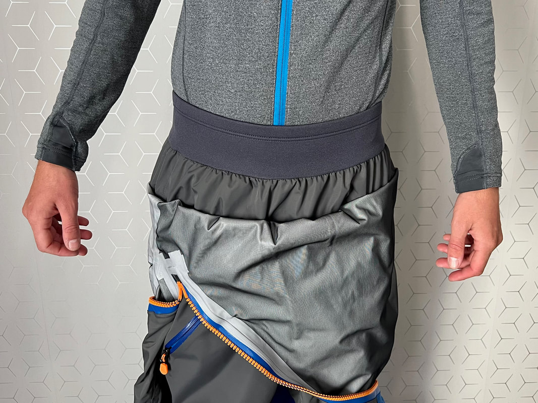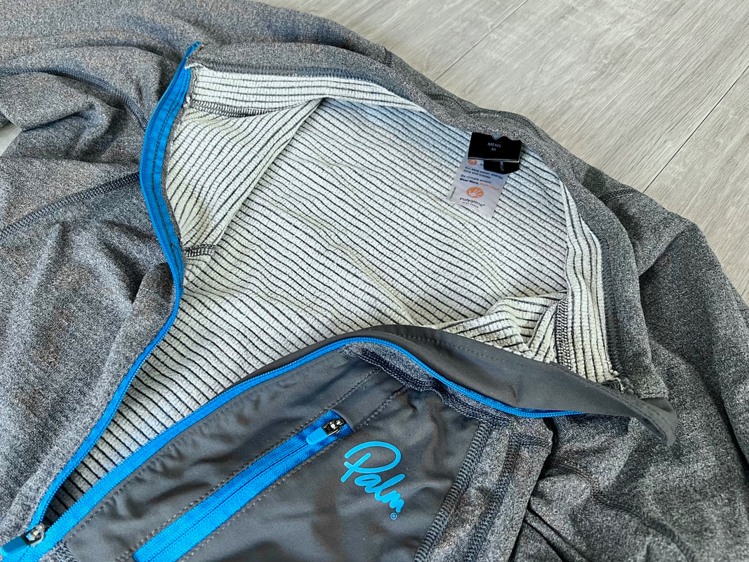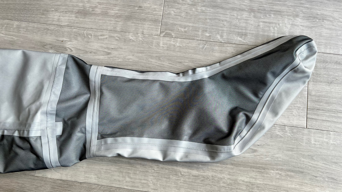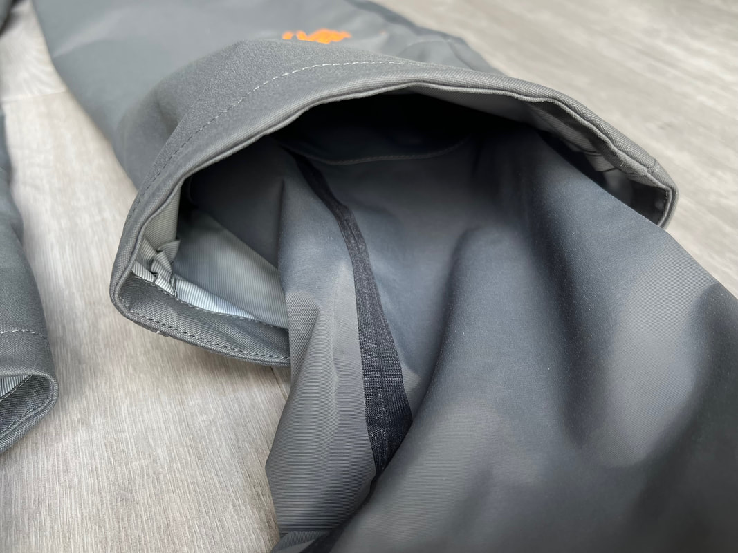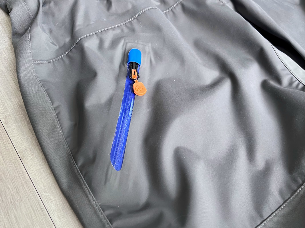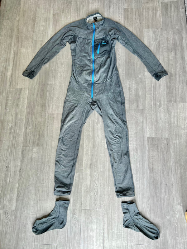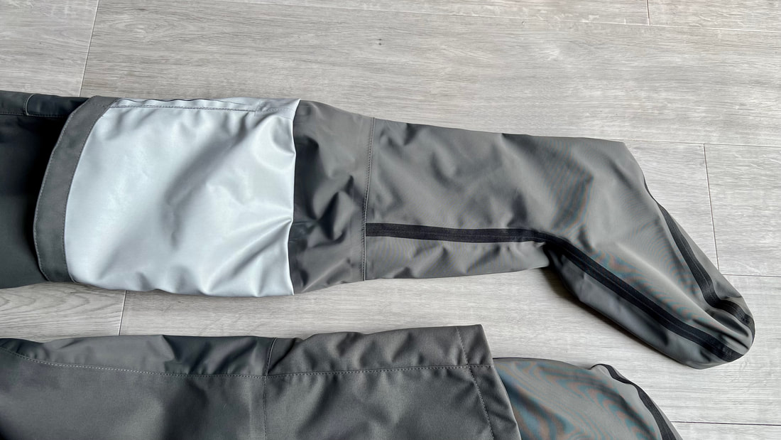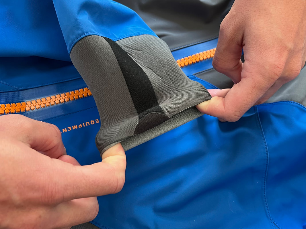 A close look at the Palm Rogen SuitWell, it's not yellow! Yellow fabric stains easily. Blue shows up stains less. Grey even less again. Blue and grey are good for kayak fishing. My red Bora Jacket doesn't get too bad either. There is a caveat here though. Blue and grey are not the most visible of colours so for the safety conscious out there, you may be thinking that the Rogen is not the most vibrant. Wearing a bright coloured buoyancy aid (PFD) would work well to enhance your visual visibility on the water. I'm happy with the colour though. The blue colour being across the top of the torso is well planned - this is the part of the suit that is most visible when you are wearing a PFD. Whilst the Rogen is stripped back to the essential features, you still get quality materials and construction. The suit is made from a 4-layer recycled material that is both waterproof and breathable. Breathable drysuits are good. It can get quite humid in a drysuit when you are hard at work paddling. Breathable material allows for water vapour to pass from the inside of the suit to the outside, and the waterproof nature of the fabric prevents water ingress at the same time. You wouldn't want to paddle in non-breathable drysuit! The Rogen features an Ultrastretch Neoprene neck seal. Neoprene is the material of choice for touring drysuit neck seals. Latex is the material of choice for whitewater drysuit seals. Neoprene tends to be less irritable against the skin than latex, and therefore more comfortable to wear for long days on the water. The neoprene has a smooth facing on the inside making it easier to slide the seal over your head. The seams are glued, taped and reinforced. That neck opening looks small though.... It lives up to it's name of Ultrastretch Neoprene though! This sits snug against the skin to stop water ingress. We find the same Ultrastretch Neoprene at the wrist seals. The Rogen has a front-zip entry by means of a diagonally-fitted YKK AquaSeal zip. It runs from the waist to the back of the shoulder. This is a flexible plastic zip that is easy enough to open and close without too much effort. Much easier than the shoulder zip on my Bora suit anyway, purely due to its location. The front zip makes it really easy to put this suit on and take it off. I like the contrasting zip colour, it adds a touch of style to the Rogen.... because we all want to look great on the water! Plastic zips are great, They require very little maintenance. Palm do supply a small tube of lubricant with the suit to periodically apply to the zipper to keep it running smooth, although making sure the whole suit is washed off with fresh water after each use is the best form of maintenance to keep things in good condition. There is a pocket located on the right hand thigh, accessed through a YKK AquaGuard zipper. A handy place to have a pocket. Many drysuits have pockets on the front torso and these are fairly inaccessible once you are wearing buoyancy aid. The thigh pocket offers plenty enough space to store a phone, camera or other small essentials. This is not a waterproof pocket though, splash-proof at best, so if you are keeping your phone in here, make sure it is a waterproof model or stored within an Aquapac waterproof phone case. There are three small laser cut holes in the bottom corner of the pocket that act as a drainage point. In the lower half of the Rogen we come to another important feature - reinforcement. Some areas of a drysuit will be subject to more wear and tear than the rest, in particular the seat, knees and lower legs. These tend to be areas that are likely to rub against the kayak the most and here we find reinforced 320D nylon panels to increase durability. The soles of the fabric socks are also reinforced. Fabric socks are great. Your feet stay dry beneath, meaning that you can wear a decent pair of thermal socks under the drysuit. This is a game changer for winter kayaking! Keeping your feet warm can be a challenge, and once they are cold it is difficult to warm them up again and it can then make for an uncomfortable time. At least with fabric socks, you can layer up and give them a chance of staying warm! Fabric socks are a weak point on any drysuit though - they can be subject to high wear and abrasion. It is important to wear a decent pair of shoes or boots over them to keep them protected against the worst of it. There is a caution note printed on the sole highlighting this too. My footwear of choice is my Palm Descender Boots or Palm Gradient Boots. Both a good durable footwear options with a tough grippy sole. Both have served me well for many years. The socks are double-taped for increased durability. This is where taping is glued either side of the seams. Not only does it toughen up these areas, it also further reduces the chance of water ingress. Over-cuffs at the ankles allow the Rogen to be worn with mid-height boots. The top of the cuff to the heel of the sock measures 35cm. A quick look inside the suit. There are a lot of panels that make up a drysuit. Each shaped and positioned to provide a good fit yet offer freedom to the arms and shoulders for unrestricted paddling. Each panel is sewn together and taped on the inside, with reinforced taping where needed. It is a quality construction and finish throughout. There is one feature here that I really like. The neoprene waist band. These are a feature on Palm drysuits and they definitely add to the comfort of wearing the suit. It prevents the lower half of the suit slumping down your body and makes for a much better overall fit. It's a dry suit not a Thermal Suit!A dry suit will keep you dry. A thermal suit will keep you warm. A thermal suit worn beneath a drysuit will keep you warm and dry. A drysuit will reduce the effects of wind chill and by design will prevent cold water from reaching your skin (with the exception of your hands and face), so overall will help in reducing the ability for the environment to make you cold. However, 
