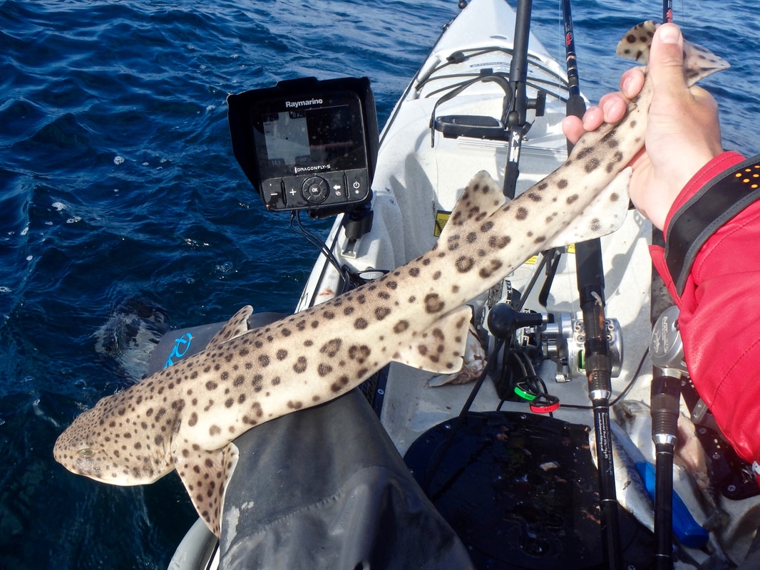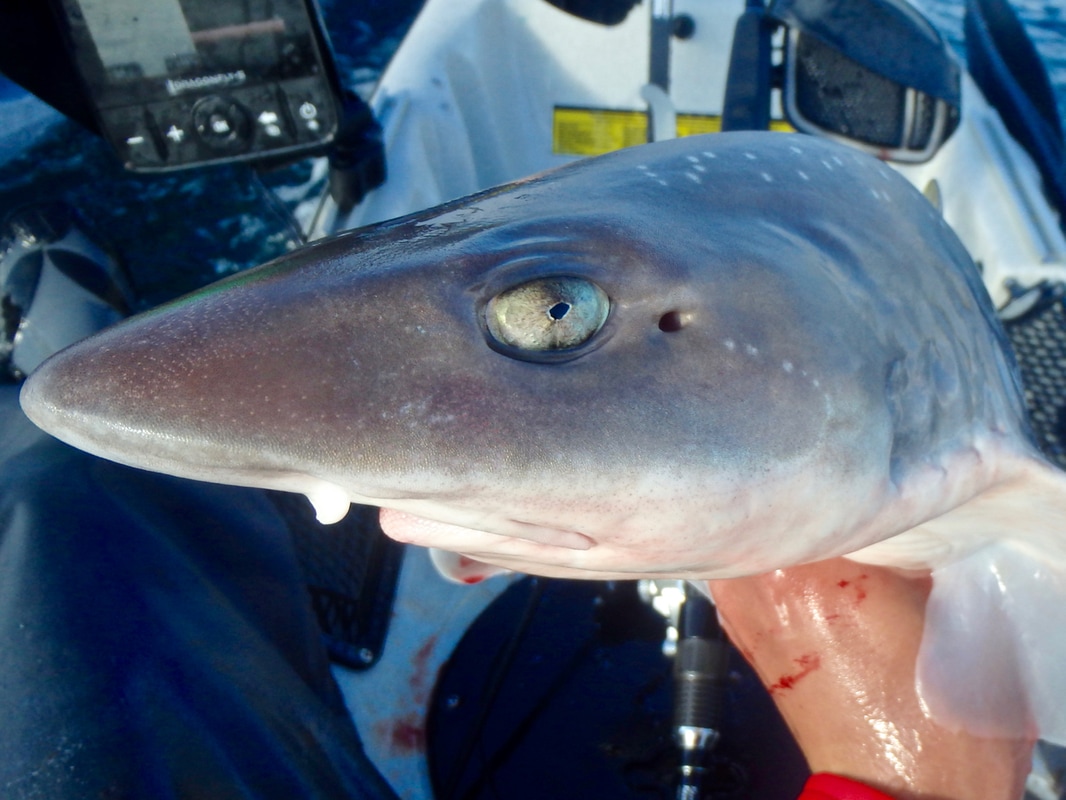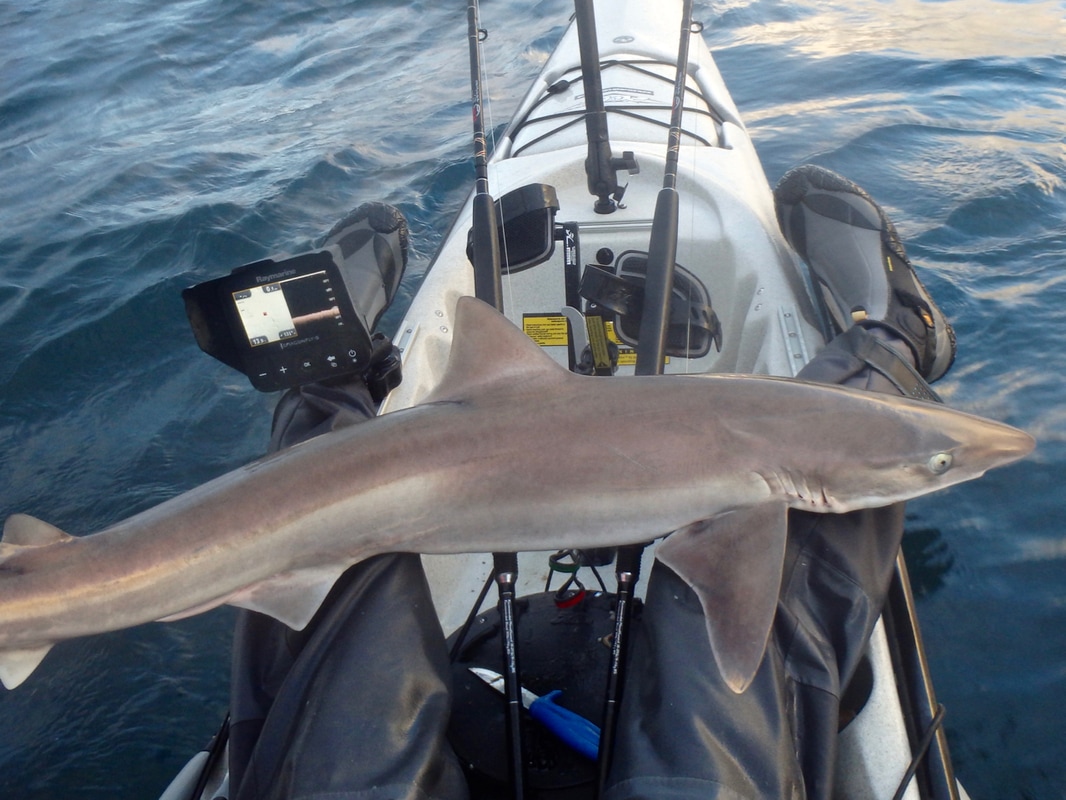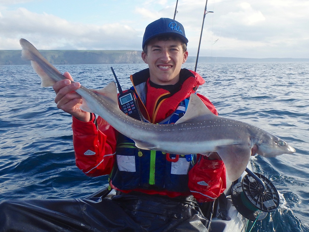 Summer traffic meant it was a good hour before we arrived up on the North Coast at the launch. Luckily everything was loaded strategically into the van so that we could set up in double quick time. We didn't have long. The rods were rigged too so within 20 minutes and a stank down to the beach we were ready to hit the water. The tide was on the way in so we started with a drift to see if we could find some fresh bait. Mackerel seemed absent and only a few Launce turned up. Still, a new species for me this year. The tide was really picking up and we were moving fast, too fast. We had only been drifting for 10 minutes or so but ended up nearly a mile up the coast. We turned to head back towards the ground i wanted to fish but after a few minutes it was apparent we weren't making much ground and i couldn't be bothered wasting 30 minutes to get back to where i wanted to be. Anchors down! You really feel how much tide there is when you anchor your kayak. I was using 14oz of lead just to hold bottom. A big mackerel bait went down. It didn't take long before the first bites arrived but they weren't the aggressive takes of a Tope.... Dogfish. They were just holding onto the bait too and letting go at the surface. Something bigger finally wedged the bait in its mouth. A Bull Huss with beautiful markings.... Another first of the species for this year. The mackerel bait was getting mauled by the dogs and Andrew was having similar luck. I was going to try something new. I had a second rod set up with a smaller hook and baited this with some old frozen Peeler i had found in the freezer. That bait wasn't getting any attention from the dogs..... good. It was down for about 30 minutes before something was having a good pull at it and it was soon hooked.... this wasn't a dogfish! It was giving a really good fight and as soon as it reached the surface i could see that it was a Smoothhound!! Awesome.... i'd never caught one in Cornwall before! And then all hell broke loose. The Tope rod went off. I managed to pull the Smoothhound into the kayak just in time to grab the Tope rod and hook the fish. It was a battle to keep the Smoothhound under control and play the Tope. I was in a right mess for a few minutes. The Smoothhound eventually calmed and stayed still allowing me to concentrate on playing the Tope. It was fighting well but i could tell it wasn't a big fish. It appeared below the kayak and then took off again taking line. It was quite fun in the pumping tide! On the second attempt i managed to keep it on a short leash until i could get a firm hold of its pectoral and pull it onto my lap. I had the smoothound pinned with my legs and the tope pinned with my hands.... it was all quite comical! Seeing as the Tope was the dangerous one i dealt with that first. Nicely jaw hooked so out it came and got a few quick photos before i sent it on its way. A fish of around 15-20lb and my first for this year. Result! But to be honest i was more chuffed with the other fish sat in my tank well. My first Smoothhound from Cornish waters, not a massive one but a sporting fish at around 5lb or so.... I was well happy with that and more happy to know i had found a mark that produces them.... or maybe it was a lone ranger? Plenty more dogs were hammering the Mackerel which was annoying because i didn't have much bait left. Between them a few Huss managed to get hooked with a better one of around 9lb putting up a decent fight. The wind was picking up and some seriously black storm clouds were hanging over the land. Luckily they were staying away from us but the wind was picking up and making it pretty choppy. The sun was getting low and the rays were streaming through the clouds casting an impressive light on the water. Something interesting then happened. As a dogfish arrived at the surface with its mouth clamped onto my bait, something else was chomping down on the tail of the dogfish.... a Tope! A large grey shape had appeared from nowhere and took a swipe at the Tope before swimming straight back down. The dogfish was whipped off the hook and the bait lowered straight back down to the bottom. 30 seconds later and the Tope grabbed the bait and headed off with it! I do love it when they power off stripping line from the reel! It put up a really good fight but again i could tell it wasn't a big fish. I soon had a Tope of around 15-20lb on my lap. Again cleanly jaw hooked which makes things easy with unhooking. That was fun. We were running out of time and the Tope seemed to be avoiding Andrews baits. He was pulling in plenty of dogfish and some nice Huss though. With the wind appearing to get worse the light dropping and the tide easing it was about time to head in before it got dark. Not before something had picked up my crab bait that had sat dormant for the last hour though! Another great scrap and a Smoothhound was soon zooming around the kayak. Another fish of around 5lb or so.... It was great to know that i had found a mark that produces these fish. I'll have to dedicate some sessions and try for a biggie! They must be out there somewhere. And that finished the session off nicely. A bit of a slog back to the launch but we made it before darkness set in. We'll be back again soon.....Light evenings rock!