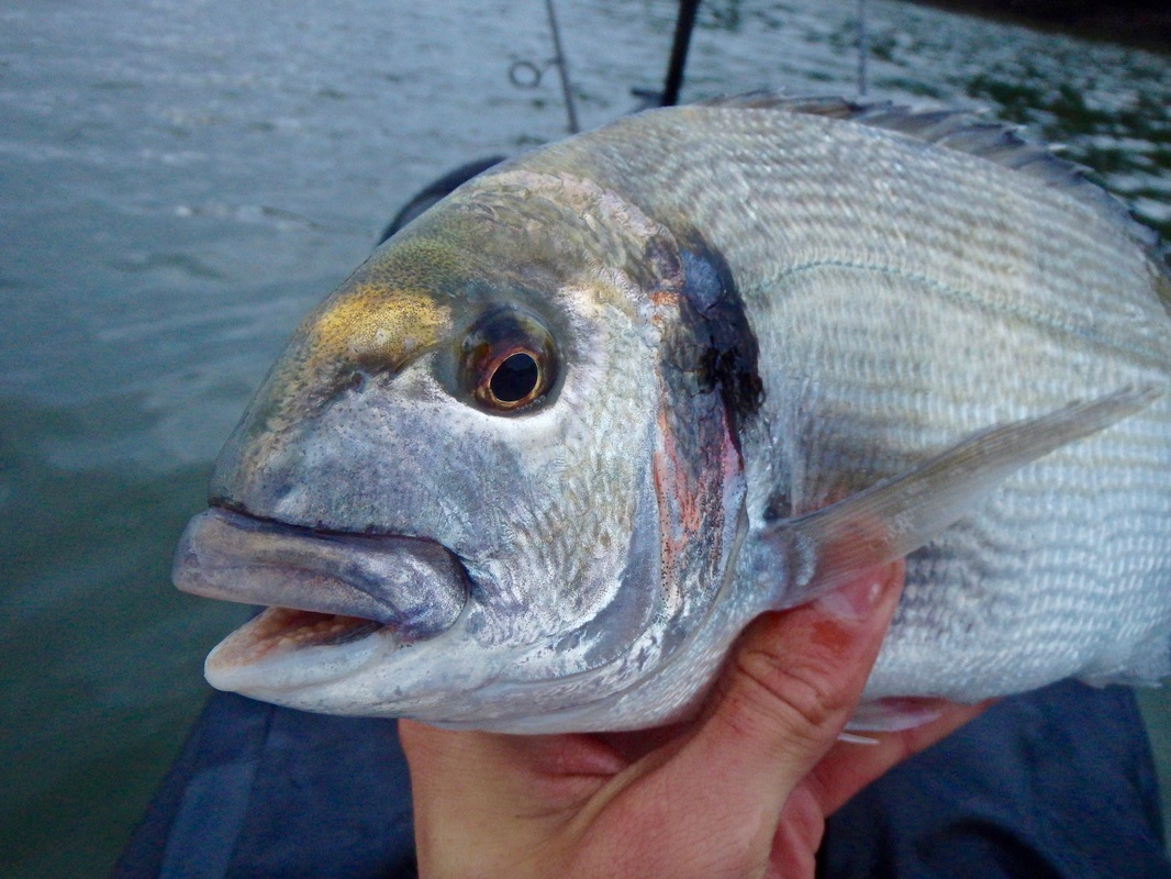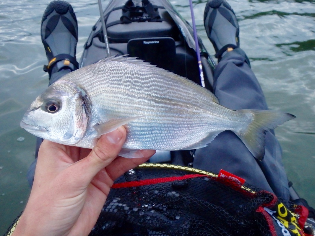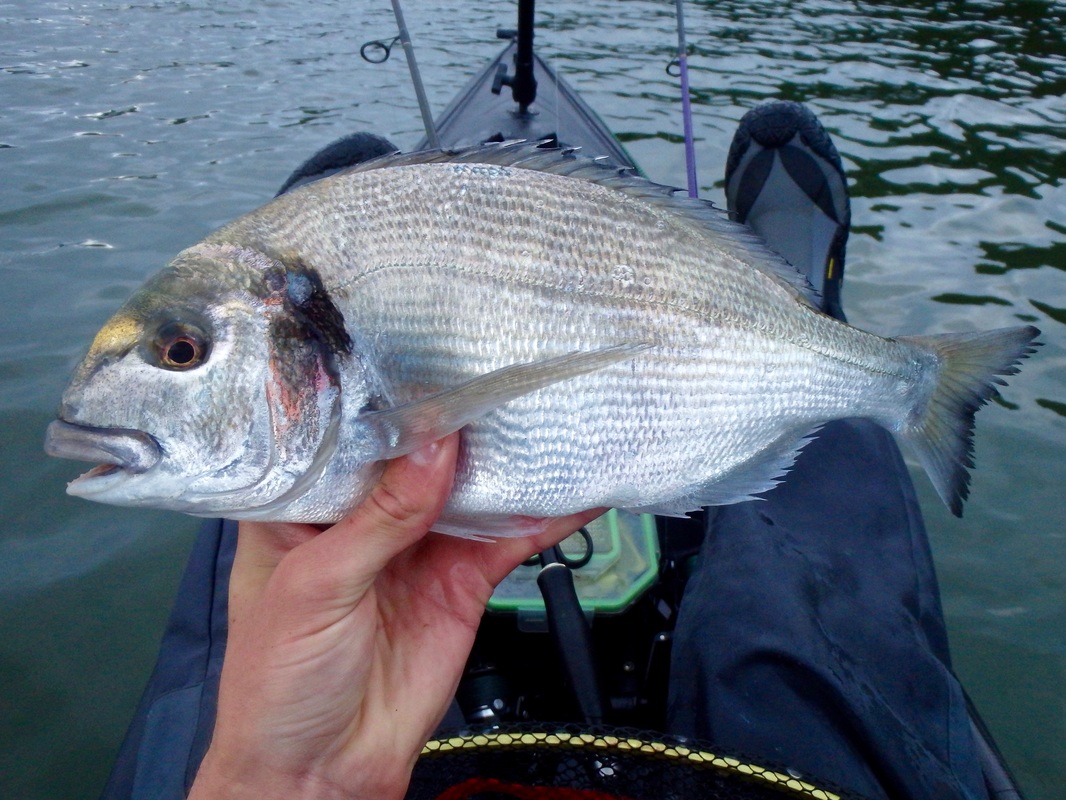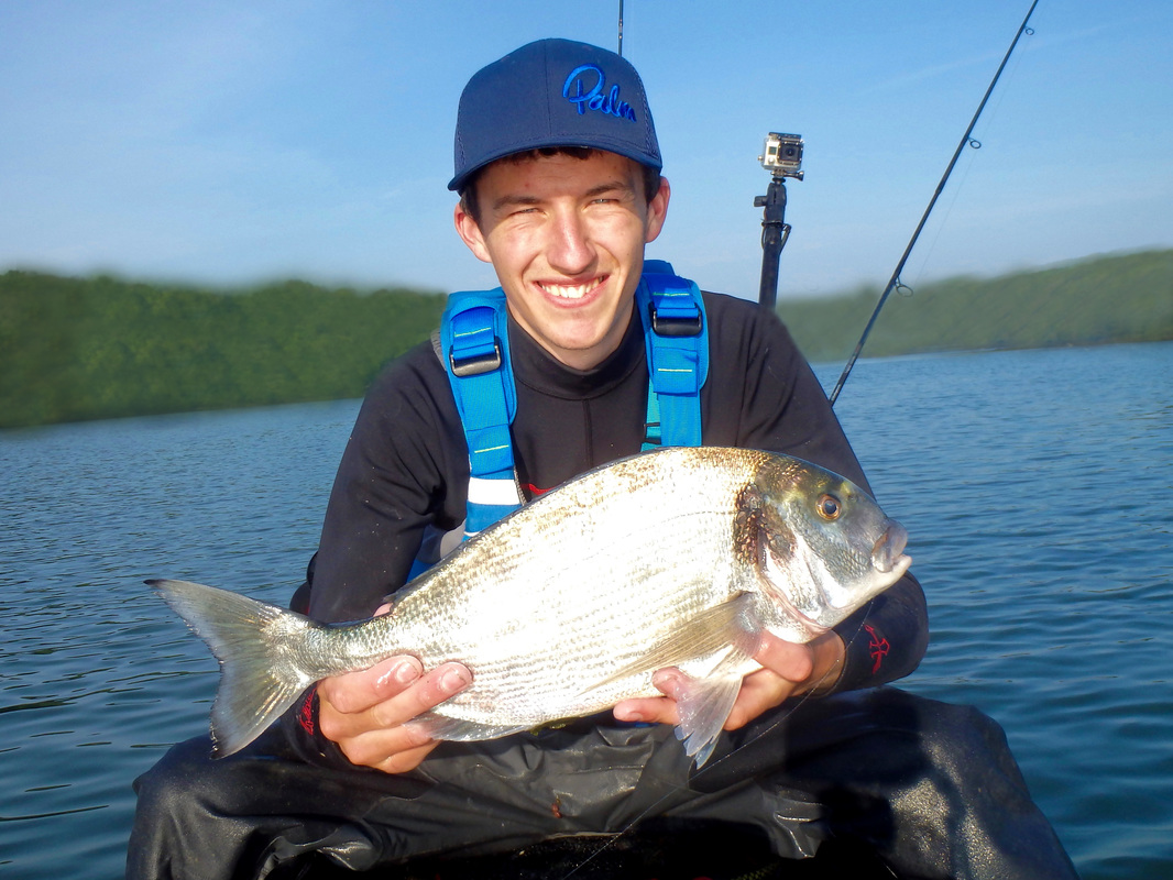 These handful of sessions took place earlier in the summer but i have only just got around to writing up about them.... I have caught several Gilthead Bream from the shore and have found that early morning tends to fish best, so early morning is when i would be putting in the effort....and by early i meant early! Gary would be joining me in a quest for a Gilthead. I knew an estuary mark that produces a few fish so we hatched a plan and began researching the venue and the target species. We would only be able to dedicate a session together every 2 weeks so we really wanted to put ourselves with having the best chance of catching. I won't be giving away any marks in this blog post - as you will read, i have spent time and effort at unearthly hours of the day to find a spot which produces these fish so its down to you to do the same and find your own Gilthead mark - trust me it is rewarding when you do! I also don't want to advertise any marks to illegal netters who i am sure scan the internet to find the areas that are holding these fish. Illegal netting is a continual problem in many South West estuaries. Often nets are removed full of bream, bass and mullet, including juveniles. If you ever come across an illegal net, or some form of illegal fishing, you can report this via the Environment Agency's free 24-hour hotline on 0800 80 70 60. A Quiet Start...We managed a couple of sessions in May involving getting on the water before sunrise. Getting up at 2:30am to go fishing is a struggle! The first session was very much an exploratory trip to suss out exactly where we would fish. We found a likely looking spot alongside a channel and set our anchors. Baits would include Peeler Crab, Lugworm and Razorfish presented on single hook running ledgers. We had a few tentative bites that session and a couple of runs but no hooks ups. Were they Bream or greedy school Bass? It was enough to ignite a fire and a want to return! Still, the sunrise was stunning and worth the early start. It is quite a magical time of day to be on the water, just as the river wildlife wakes up. The second sunrise session brought more success despite it still being another Bream blank. We both had a couple of steaming runs that were certainly Bream. In fact Gary hooked one and played it all the way to the kayak. A Gilthead was brought alongside the kayak for it to throw the hook at the last second! Despite the lost fish being frustrating, it was enough to really get us excited as we now knew that the Bream were at the mark! I couldn't get a hook up so a few tweaks to my rig and set up were made in preparation for session 3 to put me with a better chance of hooking into the searing runs as these fish grabbed the bait and swam off. We fished until late morning on the flooding tide which gave us chance to explore the upper reaches of the stunning tree-lined creeks once we got bored of the fishing. We found a few more interesting looking marks to try on another day. GoldGary couldn't join me for the next session but Karl who was down on holiday was more than happy to tag along. Another early start saw us fishing at sunrise. The atmosphere in the air was different today. The estuary waters were particularly calm....in fact it was like fishing in a lake. The previous sessions had been during blustery windy conditions. I was feeling positive. The sun was shining too and it was pleasantly warm. An hour or so into the session i had a powerful bite that slammed the rod tip over....a fish was on!! It shot off downtide stripping braid from the reel...a bit of pressure persuaded it to turn. it was going bezerk and swimming all over the place. I was using reasonably light rod (Ugly Stik Elite Spin 20-50g) and it was giving it a good work out. Soon enough a bright silver flash broke the surface....it was a Gilthead! A few more dives under the kayak before i could slip it into the landing net....result!! It had a fine set of nashers too - powerful crushing teeth for munching up shellfish and crustaceans. Not a place you want to be if your a crab! Karl did the honours with the camera. Not a monster but a respectable fish of 3lb 7oz which gave an electric fight.... That was me well happy. It was third session lucky. The fish was dispatched and kept for eating. Karl had a stonking run soon after but lost the fish after a short fight which was a shame. Things then went quiet so we went off for a paddle, his Kaskazi Dorado blending in well with the scenery... I pulled up on the waters edge to take some better photos of the bream. They really are quite stunning with a big black gill spot, orange gill colouring and their characteristic solid gold band between the eyes, from which they are named. I was really looking forward to the next session as i felt that i had finally cracked the mark. Bream Bonanza!Confidence was high for the next session. Gary had also been doing some more research. He had managed to locate section of the estuary that looked like it may hold fish. It was worth a try so another early start saw us launching at first light. The weather was again favourable so things were looking good. Anchored on the mark, the action started straight away. The baits were getting lots of attention and soon enough i was hooked into a fish. A good scrap saw a Gilthead of around 2lb in the kayak. These fish really do fight well for their size! Released to fight another day.... New baits and more bites. There was a good sized shoal of smaller fish about because the baits were getting stripped but hooking the fish was difficult. A couple of the culprits tripped up and took the hook. The next two fish were small but still very welcome... The next fish was quite unexpected. I assumed i had another small Gilthead on the line but a Gilthead it was not.... it was a small Black Bream! Despite its small size it was a nice surprise and my first kayak caught Black bream from Cornwall. Despite plenty of bites coming my way, Gary was struggling to get bites an