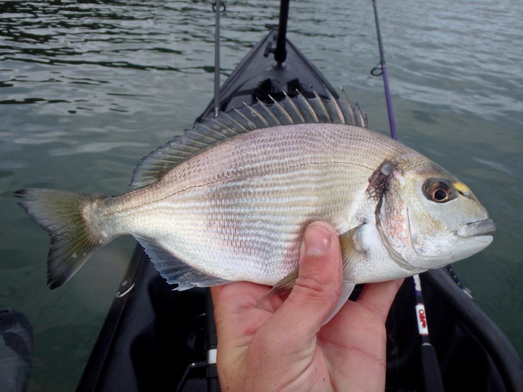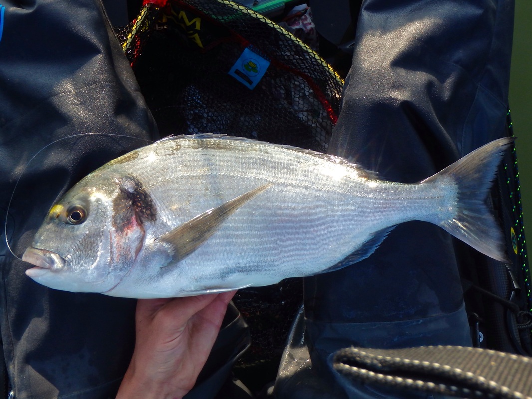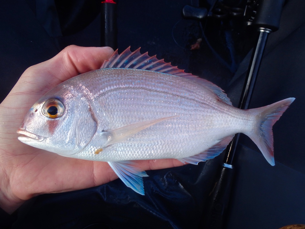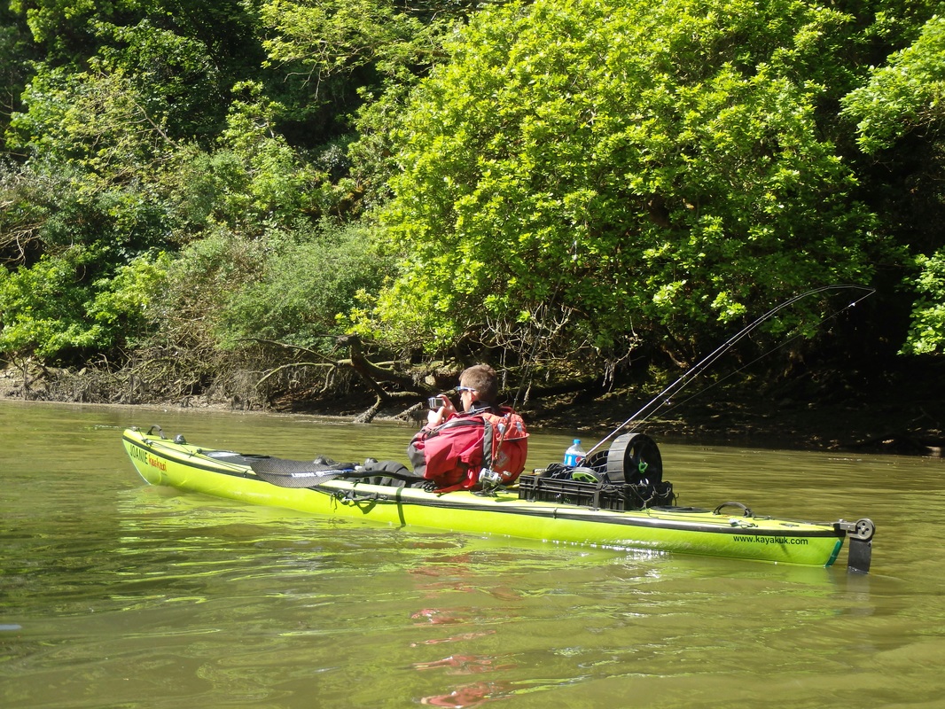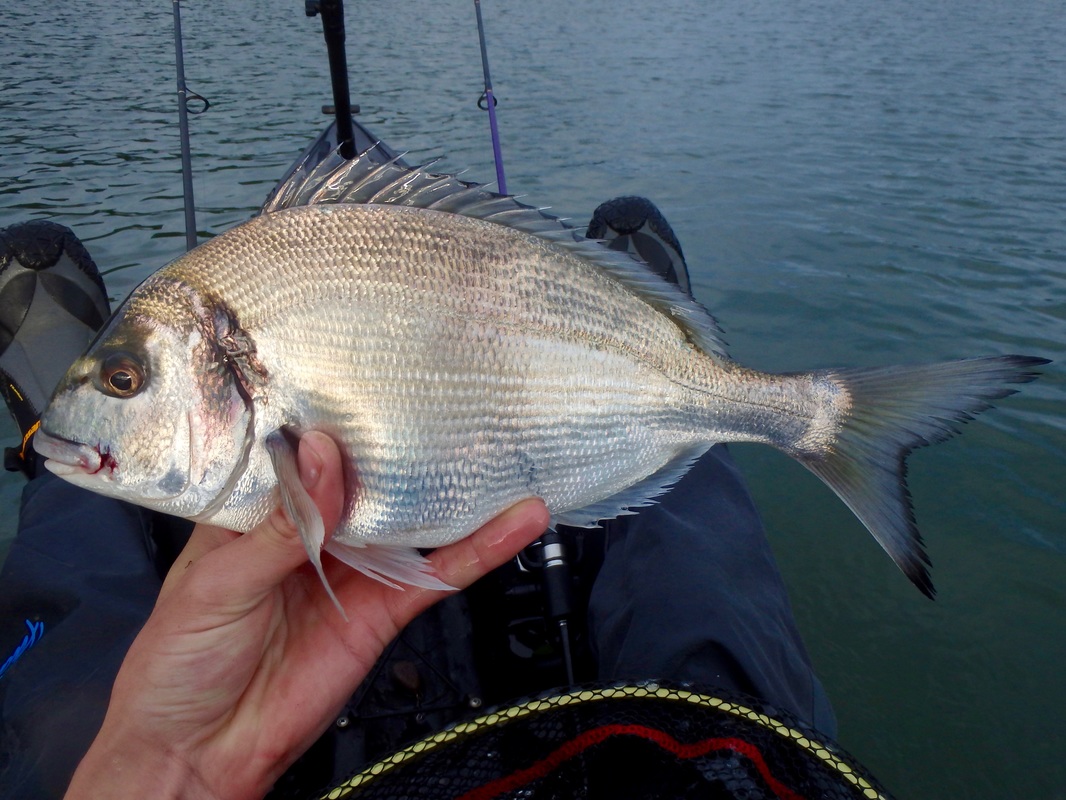 These handful of sessions took place earlier in the summer but i have only just got around to writing up about them.... I have caught several Gilthead Bream from the shore and have found that early morning tends to fish best, so early morning is when i would be putting in the effort....and by early i meant early! Gary would be joining me in a quest for a Gilthead. I knew an estuary mark that produces a few fish so we hatched a plan and began researching the venue and the target species. We would only be able to dedicate a session together every 2 weeks so we really wanted to put ourselves with having the best chance of catching. I won't be giving away any marks in this blog post - as you will read, i have spent time and effort at unearthly hours of the day to find a spot which produces these fish so its down to you to do the same and find your own Gilthead mark - trust me it is rewarding when you do! I also don't want to advertise any marks to illegal netters who i am sure scan the internet to find the areas that are holding these fish. Illegal netting is a continual problem in many South West estuaries. Often nets are removed full of bream, bass and mullet, including juveniles. If you ever come across an illegal net, or some form of illegal fishing, you can report this via the Environment Agency's free 24-hour hotline on 0800 80 70 60. A Quiet Start...We managed a couple of sessions in May involving getting on the water before sunrise. Getting up at 2:30am to go fishing is a struggle! The first session was very much an exploratory trip to suss out exactly where we would fish. We found a likely looking spot alongside a channel and set our anchors. Baits would include Peeler Crab, Lugworm and Razorfish presented on single hook running ledgers. We had a few tentative bites that session and a couple of runs but no hooks ups. Were they Bream or greedy school Bass? It was enough to ignite a fire and a want to return! Still, the sunrise was stunning and worth the early start. It is quite a magical time of day to be on the water, just as the river wildlife wakes up. The second sunrise session brought more success despite it still being another Bream blank. We both had a couple of steaming runs that were certainly Bream. In fact Gary hooked one and played it all the way to the kayak. A Gilthead was brought alongside the kayak for it to throw the hook at the last second! Despite the lost fish being frustrating, it was enough to really get us excited as we now knew that the Bream were at the mark! I couldn't get a hook up so a few tweaks to my rig and set up were made in preparation for session 3 to put me with a better chance of hooking into the searing runs as these fish grabbed the bait and swam off. We fished until late morning on the flooding tide which gave us chance to explore the upper reaches of the stunning tree-lined creeks once we got bored of the fishing. We found a few more interesting looking marks to try on another day. GoldGary couldn't join me for the next session but Karl who was down on holiday was more than happy to tag along. Another early start saw us fishing at sunrise. The atmosphere in the air was different today. The estuary waters were particularly calm....in fact it was like fishing in a lake. The previous sessions had been during blustery windy conditions. I was feeling positive. The sun was shining too and it was pleasantly warm. An hour or so into the session i had a powerful bite that slammed the rod tip over....a fish was on!! It shot off downtide stripping braid from the reel...a bit of pressure persuaded it to turn. it was going bezerk and swimming all over the place. I was using reasonably light rod (Ugly Stik Elite Spin 20-50g) and it was giving it a good work out. Soon enough a bright silver flash broke the surface....it was a Gilthead! A few more dives under the kayak before i could slip it into the landing net....result!! It had a fine set of nashers too - powerful crushing teeth for munching up shellfish and crustaceans. Not a place you want to be if your a crab! Karl did the honours with the camera. Not a monster but a respectable fish of 3lb 7oz which gave an electric fight.... That was me well happy. It was third session lucky. The fish was dispatched and kept for eating. Karl had a stonking run soon after but lost the fish after a short fight which was a shame. Things then went quiet so we went off for a paddle, his Kaskazi Dorado blending in well with the scenery... I pulled up on the waters edge to take some better photos of the bream. They really are quite stunning with a big black gill spot, orange gill colouring and their characteristic solid gold band between the eyes, from which they are named. I was really looking forward to the next session as i felt that i had finally cracked the mark. Bream Bonanza!Confidence was high for the next session. Gary had also been doing some more research. He had managed to locate section of the estuary that looked like it may hold fish. It was worth a try so another early start saw us launching at first light. The weather was again favourable so things were looking good. Anchored on the mark, the action started straight away. The baits were getting lots of attention and soon enough i was hooked into a fish. A good scrap saw a Gilthead of around 2lb in the kayak. These fish really do fight well for their size! Released to fight another day.... New baits and more bites. There was a good sized shoal of smaller fish about because the baits were getting stripped but hooking the fish was difficult. A couple of the culprits tripped up and took the hook. The next two fish were small but still very welcome... The next fish was quite unexpected. I assumed i had another small Gilthead on the line but a Gilthead it was not.... it was a small Black Bream! Despite its small size it was a nice surprise and my first kayak caught Black bream from Cornwall. Despite plenty of bites coming my way, Gary was struggling to get bites an