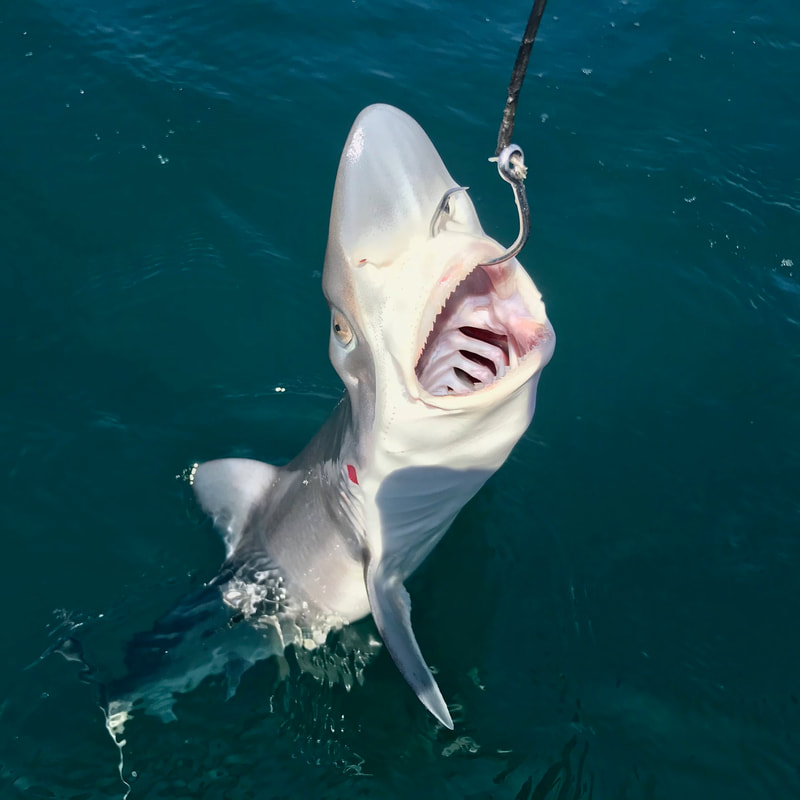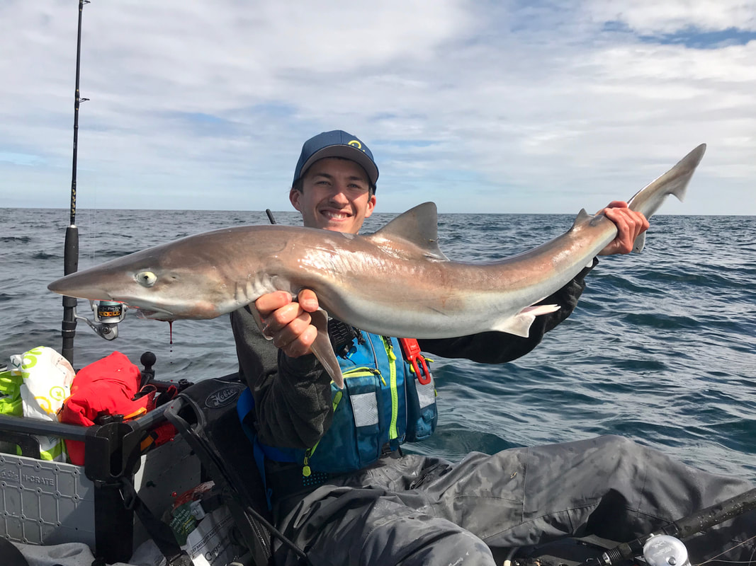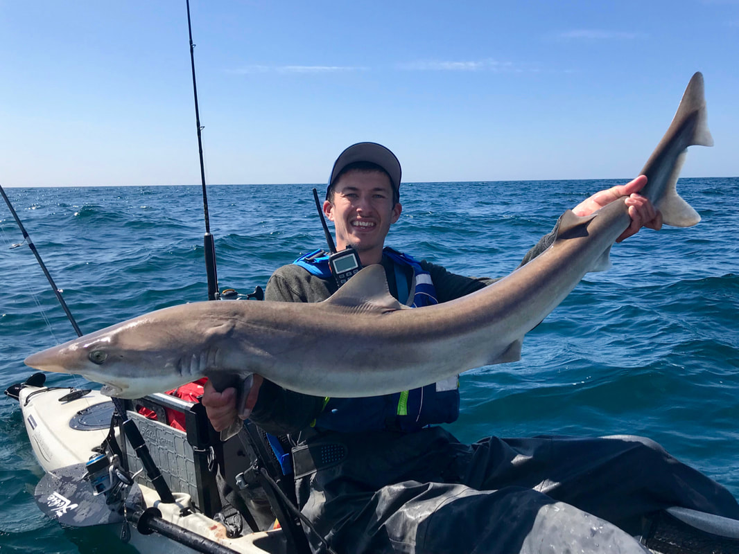 I have had several good seasons fishing for Tope since first finding some productive marks on the North Coast of Cornwall a few years ago. They seem almost absent from the South coast, with just the occasional fish caught yet the North Coast can see good numbers inshore during the summer season. The average stamp of fish is between 10-25lb with a good fish being a 25lb+ fish. Very few get caught above 40lb. These may be average fish compared to other areas but one thing is quite apparent in that all the fish down here seem to be males. The bigger female fish appear to be very few and far between. The fish seem turn up from May onwards and I decided upon a tester session one evening after work at the end of the month. A Lack of MackerelTope are towards the top of the food chain in our inshore waters, feeding upon schooling baitfish, flatfish, squid and more. I have found one of the most effective baits to be a fresh Mackerel flapper, or a live joey. The perfect bait.... if you can catch them! Whilst I enjoyed some excellent Mackerel fishing over winter, by the start of April they had completely moved out of inshore waters and have yet to return some 3 months later. It amazes me how they just disappear! Frozen mackerel baits do work but I just don’t have the confidence in them like I do with freshly caught bait. I headed out with Andrew from Cornwall Canoes one evening after work. The light evenings give us about 3-4 hours fishing time so we have to time sessions right with the best of the tide to stand any chance of finding fish. We half-heartedly fished for bait knowing full well they just weren’t there. Persisting with big frozen baits we found the usual obligatory dogfish and a few Bull Huss but the toothy target failed to show. Perhaps they just hadn’t moved in yet with the lack of food fish. At least the sunset made up for it... A Positive SignA couple of weeks later and we moved onto the next set of Spring tides. Reports from North coast charter boats showed that a few Tope were starting to be caught so it was all eyes on the forecast looking for some settled weather. I had a mid-week day off work and with a reasonable forecast I rallied the troops, in the form of friend Ed Jane, for a day on the water. We planned to fish the bottom half of the Ebb down to low and then the full Flood back up to high, giving us the best of the tidal range in the hope that the Tope would show at some point during the day. We launched mid morning on a blissfully warm day. The plan was to drop baits around reefy ground and move around every so often in the hope of finding the fish. I would be fishing with my trusty Tope Tamer combo in the form of a 12-20lb Ugly Stik Braid rod paired with an Avet MX5.8 loaded with 40lb J-Braid. Down went a sliding ledger rig with a 6ft trace consisting of 5ft of 80lb mono and 1ft of 100lb coated wire. The hook of choice is a 11/0 Mustad circle hook. I switched to circles a few years ago and have found a much better hook-up rate compared to J-hooks and the benefit of an almost 100% jaw hook-up rate. This makes for much easier unhooking on a kayak, and the greatly reduced chance of deep hooking is better for the fish too. Finding the FishThe first mark in 60ft of water seemed barren so we moved down the coast to a different patch of ground. First drop and something was savagely attacking my bait. It soon was powering off. I tightened up and allowed the circle hook to set – no strike needed. All hell breaks loose as the fish realises it is hooked. Violent thrashing gives you a few seconds grace before the fish steams off on a run. Seeing braid peel off the reel really gets you going! There was a healthy bend in the rod as I put the brakes on the fish and turned it into the tide. A few minutes of tussling and a grey shape lurked beneath the kayak. This is where the real fun begins. The Tope is on the surface beside the kayak and all of a sudden those teeth feel very close. There’s no real danger if you are confident in controlling the fish on the trace and when handling the fish. It’s a case of waiting for the opportune to pull the fish onto the kayak. Trace in one hand, grabbing one of the pectoral fins with the other and you can control the fish as you slide it onto your lap. You can then hold the fish down as you unhook the fish, with a quick photo or two before release. At any point the fish can be pushed back into the water if it gets a bit too feisty! It was an average sized fish of around 15-20lb. A good start to the session. Some more time passed without much action. Another move to a likely looking ledge in 80ft resulted in another bite. Another good scrap and it was a similar sized fish to the first. Slack WaterThe tide was slowing up and everything went a little still. Ed was still hoping for his first tope so we headed a little way offshore to try some new ground. Opting to drift over low we tickled bait along the clean bottom but apart from a few dogfish little else was showing. I wound a bait up and had a strange bite in mid water. As the bait arrived at the surface a small Tope was following close behind but was so small it had no chance of fitting a whole flapper into it’s mouth. A quick switch to a sliver and it homed straight in and took the bait. Tope number 3 was quickly in the kayak... all 3lbs of it! It’s good to see the small ones about though. Prime TimeA good 2 or 3 hours then went by without any real action. We headed to one of my favourite spots and dropped anchors. The tide was now noticeably flowing past the kayaks and things just felt fishy. The baits were getting attacked within minutes on the bottom and a steady stream of dogfish and bull huss were being brought up. Eventually I hooked into a rod bender that headed up-tide and turned me on the anchor. A few short runs and I persuaded it towards the surface. It was another fish of around 15-20lb. Ed was getting a little perplexed as to why I was catching and he wasn’t. He was 