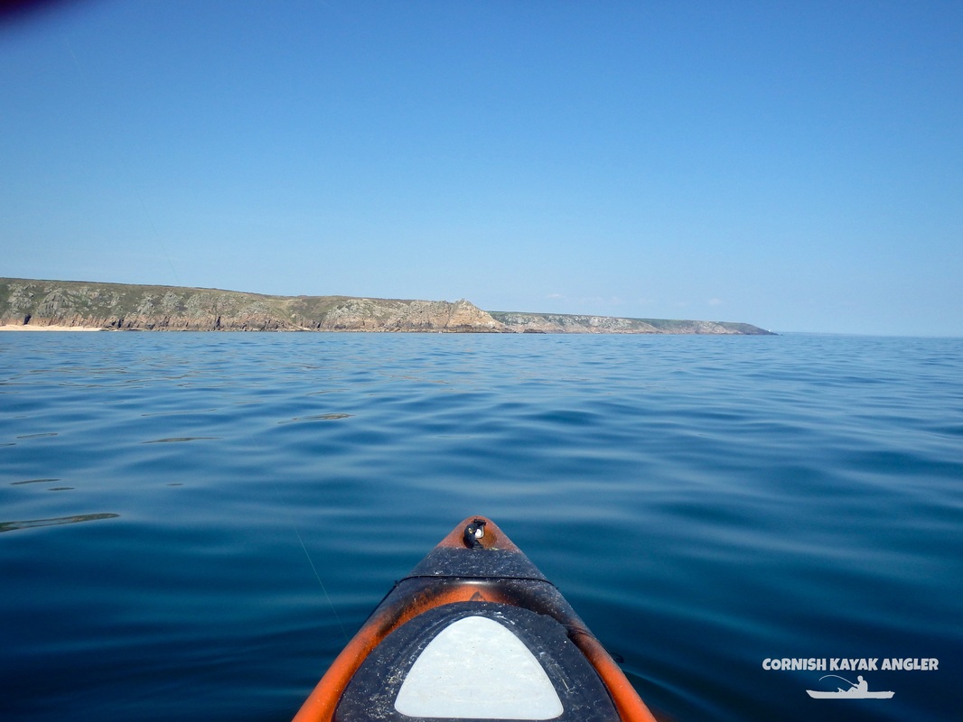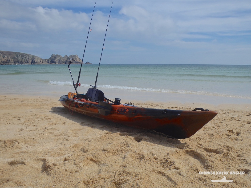 A very picturesque beach and popular with beach-goers in the summer. Access to the beach is difficult and requires a 200m walk along a rough path, down a steep sand dune and across the beach to the water. It is possible with a kayak trolley and 2 determined people and is easier with smaller, lighter kayaks as opposed to fully laden heavy fishing kayaks. Strong tidal flows can be found out past the limit of Logan Rock, flowing back towards Lands End on Spring tides, but conditions are much more benign staying on the inside of Logan Rock. A stunning place to paddle with views of the Minack Theatre and Pedn Vounder beach.