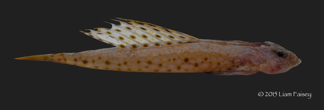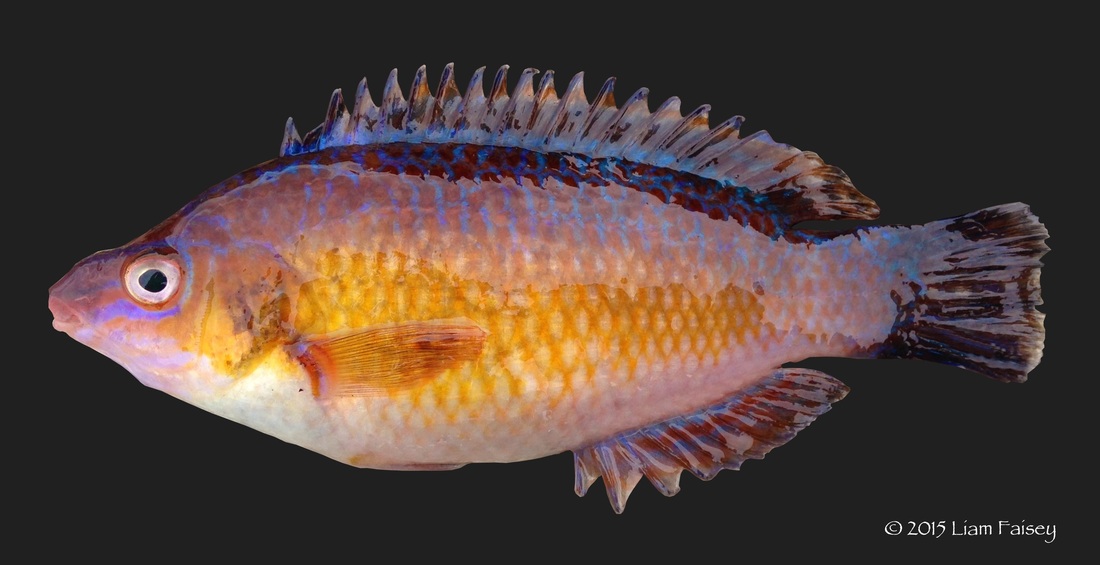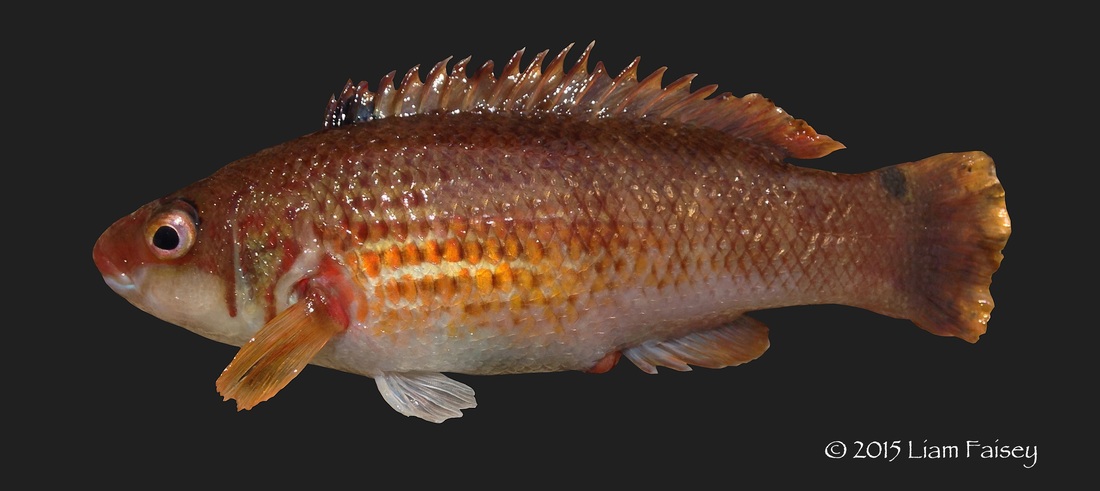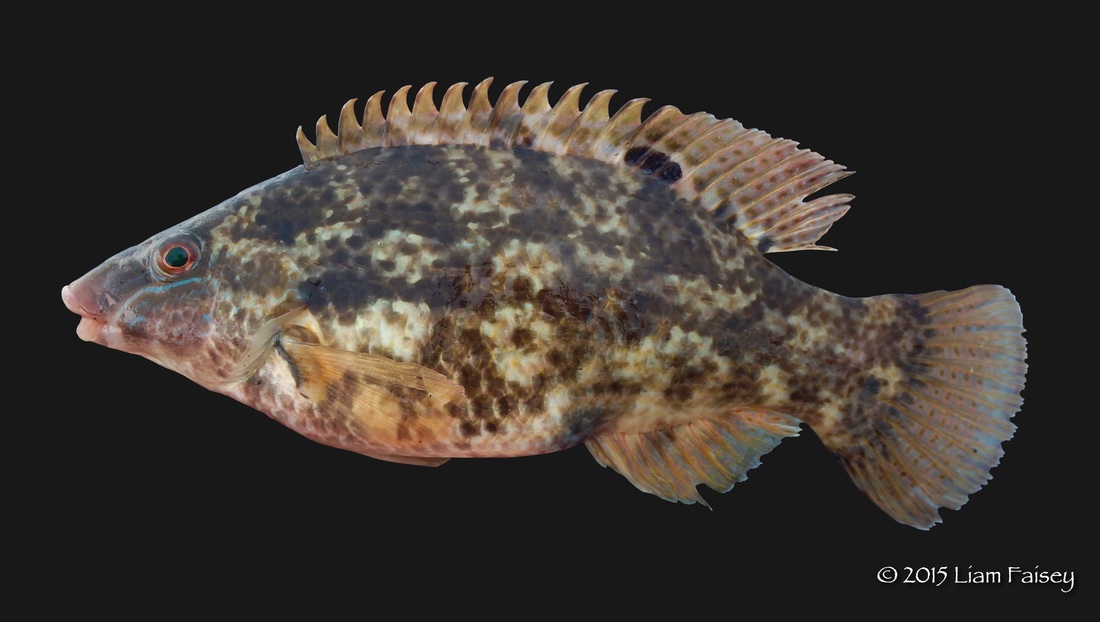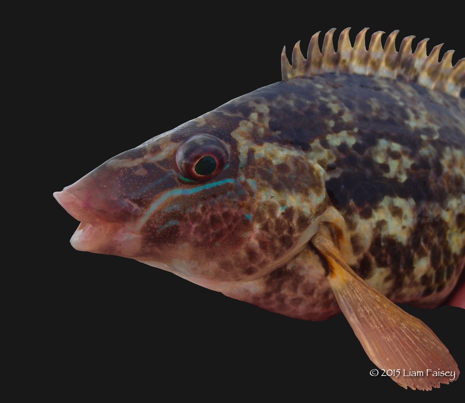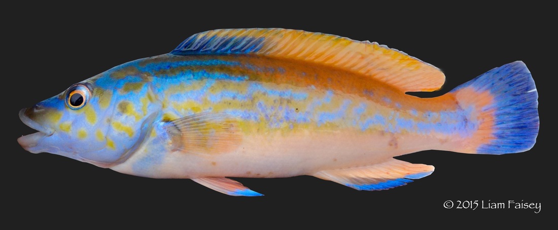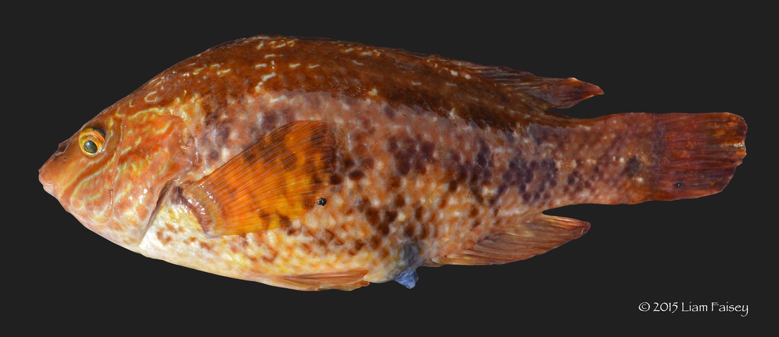 Female Baillons Wrasse look similar to a female Corkwing Wrasse. Baillions Wrasse have a dark spot about 2/3rds of the way along the dorsal fin and at the base of the tail - just visible in this specimen. The facial markings are different to that of a female Corkwing and the urogenital papilla (the egg laying part) in a Baillons is black/grey whereas it is blue/purple on a Corkwing. Male Baillons wrasse have a different colouration to females with pink/red fins and turquoise and pink facial markings and spots.