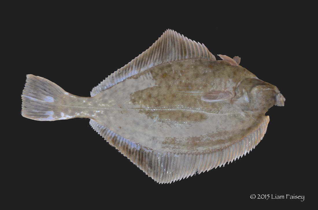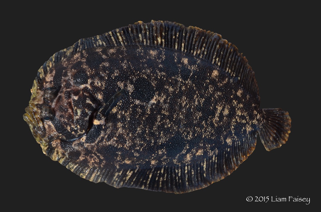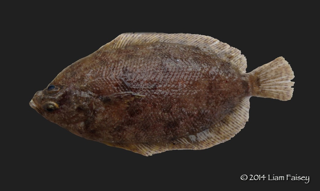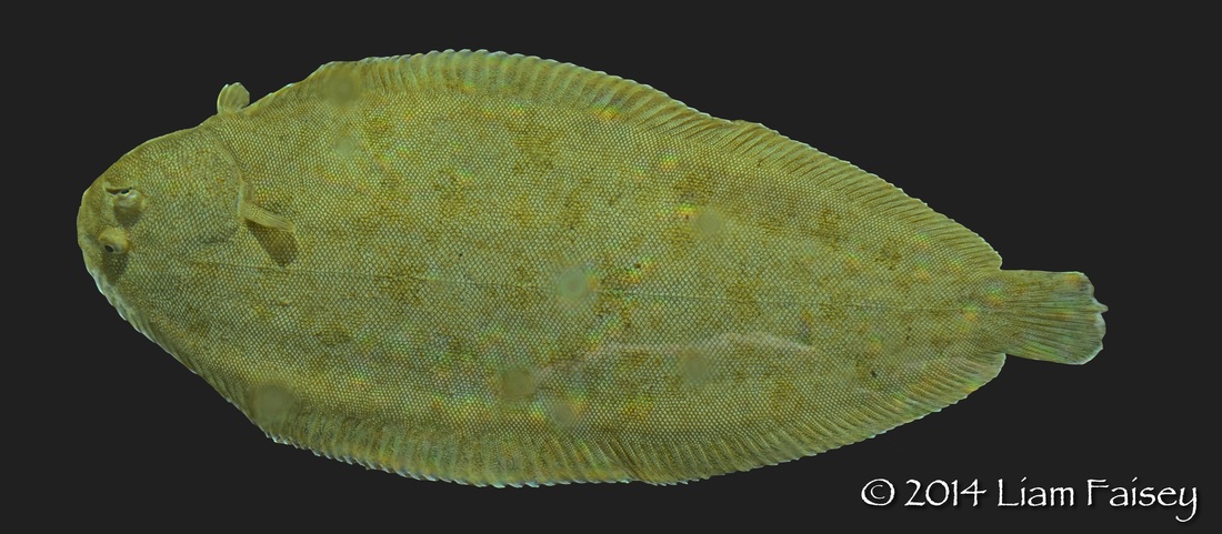 Flounder are usually right eyed but some individuals can be left eyed as shown by the photo on the left hand side - i have always called them 'Flip Flounder'. Flounders are usually pale white on the underside but some individuals can have brown coloration on both sides. The centre photo and right side photos show a 'double-sided' Flounder. Flounders can often have bright orange or red spots on the eyed side and this can often cause them to be wrongly identified as Plaice but Flounder can be identified by the rough tubercles located along the lateral line which are not present in Plaice.