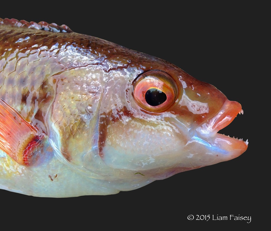 Ballan wrasse are usually the target of a 'wrasse fishing trip' and give an excellent account for themselves once hooked. I get just as much pleasure from targeting the smaller species on light gear and as i do from a powerful ballan and it can be quiet rewarding when you catch one of the rarer species. Wrasse species often get misidentified and have heard/seen small Ballans being labelled as Corkwings and vice versa, Rock cooks being identified as Corkwings and Female Cuckoos being called Goldsinneys. Ballans can show huge variation in their coloration ranging from bright green, mottled red/cream, orange to dark brown and pretty much everything in between. The photos below show the clear differences between the coloration of each wrasse species - you can ID the UK species of wrasse from the coloration, shape and features of their heads alone although more robust methods of identification can be used. |