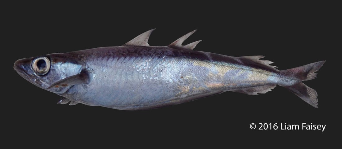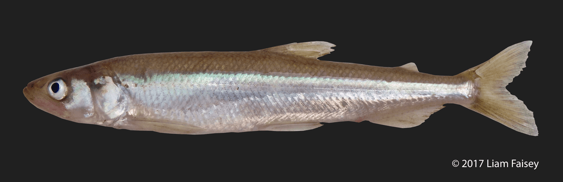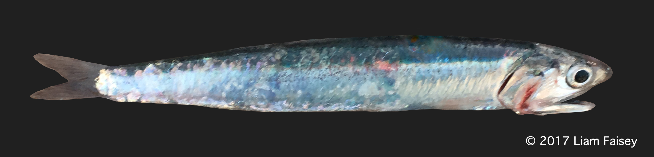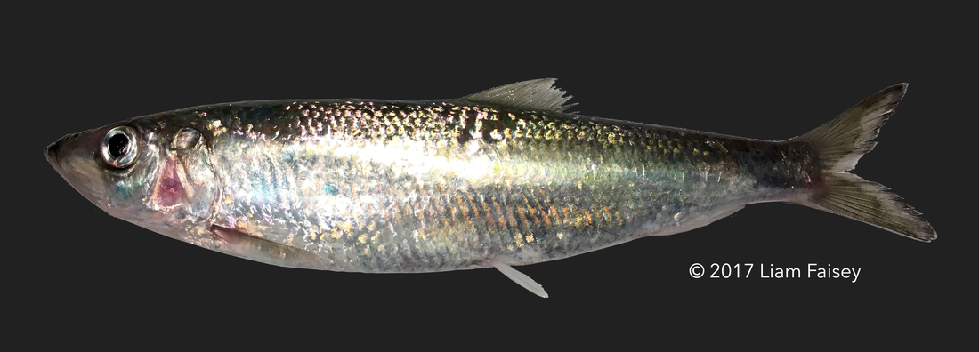 Sprats and small Herring are very difficult to tell apart. Sprats have spiked scales along their ventral keel - Herring do not. The spiked scales are just visible in this photo. Run your finger along its belly - if it feels spiky its a Sprat. In relation to the dorsal fin, the pelvic fins are set further back on a Herring compared to that of a Sprat, which sits closer inline with the leading edge of the dorsal fin. |